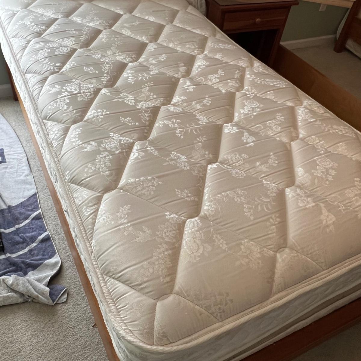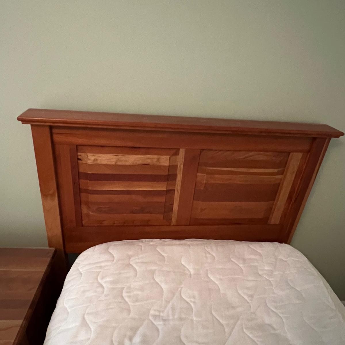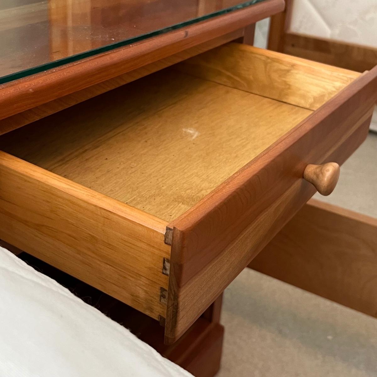 A pair of matching wooden twin beds. The headboards measure 44” x 4” x 47”H, from headboard to foot of bed is 80” long. Mattresses with pads and box springs are available to the winning bidder if desired. A matching end table has one dovetailed drawer with an open cabinet beneath it and the top has a removable glass protective top; measures 21” x 18” x 26”H.