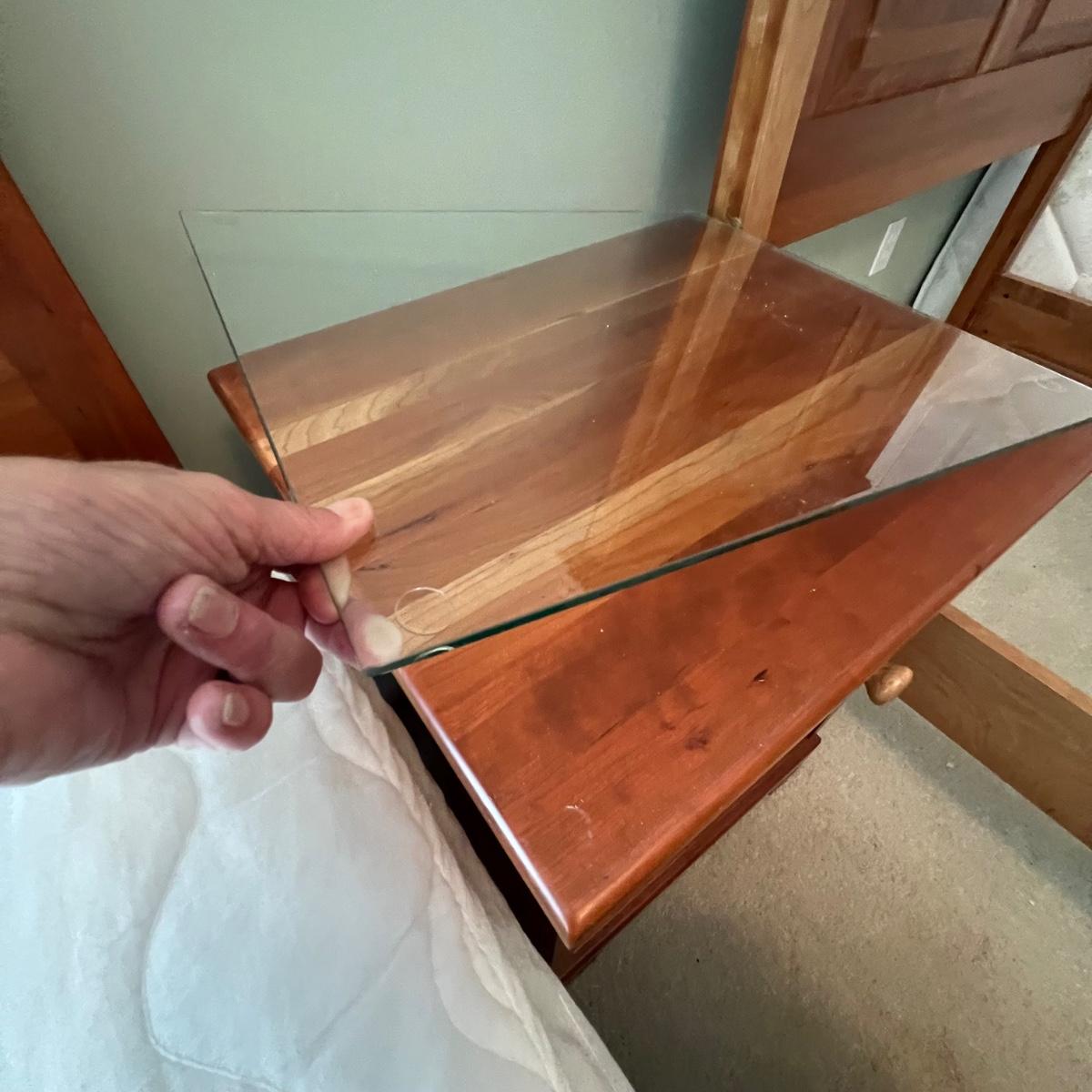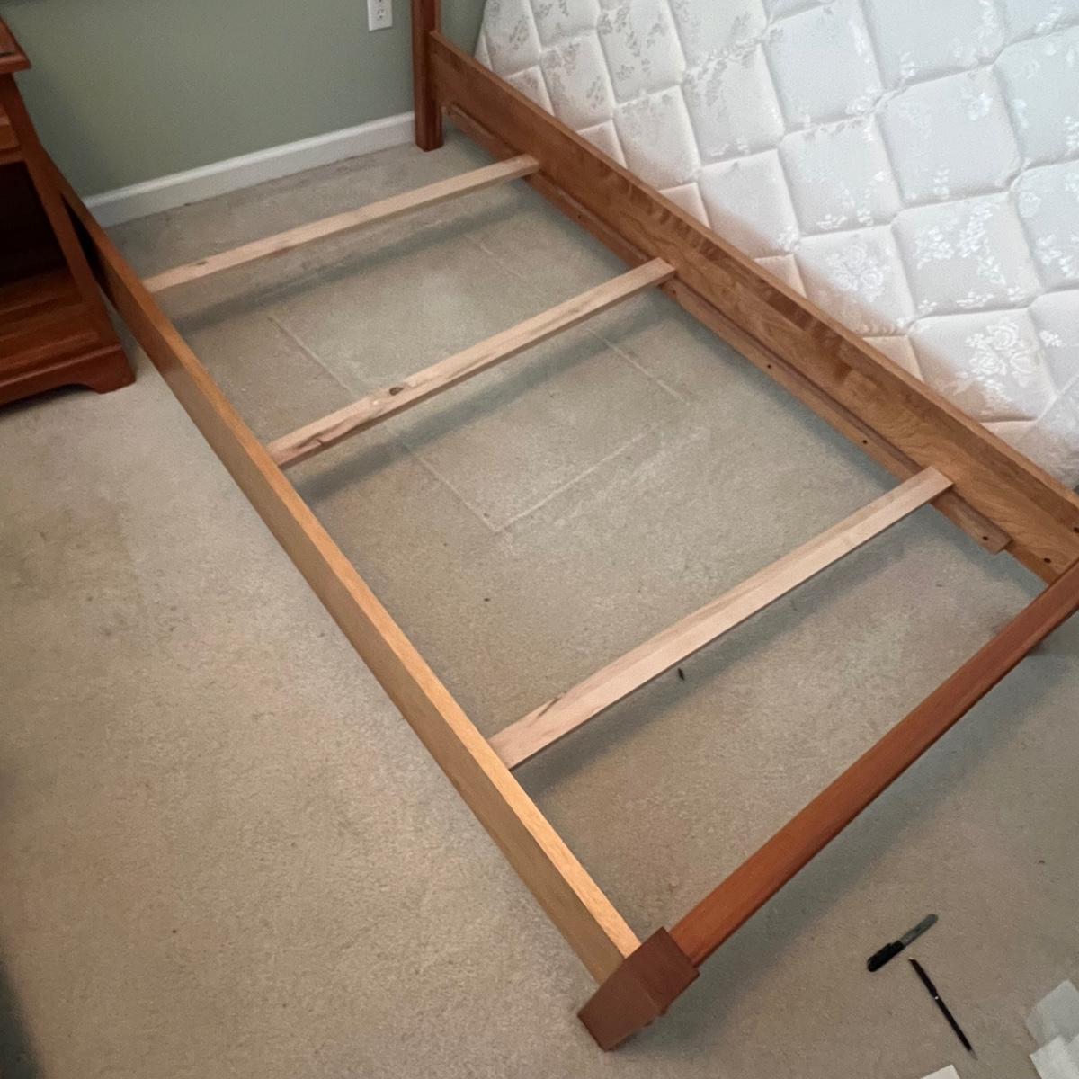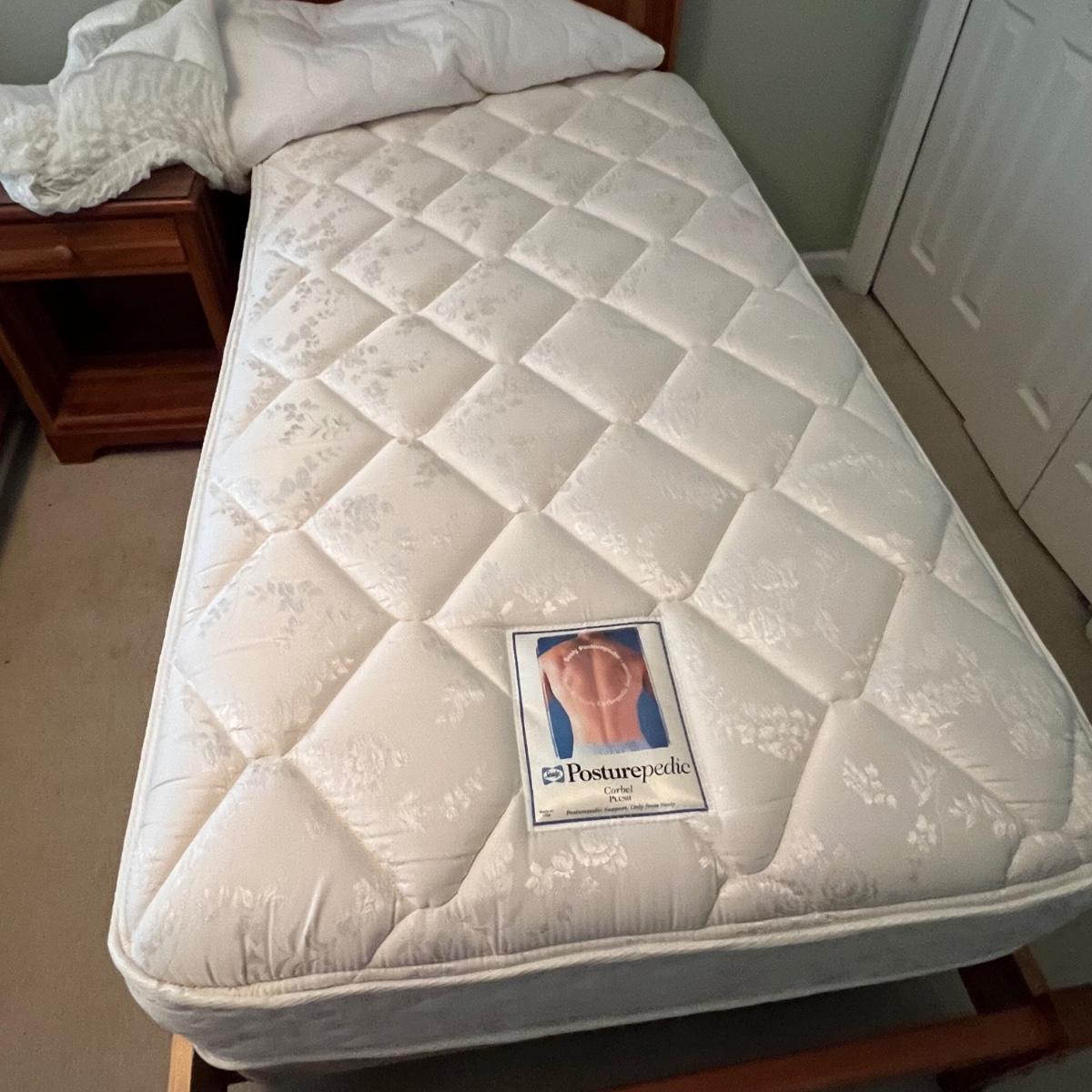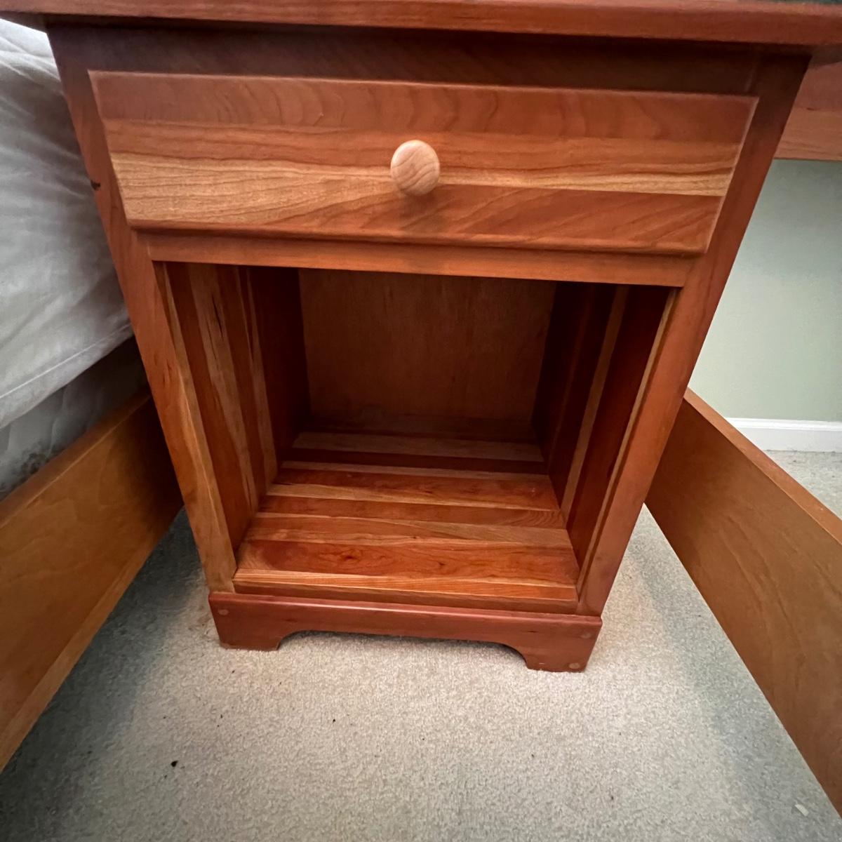 A pair of matching wooden twin beds. The headboards measure 44” x 4” x 47”H, from headboard to foot of bed is 80” long. Mattresses with pads and box springs are available to the winning bidder if desired. A matching end table has one dovetailed drawer with an open cabinet beneath it and the top has a removable glass protective top; measures 21” x 18” x 26”H.