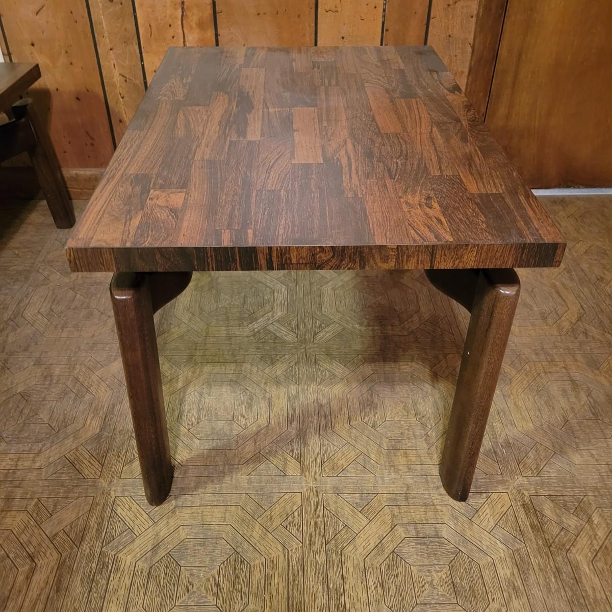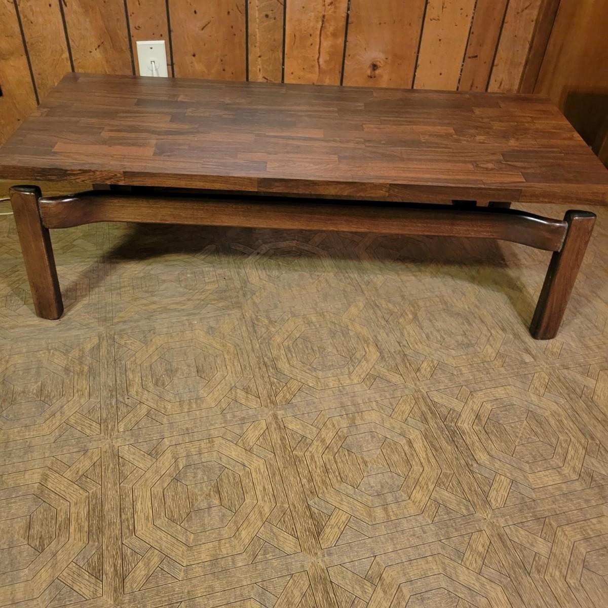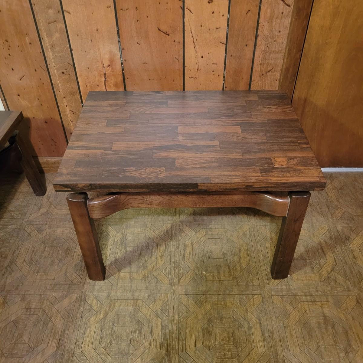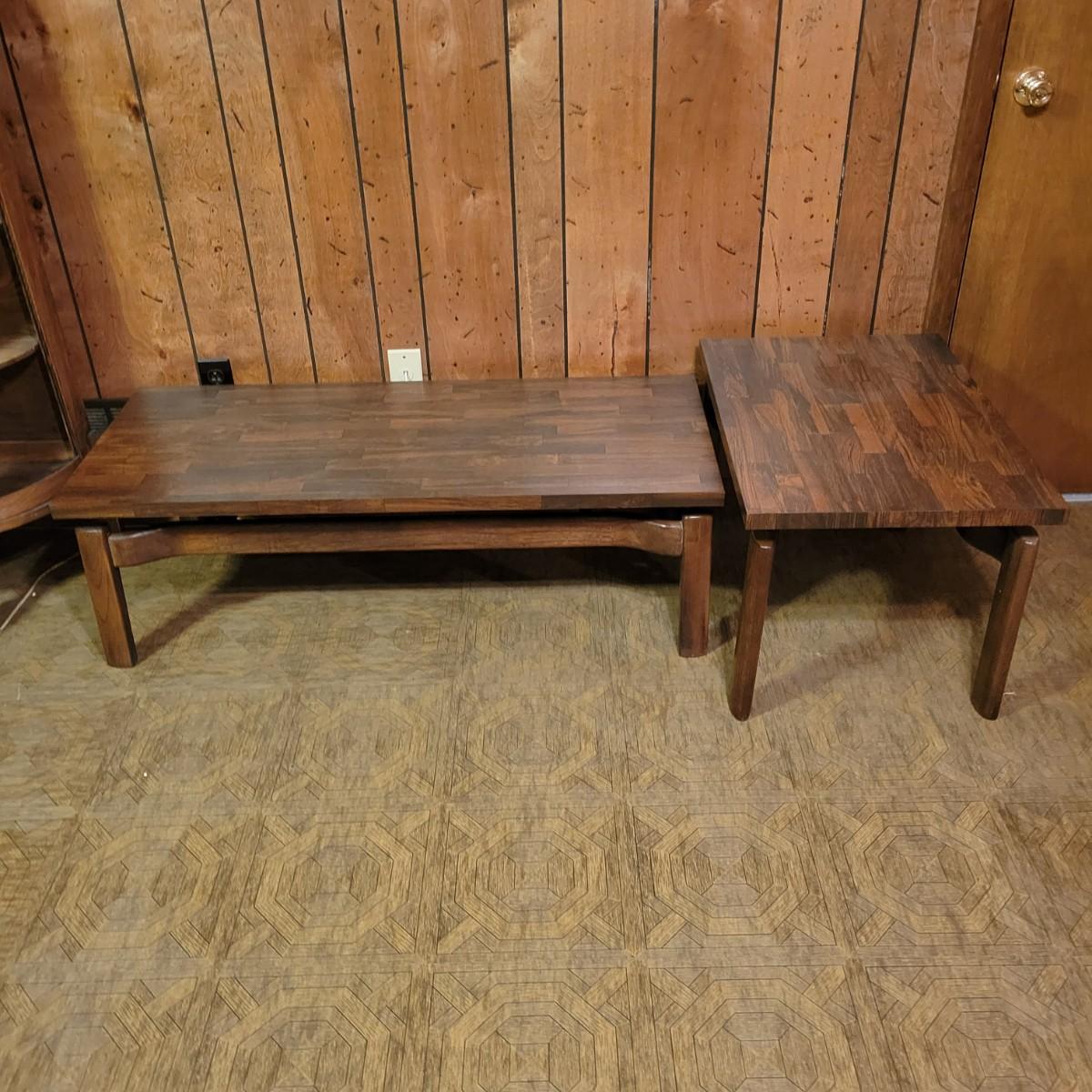 Matching Side and Coffee Tables that are constructed to look like the tops are floating above the legs. The bases of both tables are solid wood and the tops are engineered wood with a parquet like laminate. Coffee table measures approximately 48" x 20" x 15"H and the side table measures approximately 28" x 20" x 18"H. Local pickup only
