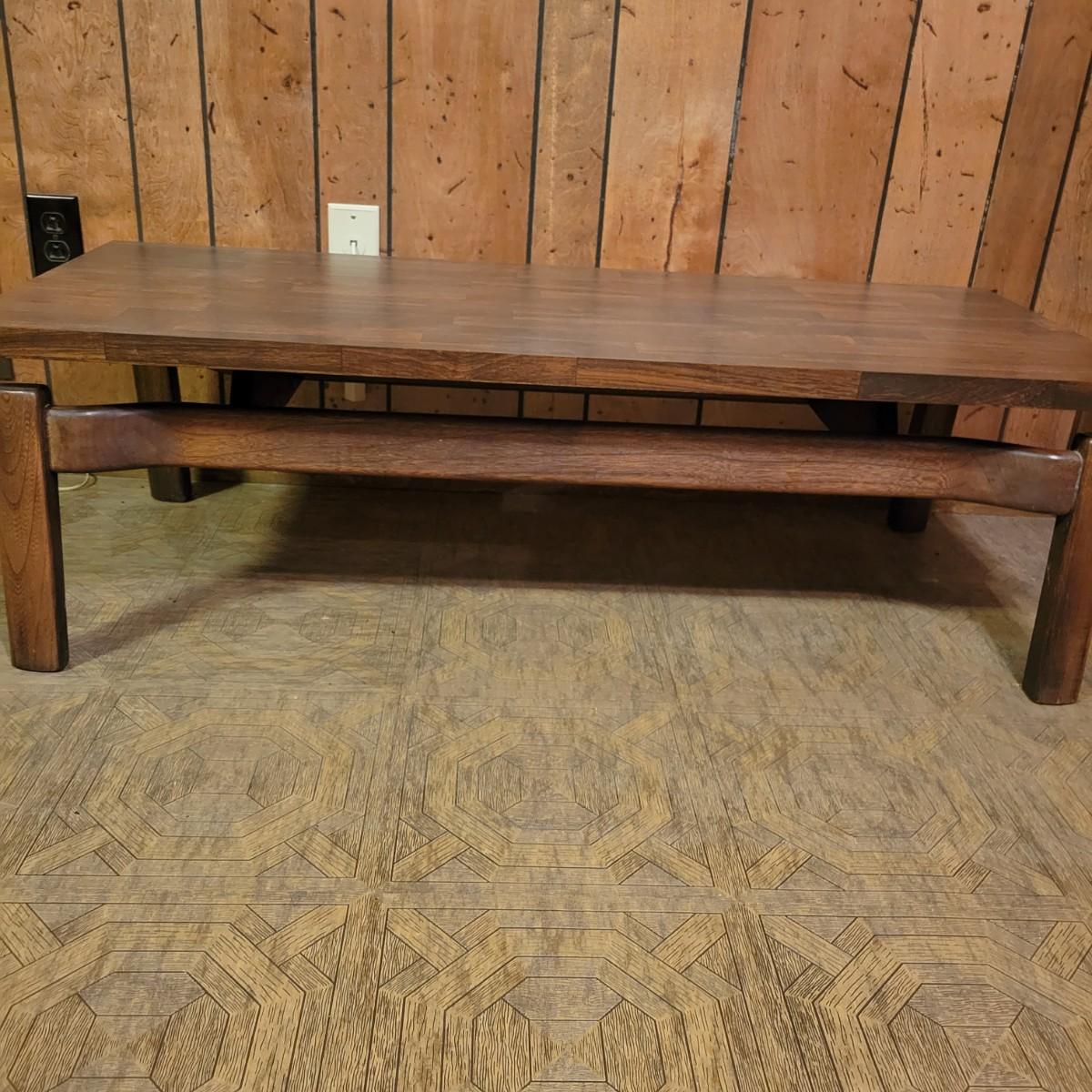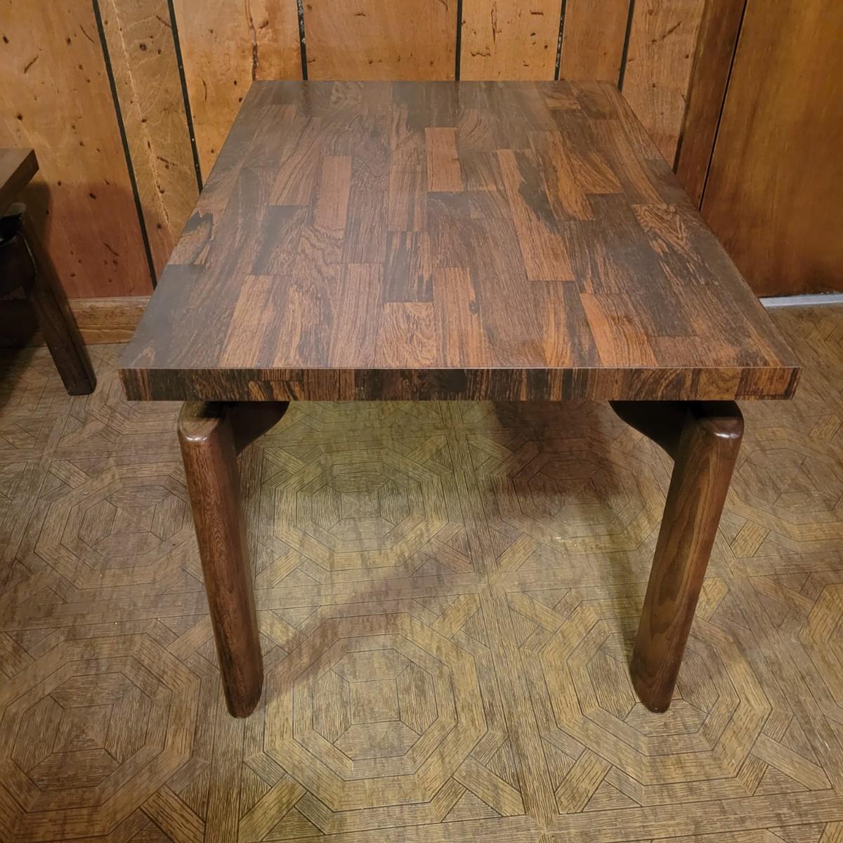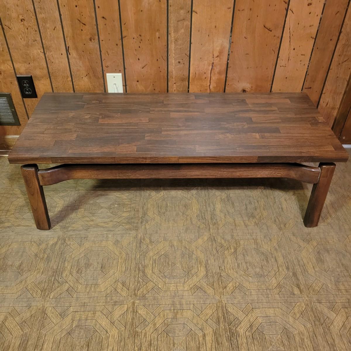 Matching Side and Coffee Tables that are constructed to look like the tops are floating above the legs. The bases of both tables are solid wood and the tops are engineered wood with a parquet like laminate. Coffee table measures approximately 48" x 20" x 15"H and the side table measures approximately 28" x 20" x 18"H. Local pickup only