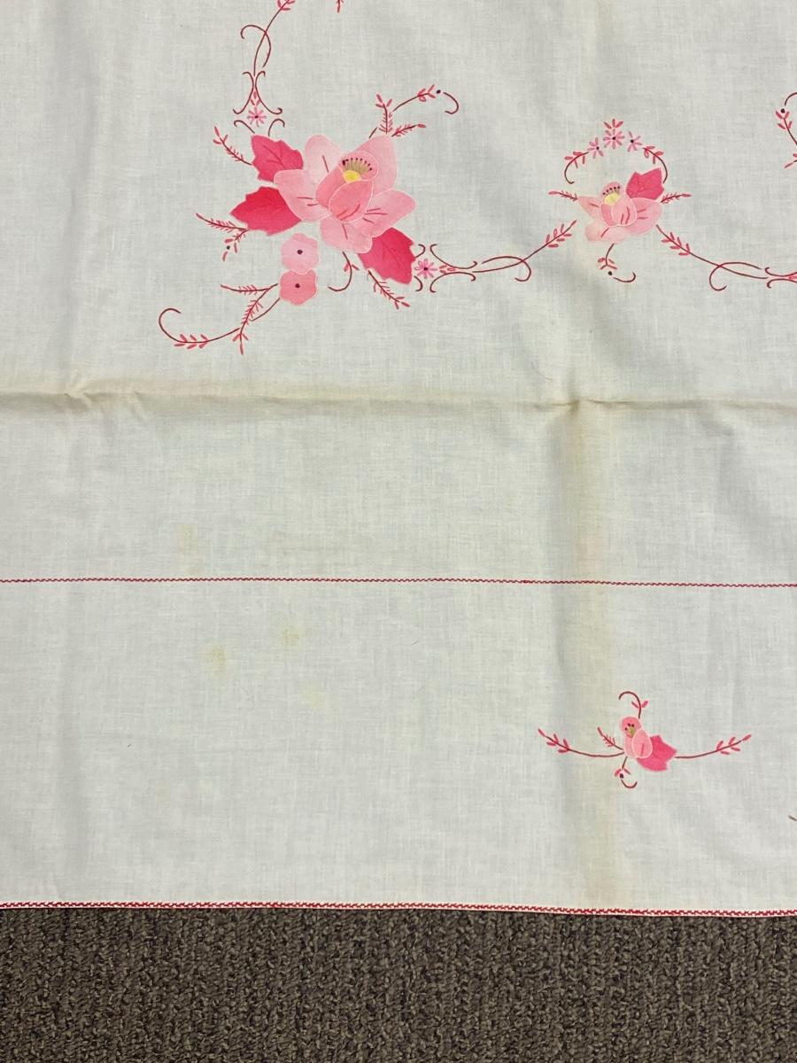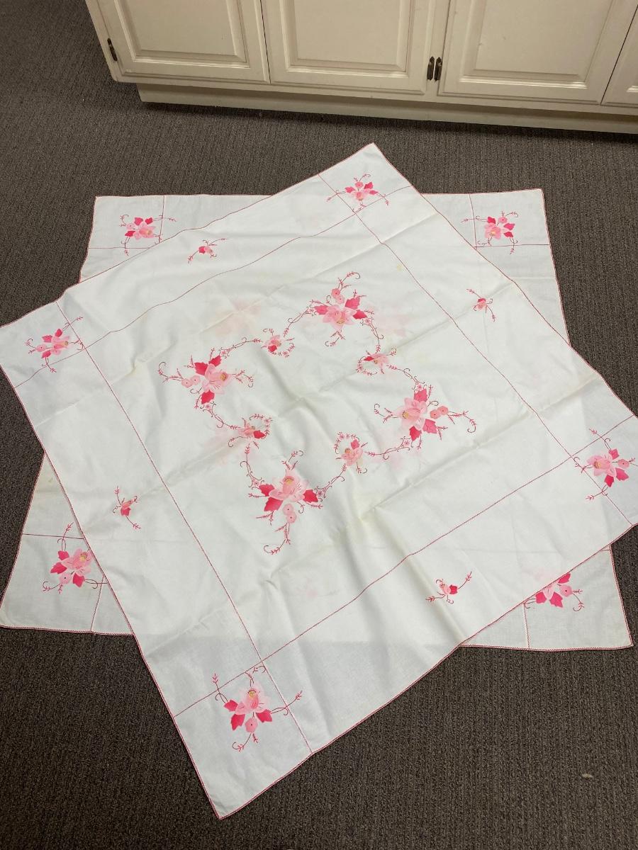 Matching Vintage Pink Flower Embroidered Applique Tablecloths. In good vintage condition. There is discolor along the fold lines but no holes or major spots.