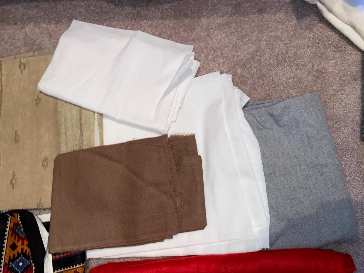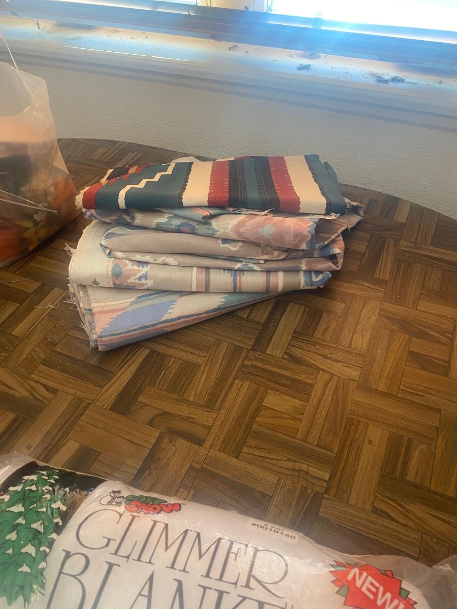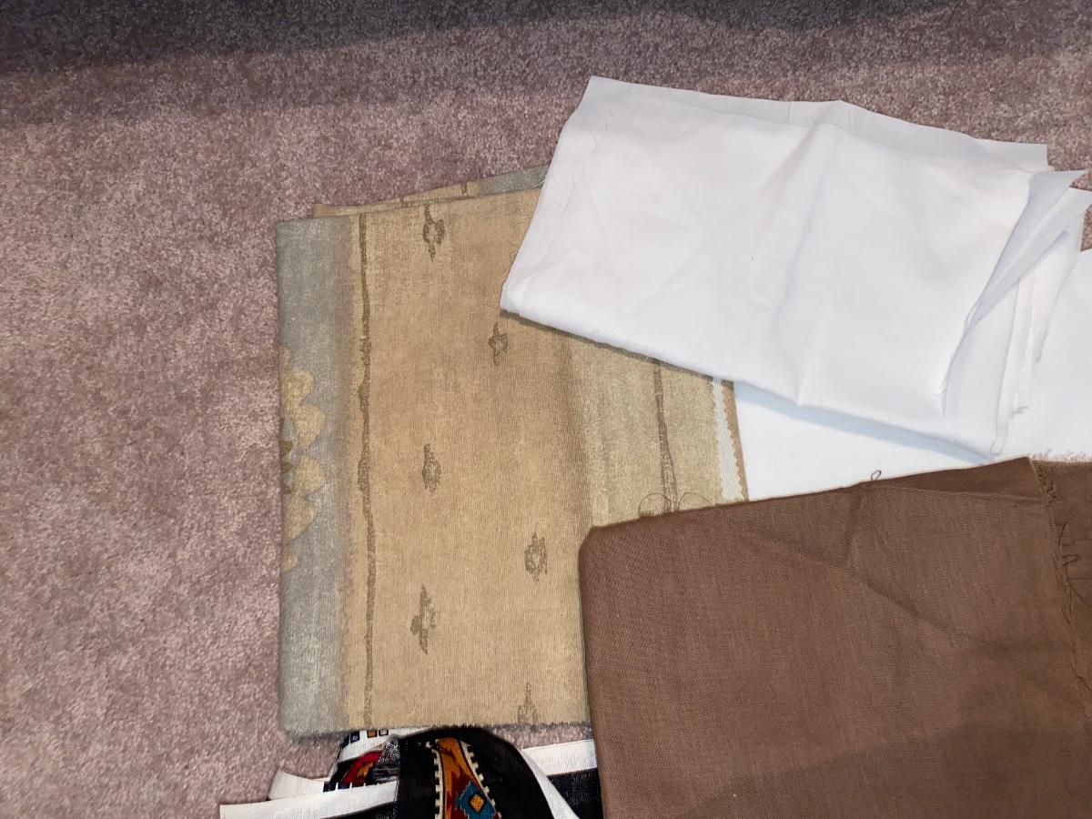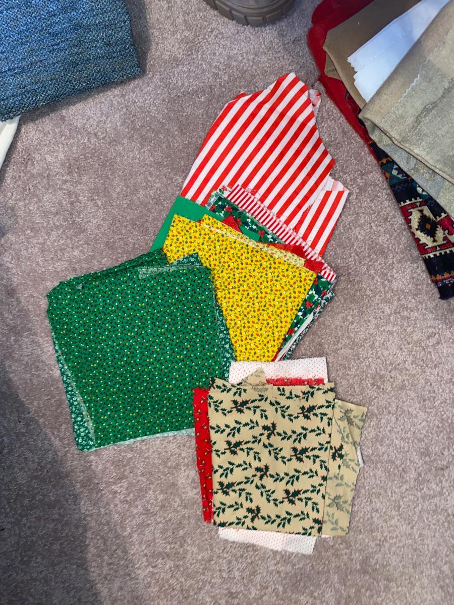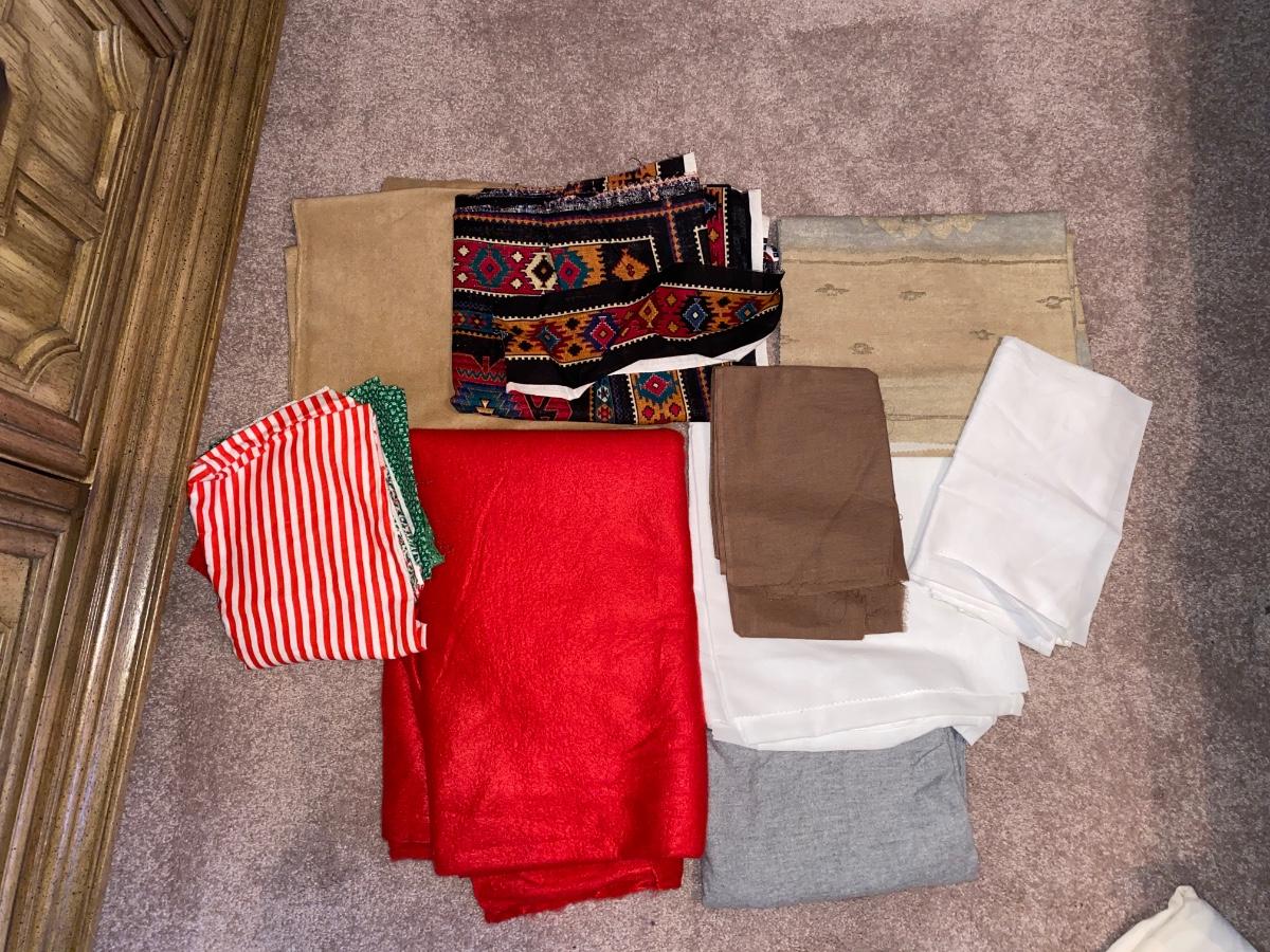 SEVERAL YARDS OF MATERIAL & CUT FOR QUILTING AND OTHER LARGE PIECES OF MATERIAL