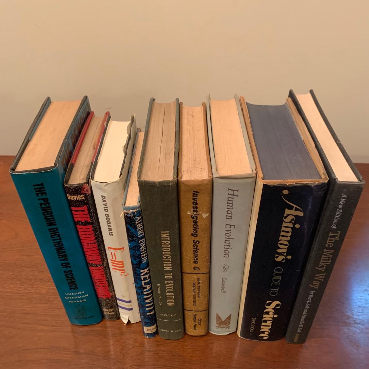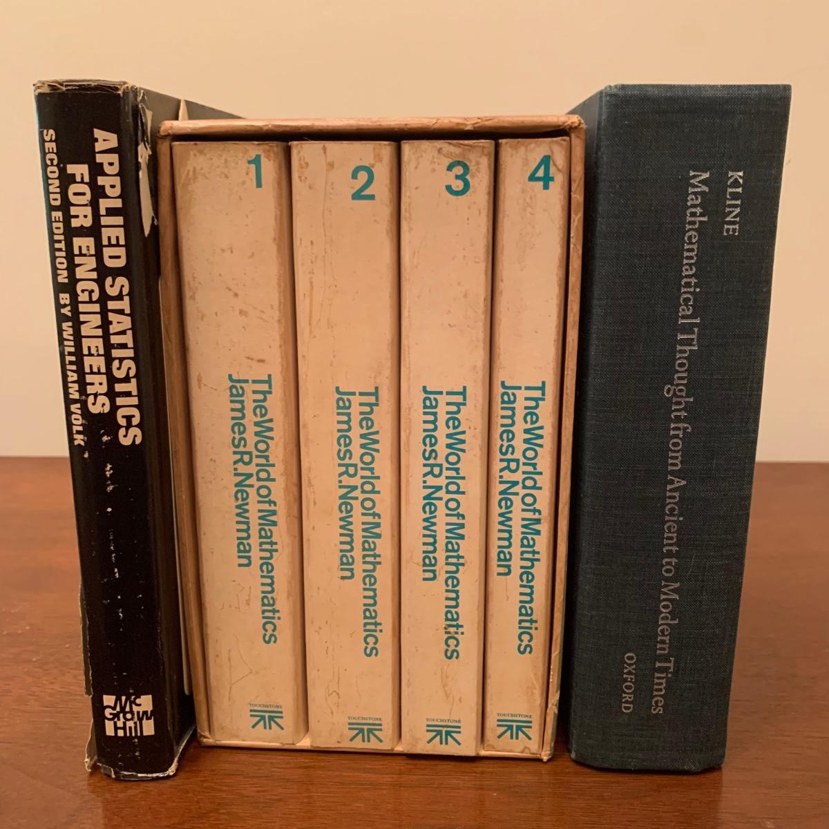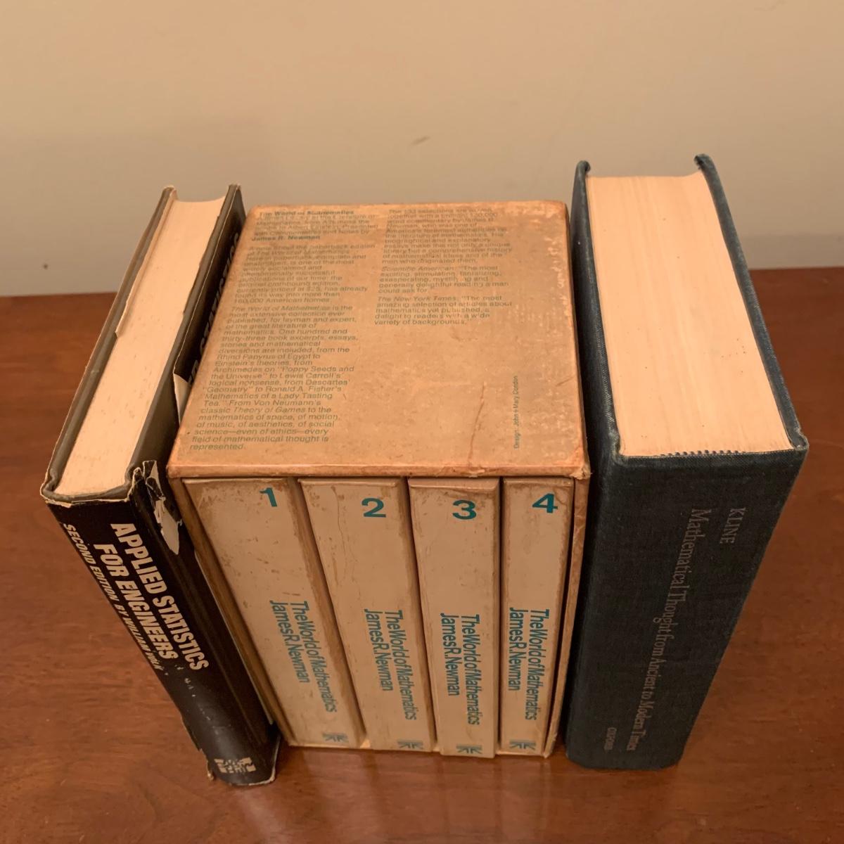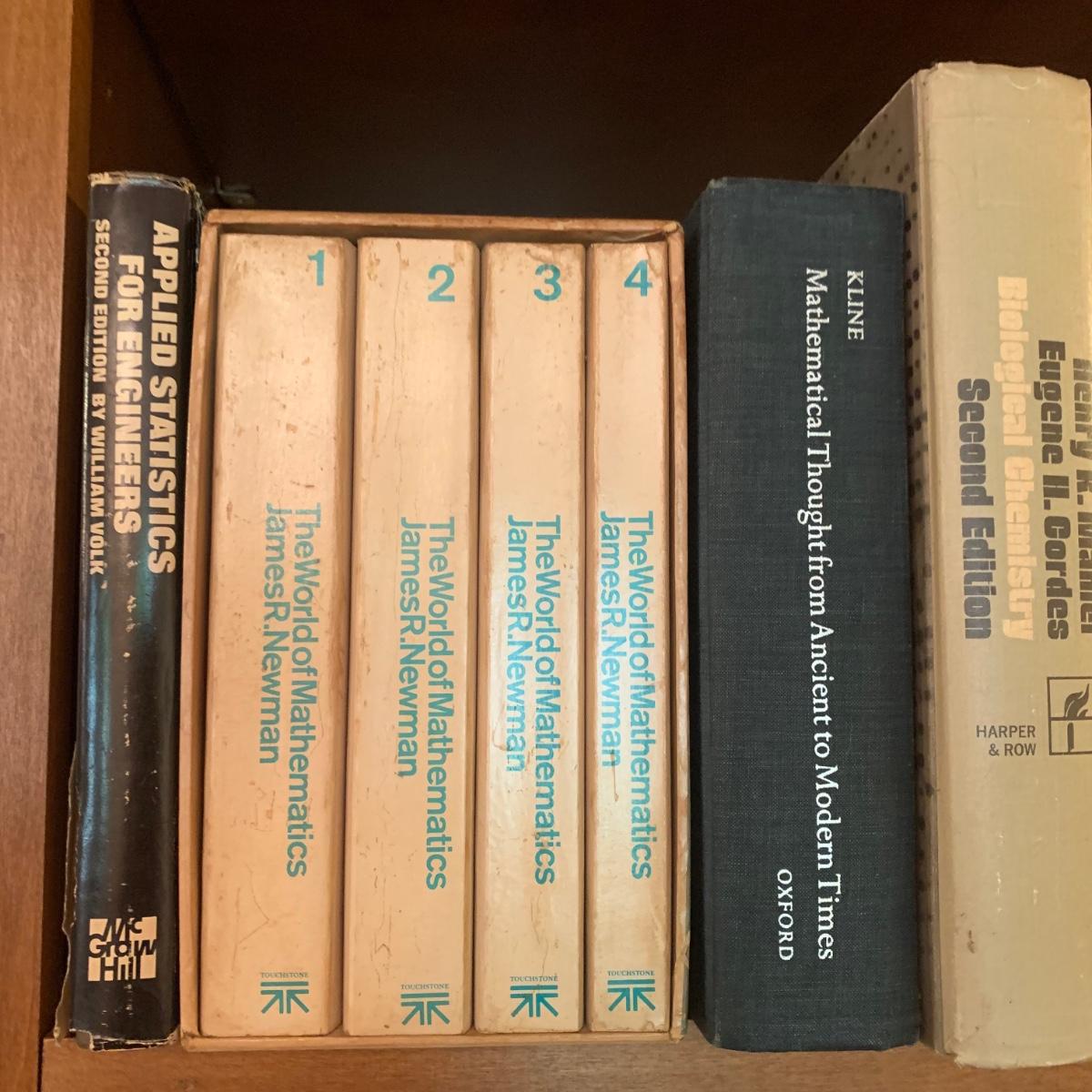 20+ books about math and science, including topics like: relativity, evolution, the universe, polymer processing, chemistry, physics, statistics, and more. All books are hardcover with the exception of the paperback four volume set “The World of Mathematics” by James R. Newman. All books are in good to fair condition. Most seem to be quite old and have gotten dusty and musty from being stored in a basement. Most covers are intact, with some wear and tear seen on the dust jackets.