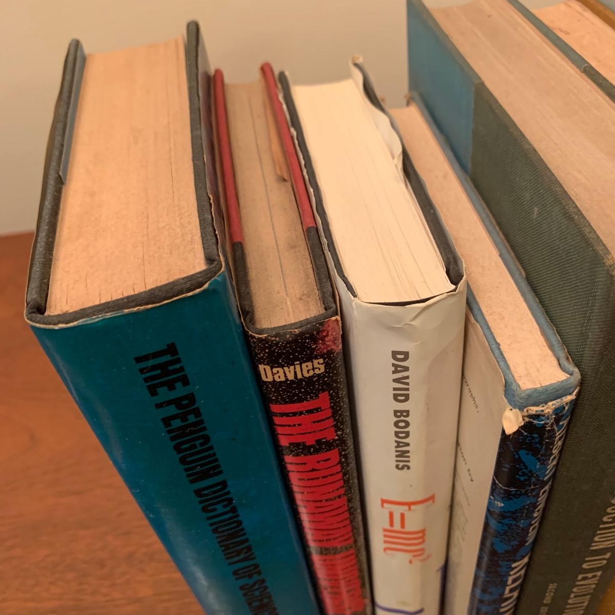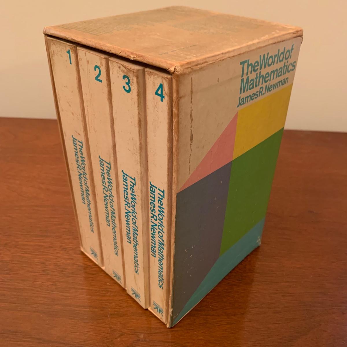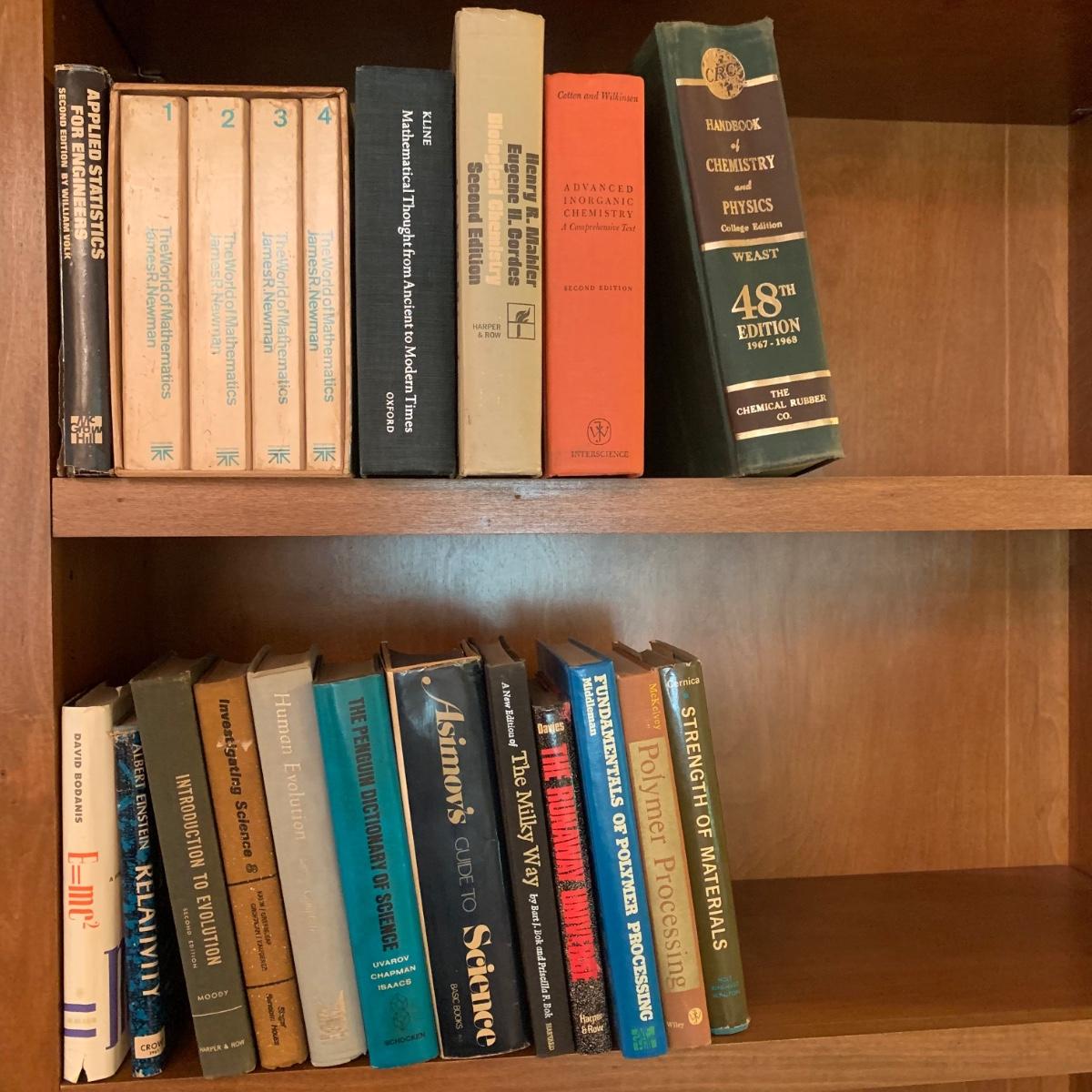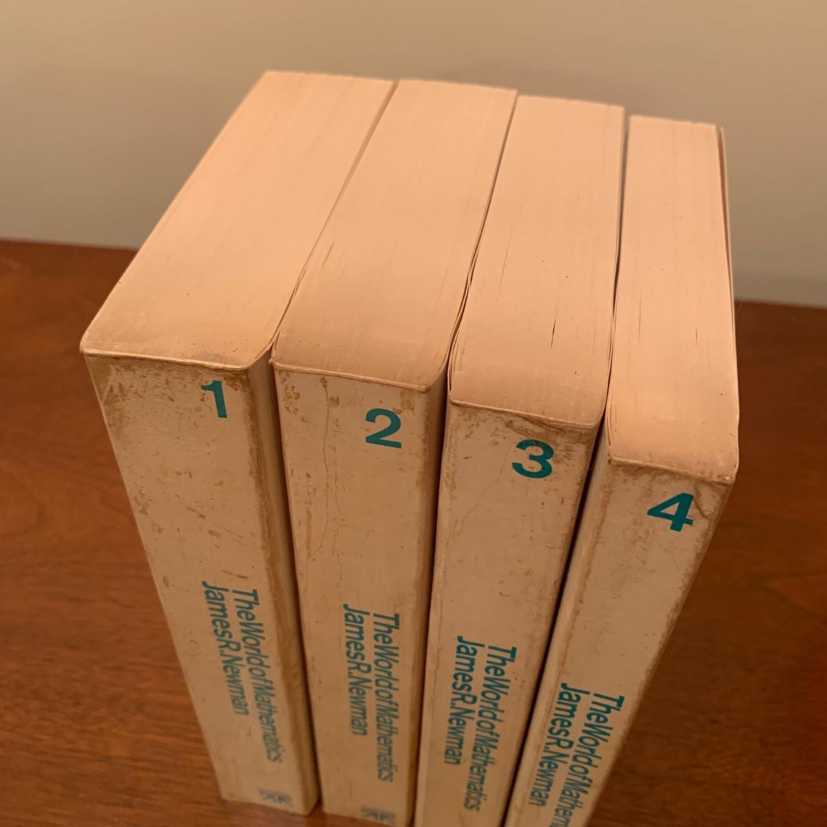 20+ books about math and science, including topics like: relativity, evolution, the universe, polymer processing, chemistry, physics, statistics, and more. All books are hardcover with the exception of the paperback four volume set “The World of Mathematics” by James R. Newman. All books are in good to fair condition. Most seem to be quite old and have gotten dusty and musty from being stored in a basement. Most covers are intact, with some wear and tear seen on the dust jackets.