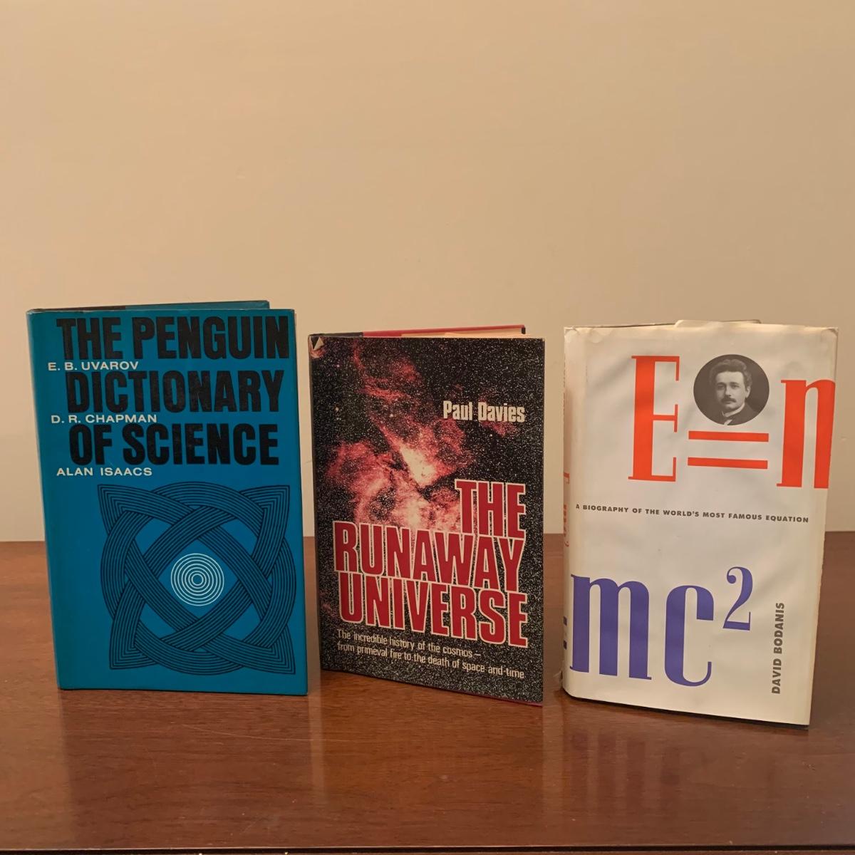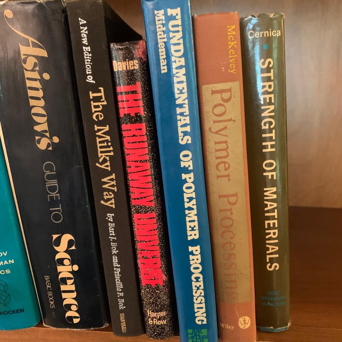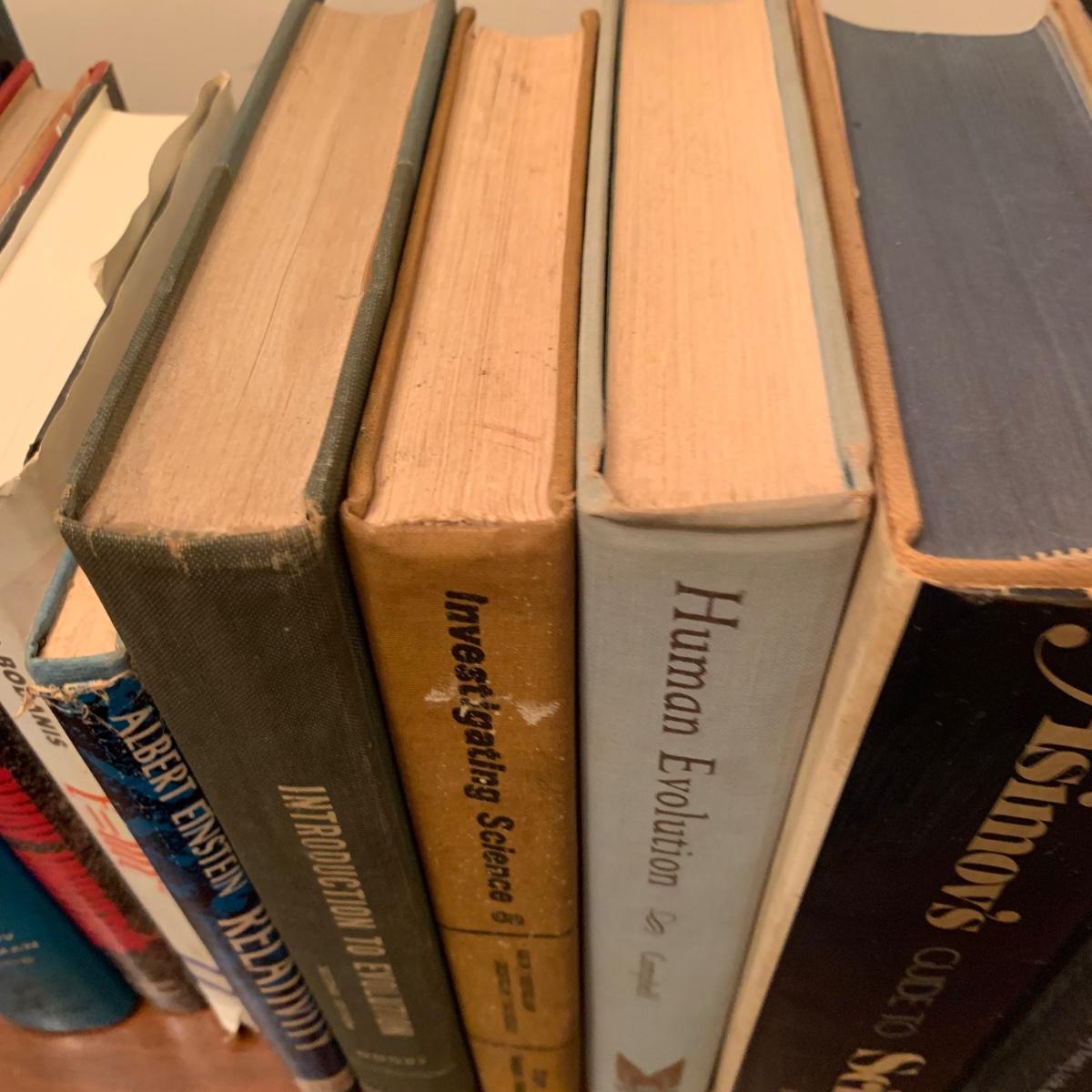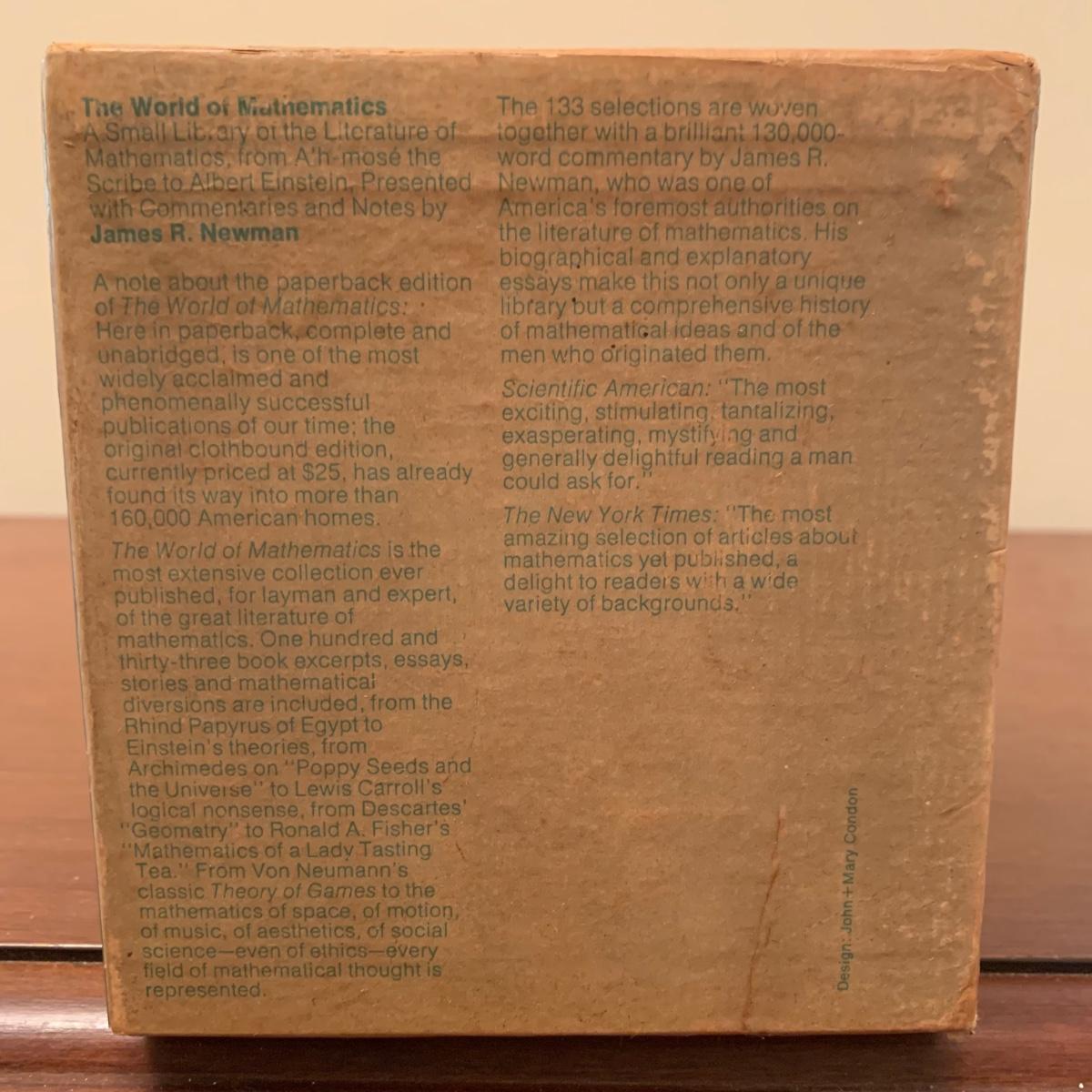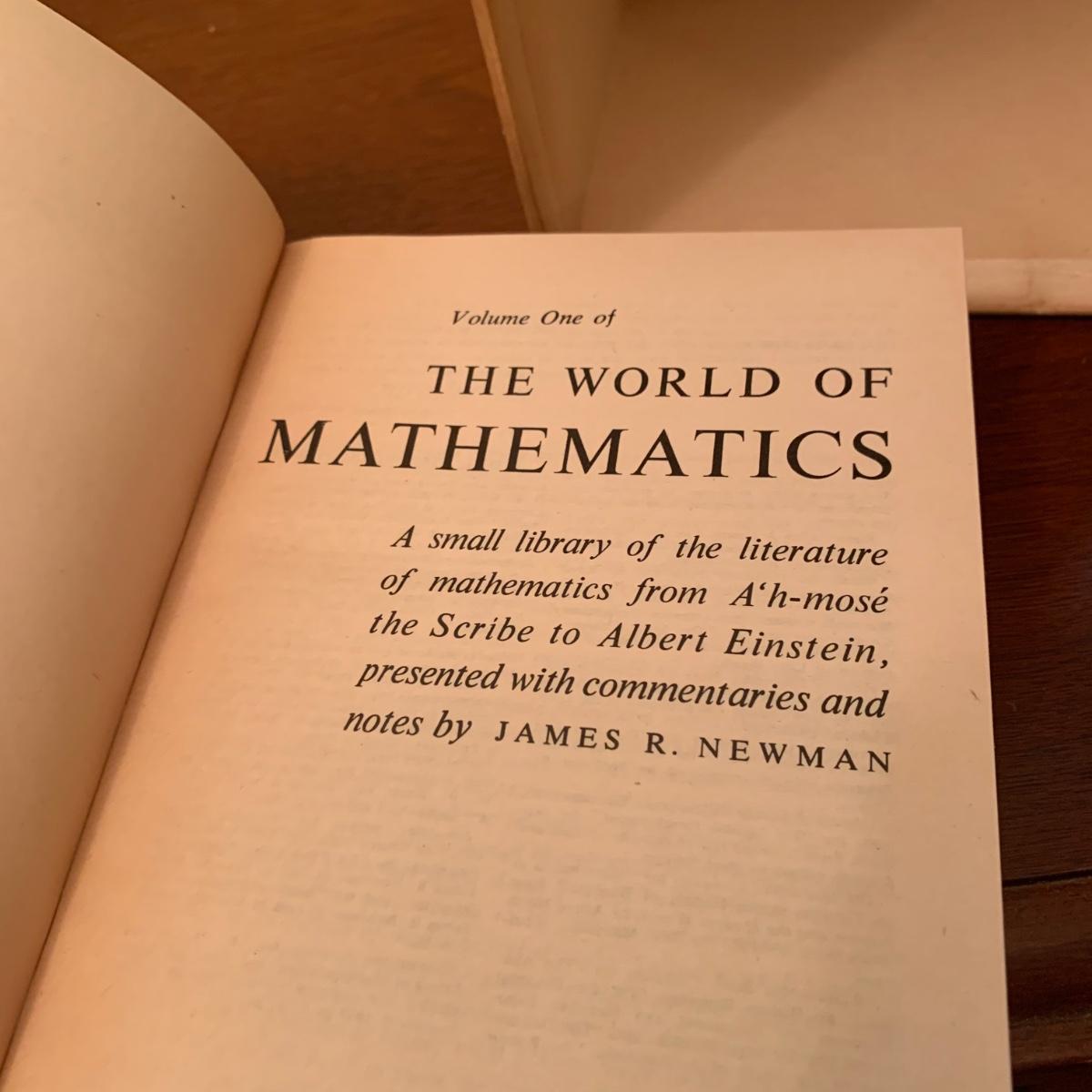 20+ books about math and science, including topics like: relativity, evolution, the universe, polymer processing, chemistry, physics, statistics, and more. All books are hardcover with the exception of the paperback four volume set “The World of Mathematics” by James R. Newman. All books are in good to fair condition. Most seem to be quite old and have gotten dusty and musty from being stored in a basement. Most covers are intact, with some wear and tear seen on the dust jackets.