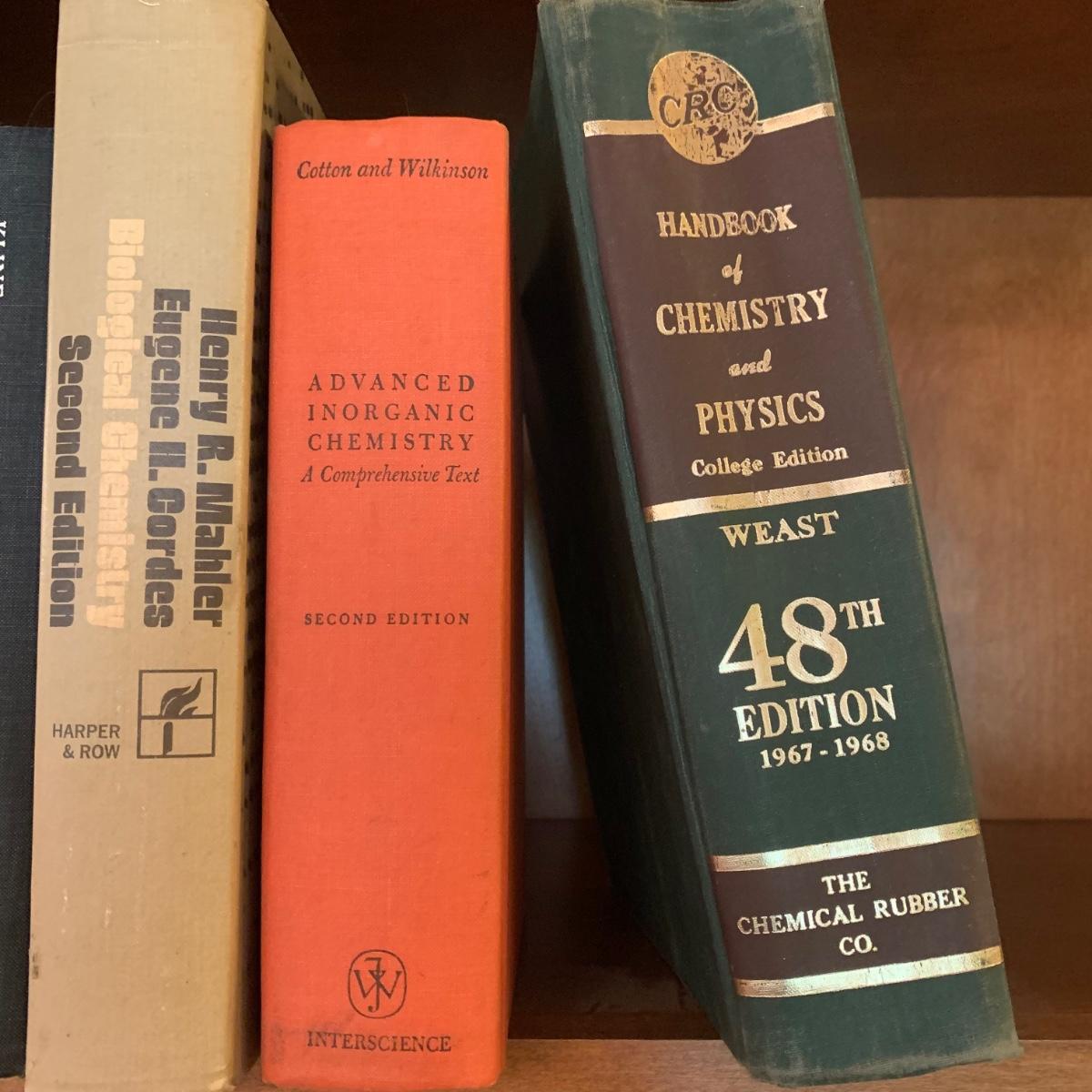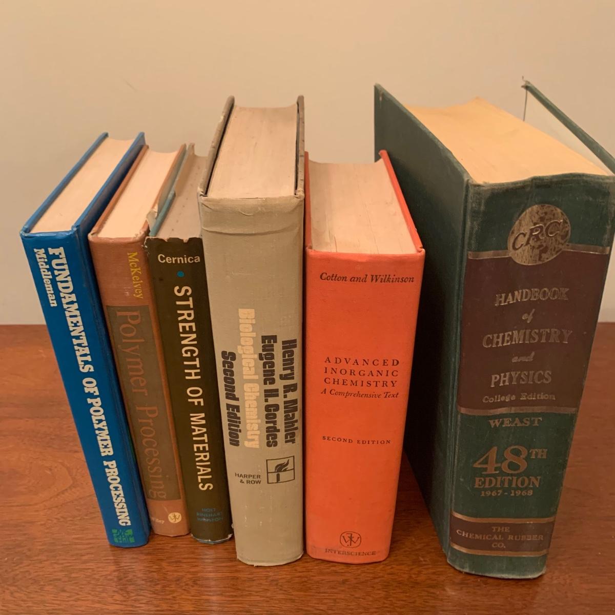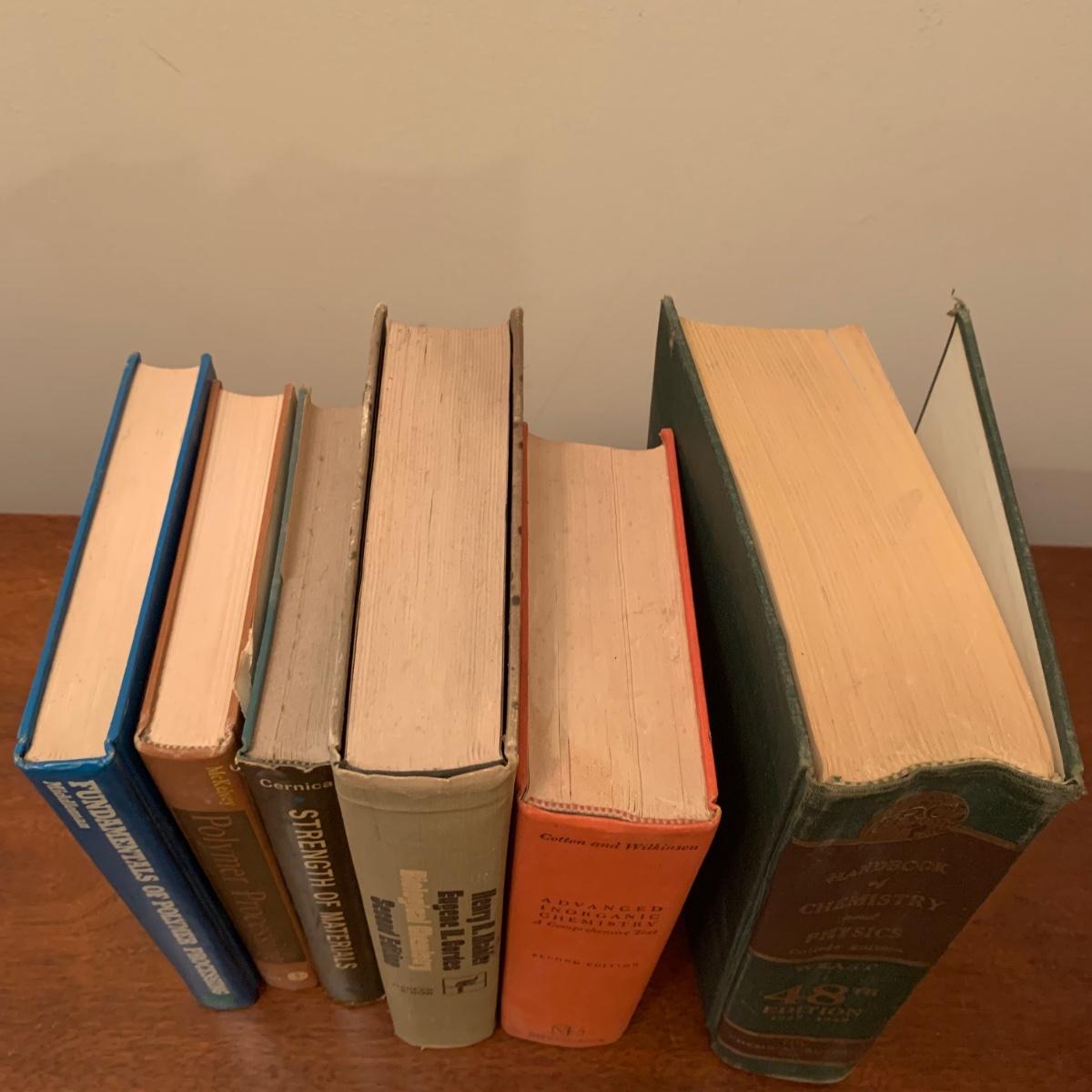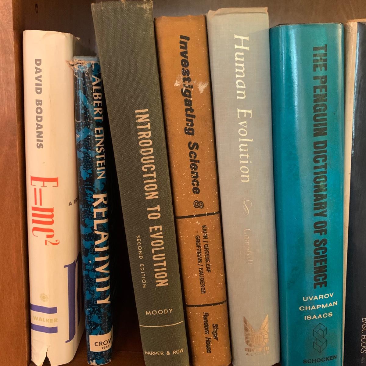 20+ books about math and science, including topics like: relativity, evolution, the universe, polymer processing, chemistry, physics, statistics, and more. All books are hardcover with the exception of the paperback four volume set “The World of Mathematics” by James R. Newman. All books are in good to fair condition. Most seem to be quite old and have gotten dusty and musty from being stored in a basement. Most covers are intact, with some wear and tear seen on the dust jackets.