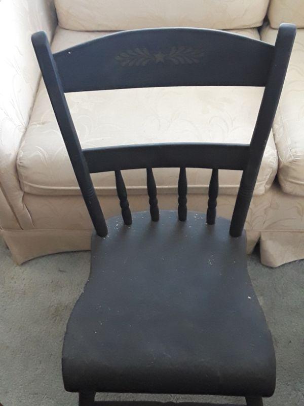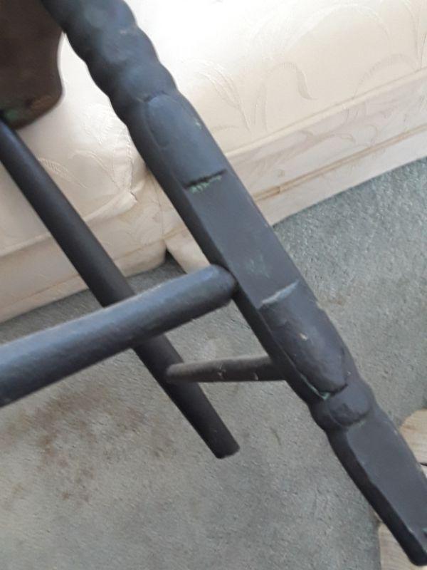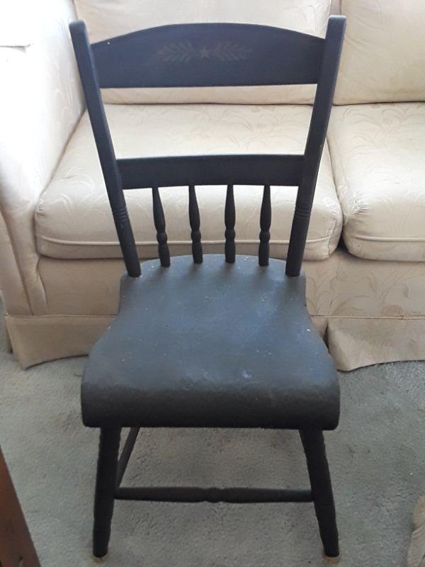 Spindle back farmhouse chair. Has been repainted in a matte black finish. Olive green star and leaf pattern across the back slat. Good as is or as a project piece. Local Pick up Only.
