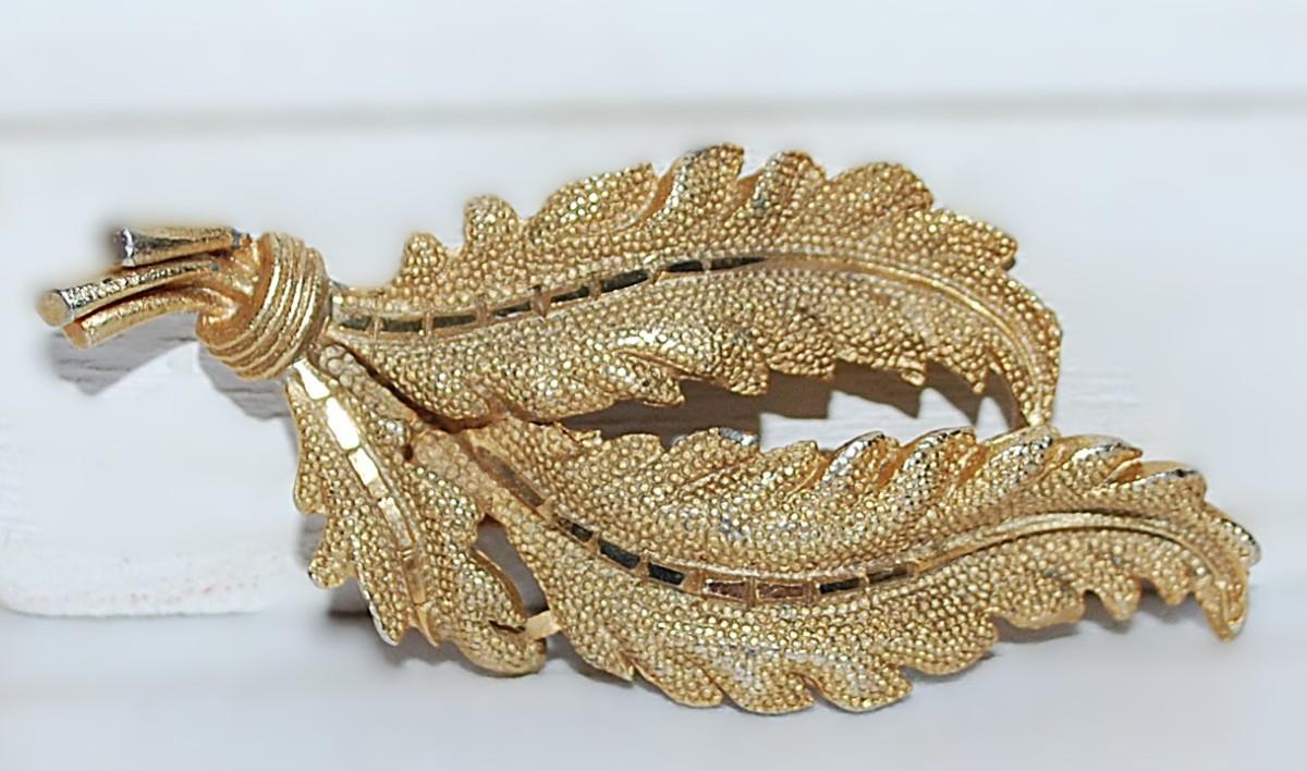 Matte Finished Gold Colored BROOCH (2¾" x 1¼") with 3 Leaves & Tied Stem on a Gold Tone Setting
