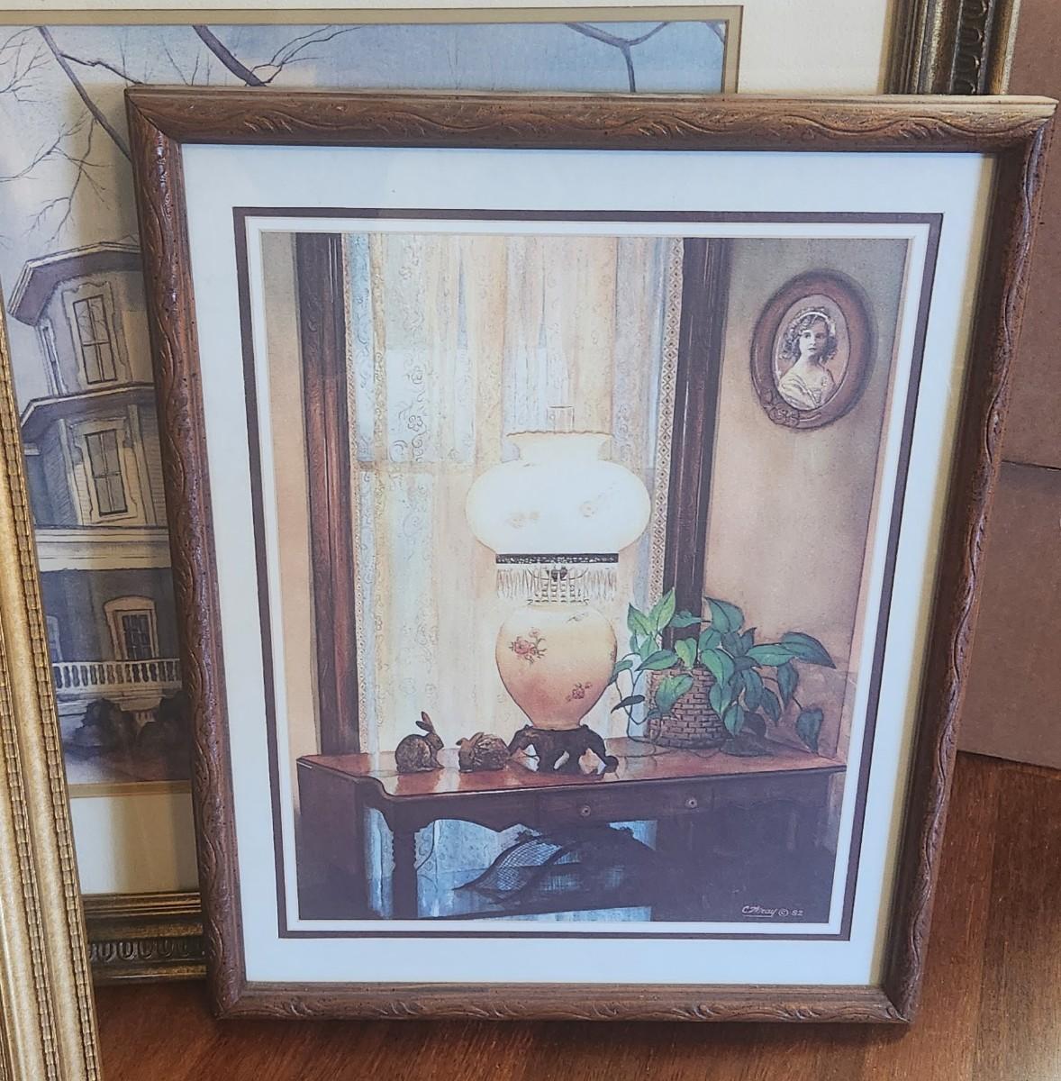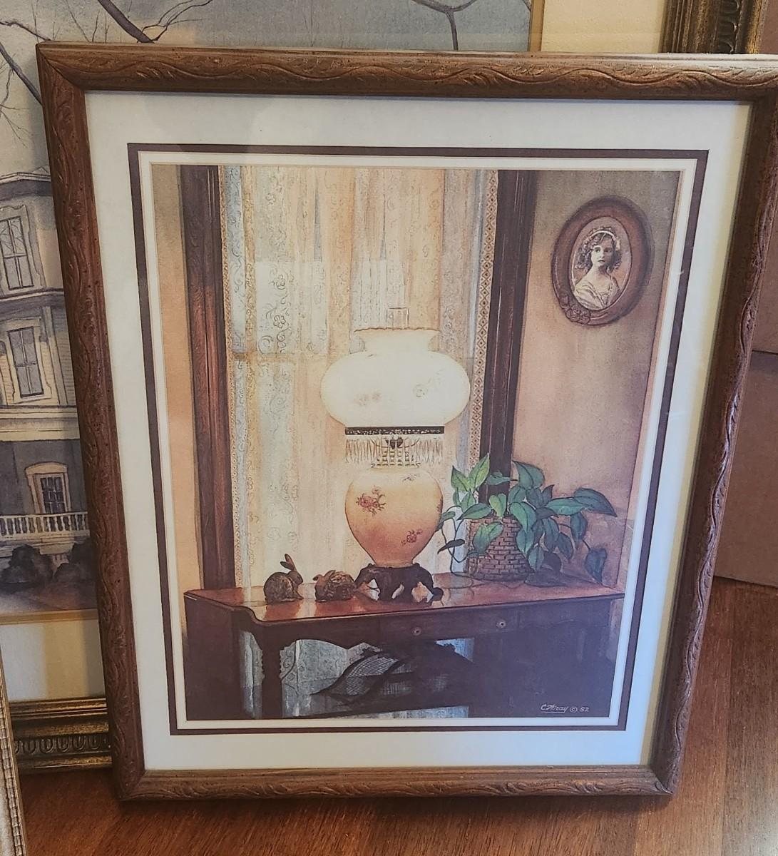 Lovely signed print matted and framed in carved wood frame. Check out the detail on the frame alone!