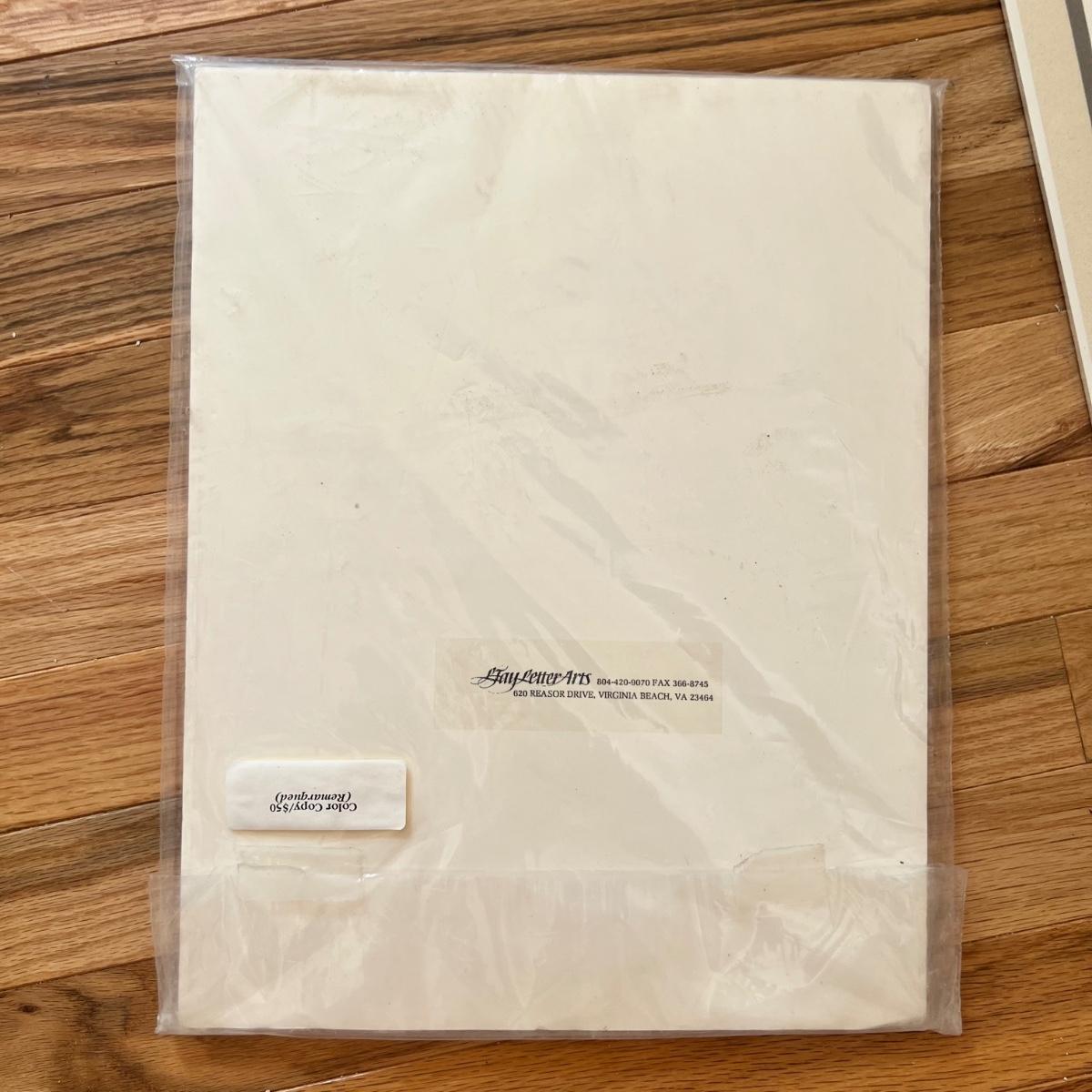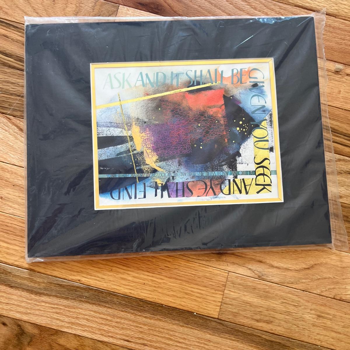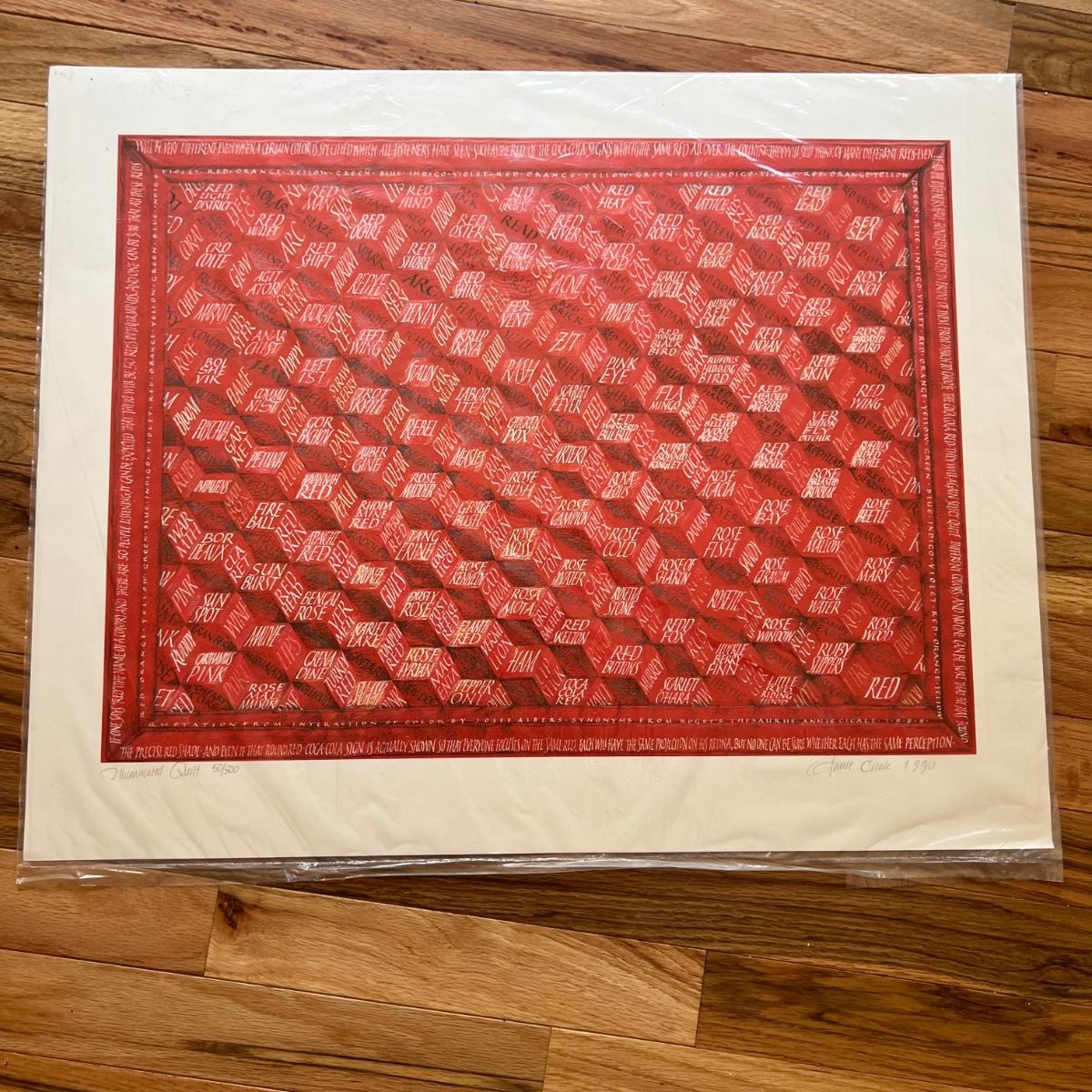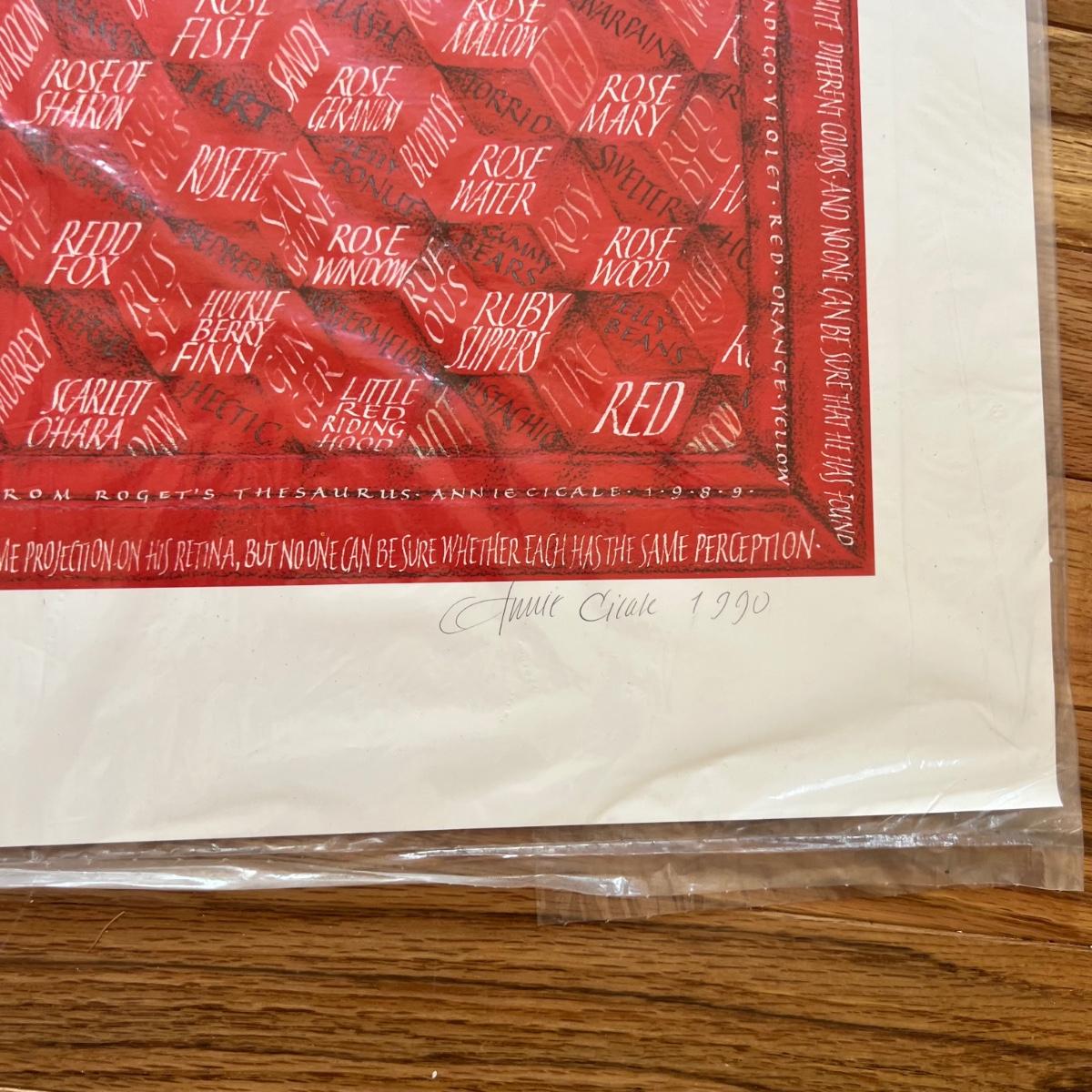 Eight artwork items. The largest red piece measures 24“ x 19“ and is signed as a limited edition reproduction by Annie Cicale. This piece is entitled “Illuminated Quilt” and it print number 50/500. The smallest piece measures 6.75“ x 11“ and begins…”It’s a wonderful advantage to a man…”