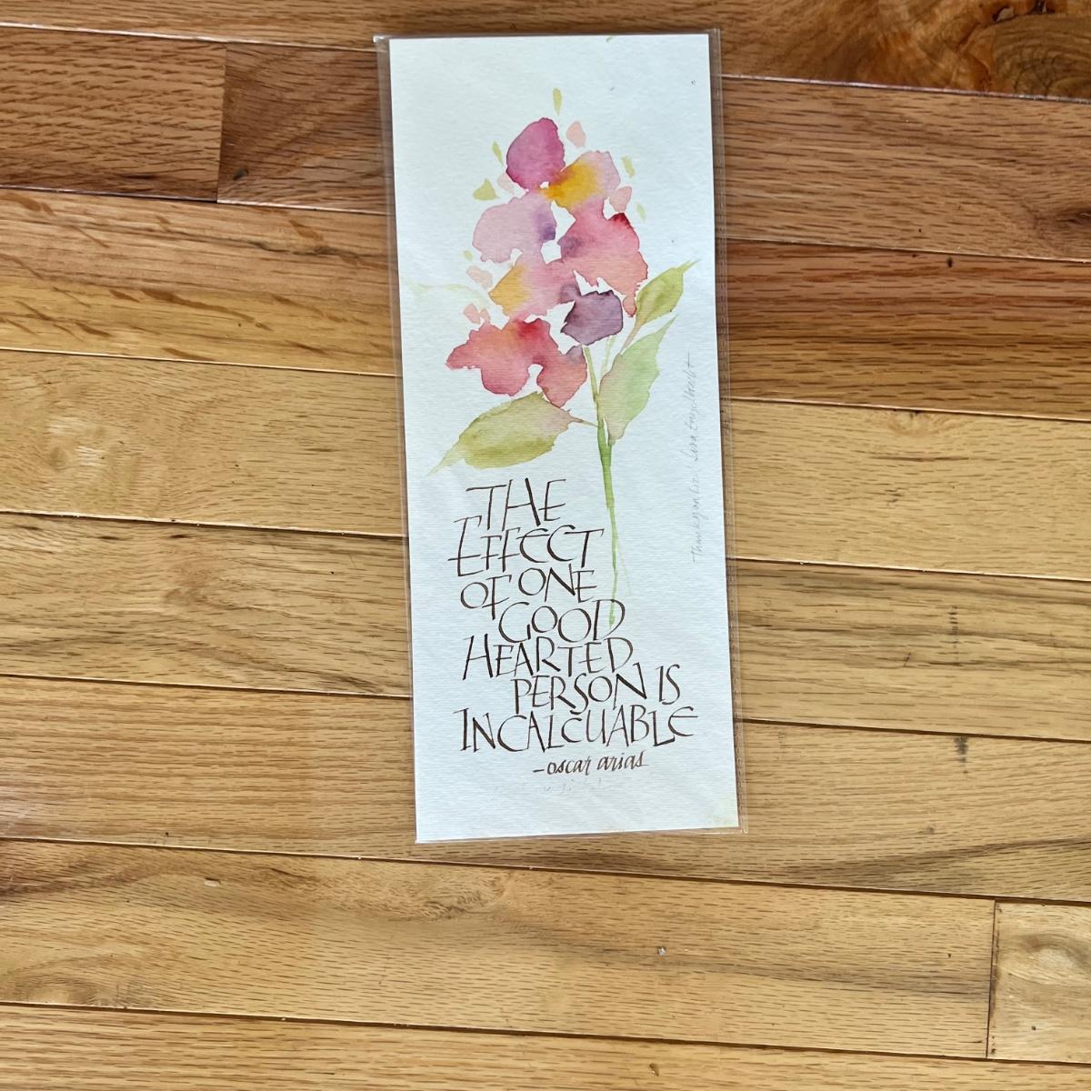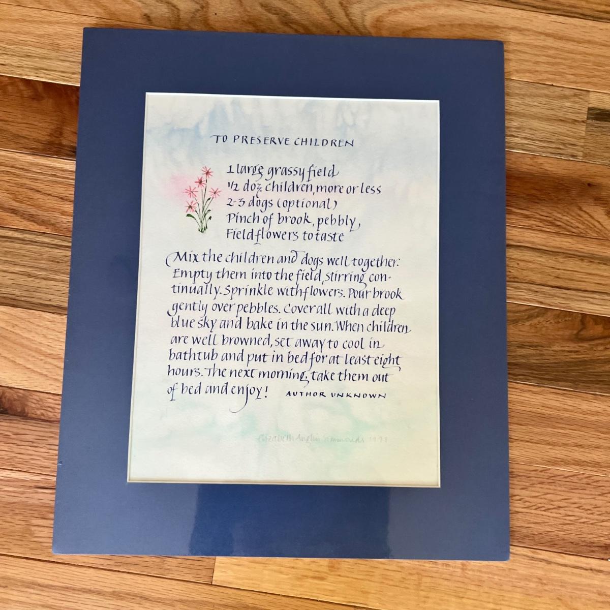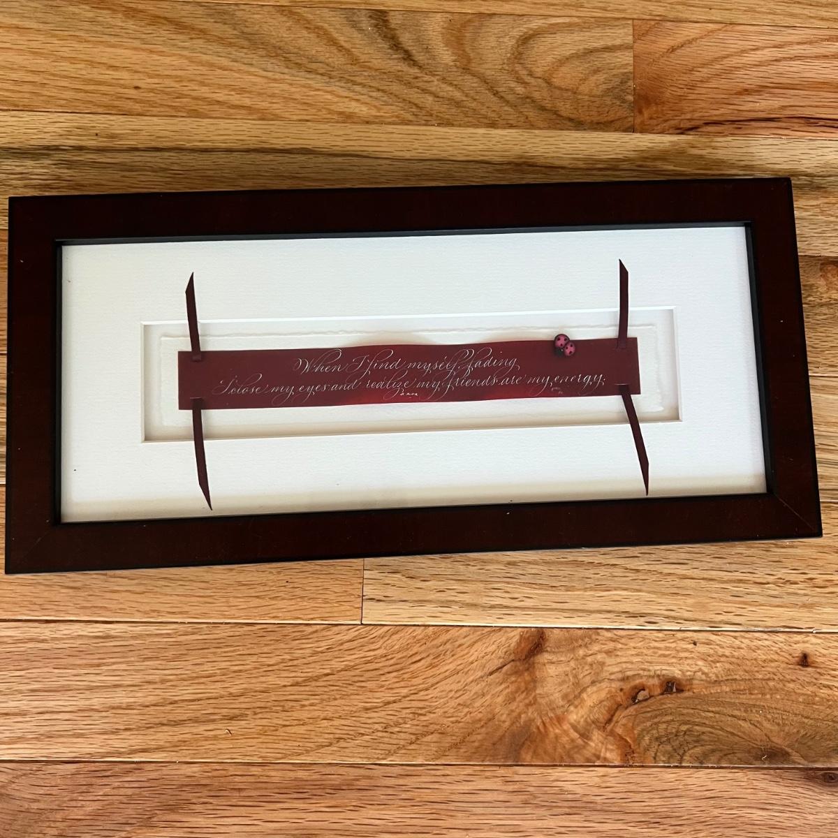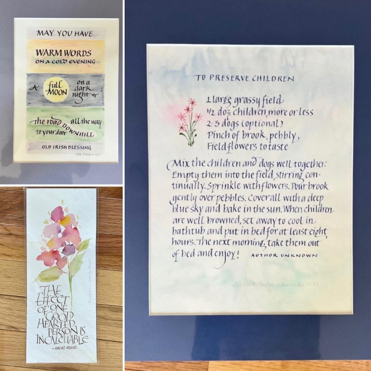 Four pieces of artwork two are matted and unframed one is matted and framed, and one is wrapped in cellophane. The largest unframed matted piece measures 12” x 14.75” and the frame piece that begins “… when you find myself fading…” measures 13”x 6” x 3/4” and is in a wood frame.