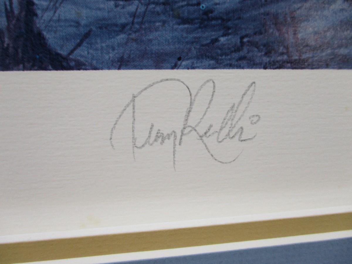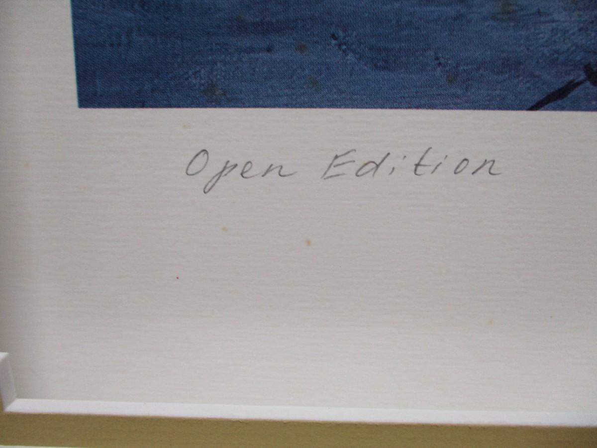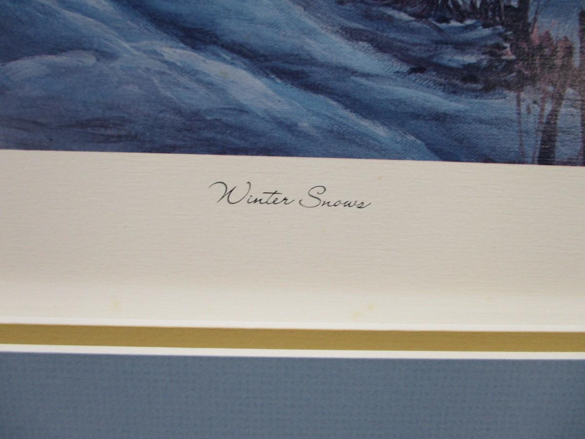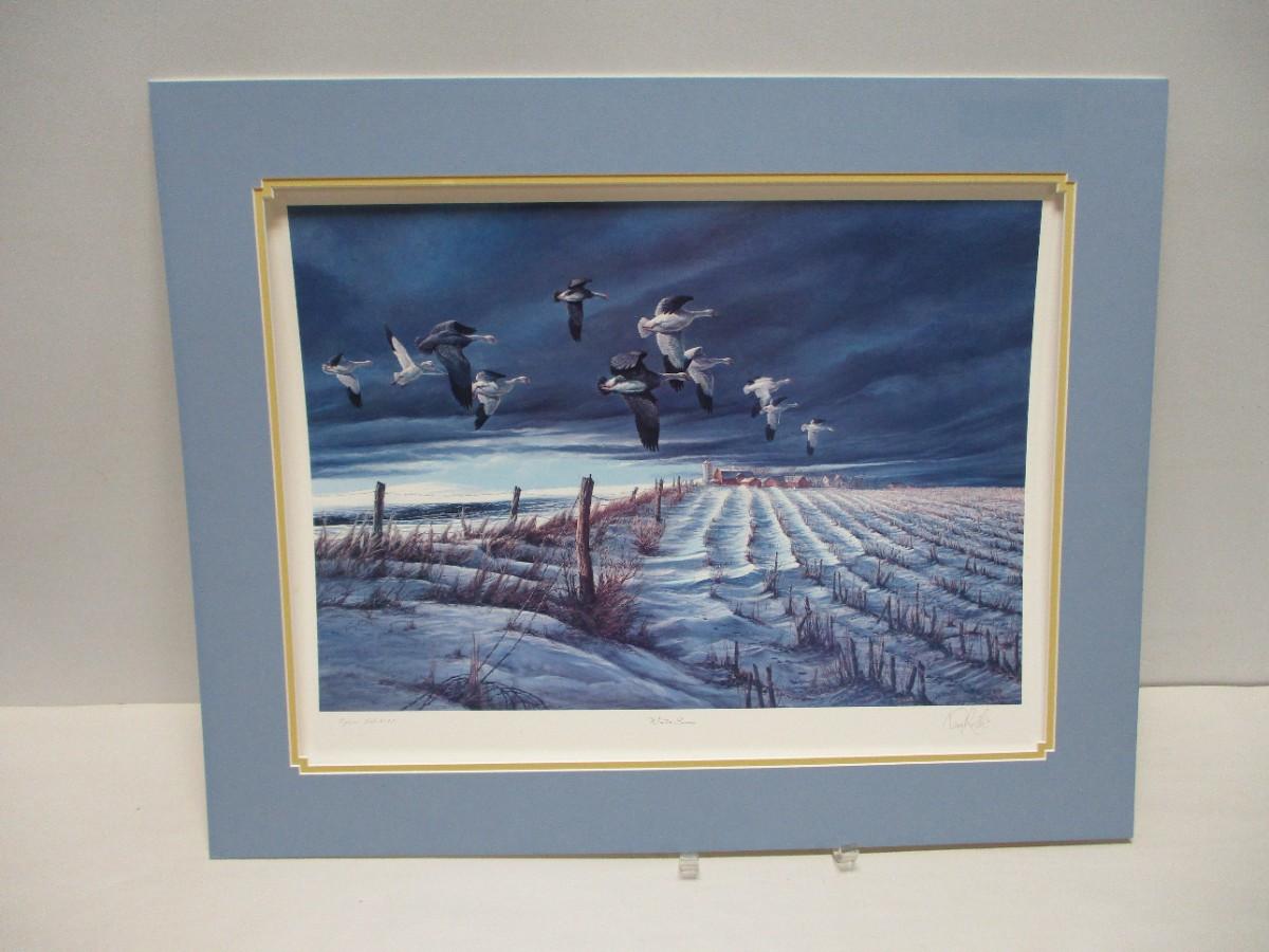 Geese flying over a farm in winter time - Offset Lithograph on paper - sight size18.5"h x 32"w