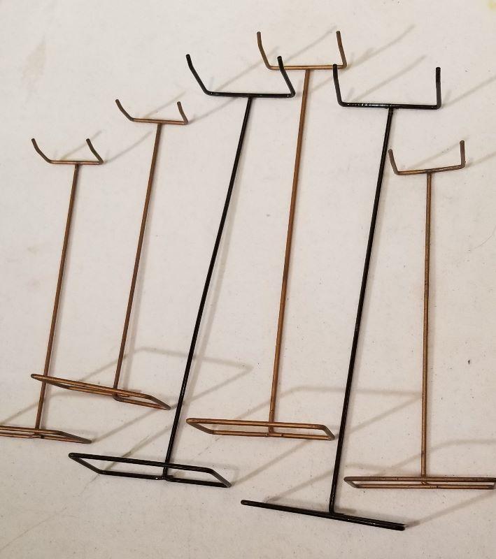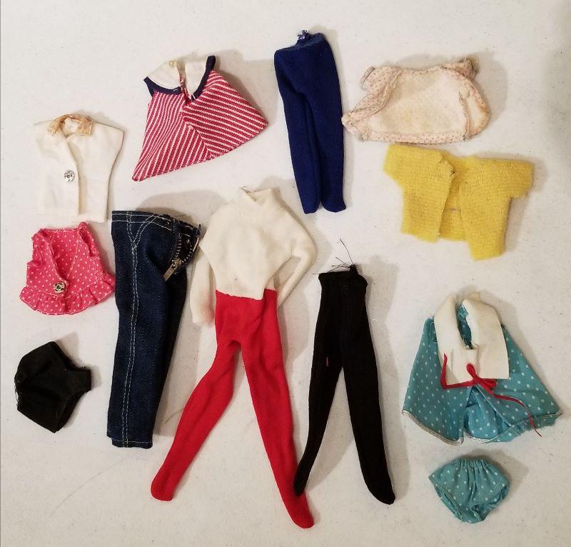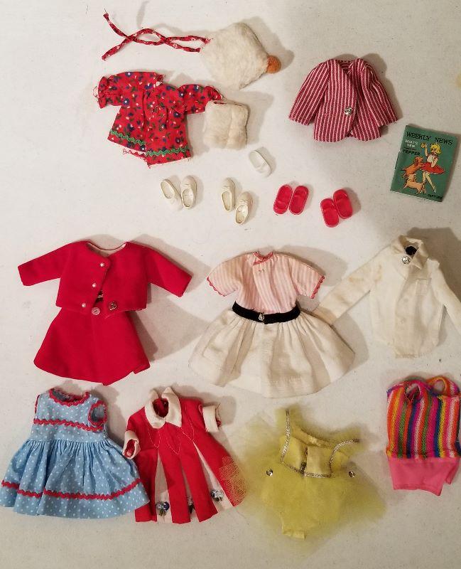 Mattel. Lot of miscellaneous clothes - tags marked: Pepper, Francie 1965, Tutti 1965, Skipper 1963, Ricky 1964, Todd 1965 + 3 hangers, 4 pr. of shoes, book, hat w/ muff. Also includes various heights of doll stands and a bag of tiny clothes. Loved and played with condition.