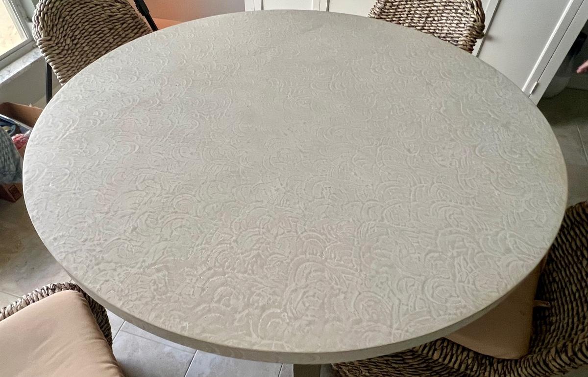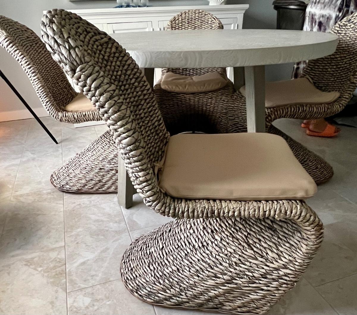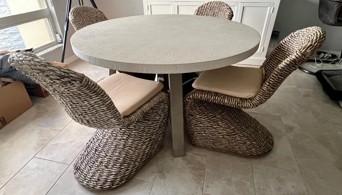 Gently used set. Includes four sturdy sea grass chairs. Table is 52" in diameter by 30" in height. All chairs are 34". This item is located another location. Further arrangements will need to be made to pick up this item. [EW]