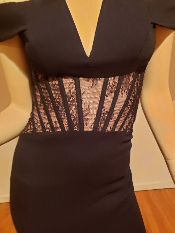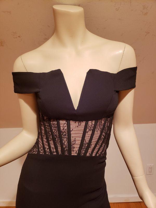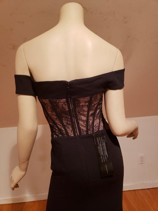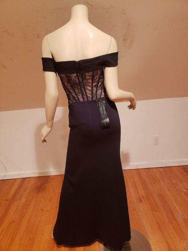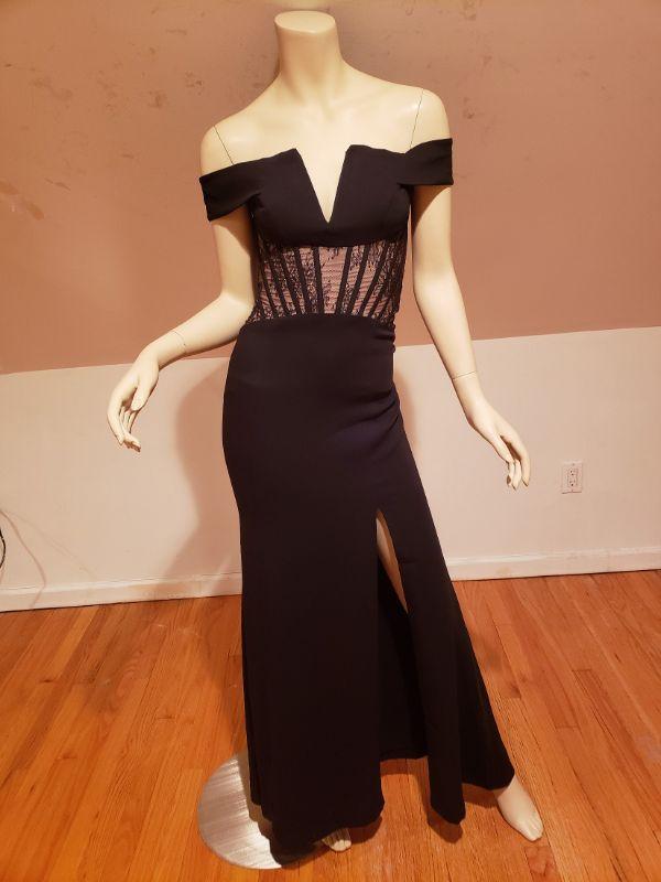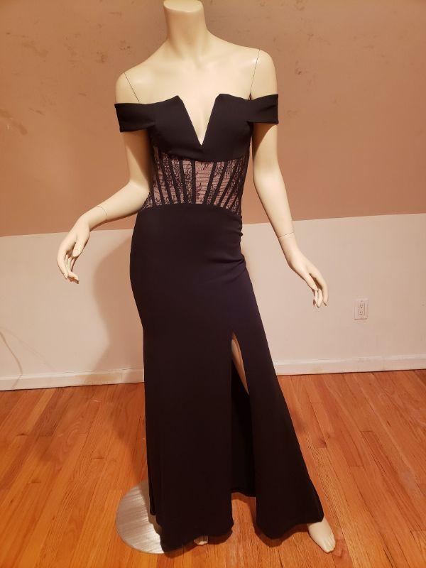 Stunning Gown with French lace midriff Bustier type of bodice and deep high slit to one side of skirt.