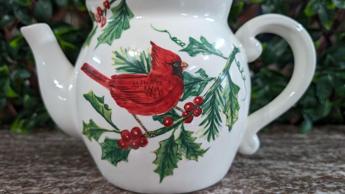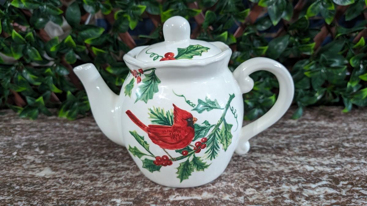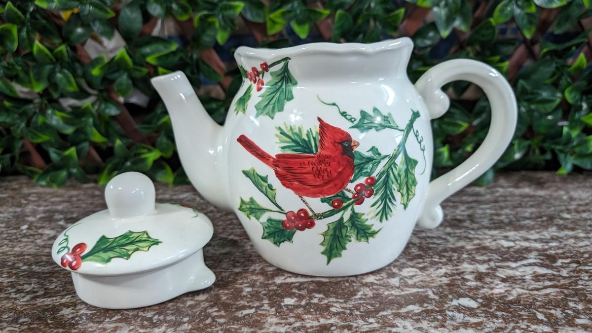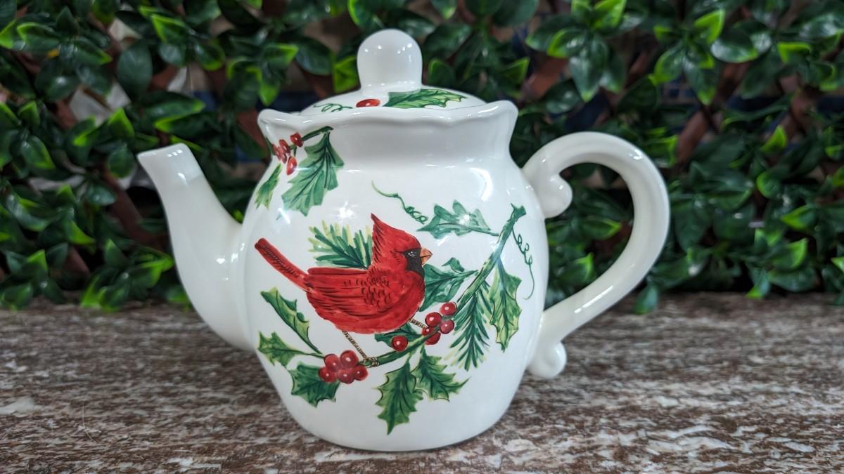 Maxcera Christmas Cardinal Teapot White Porcelain Holly Handcrafted in China