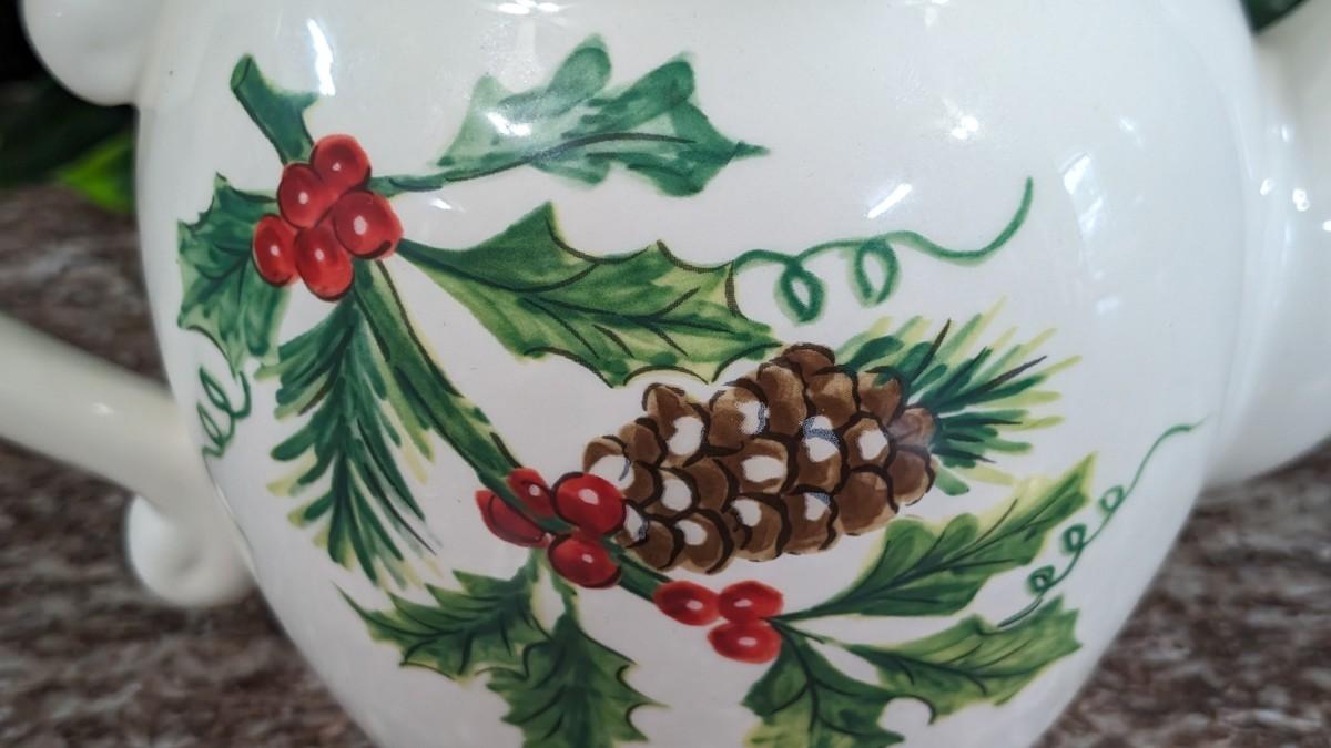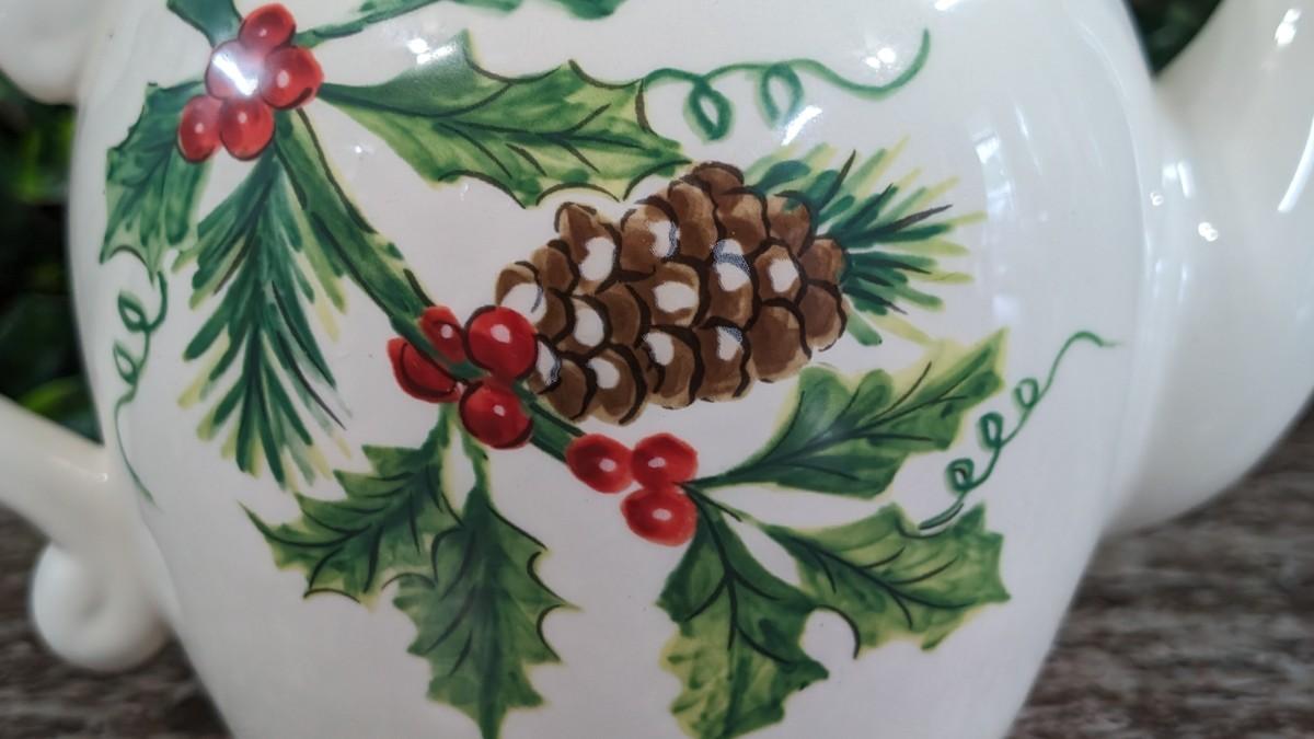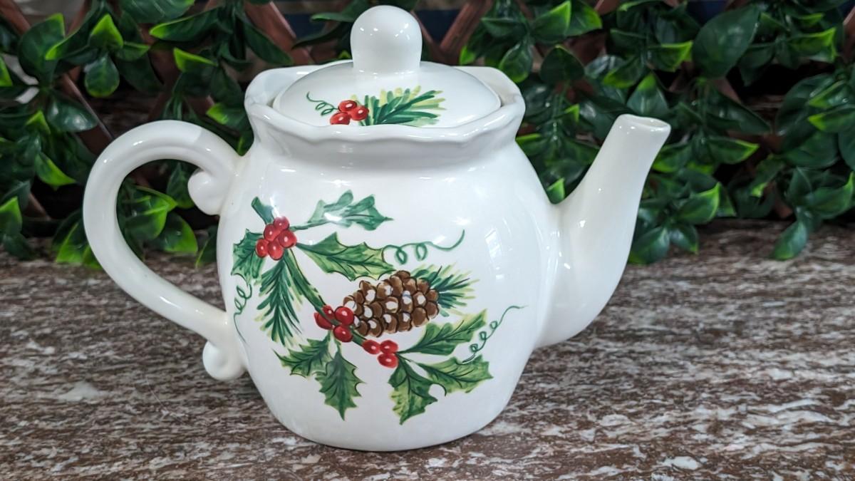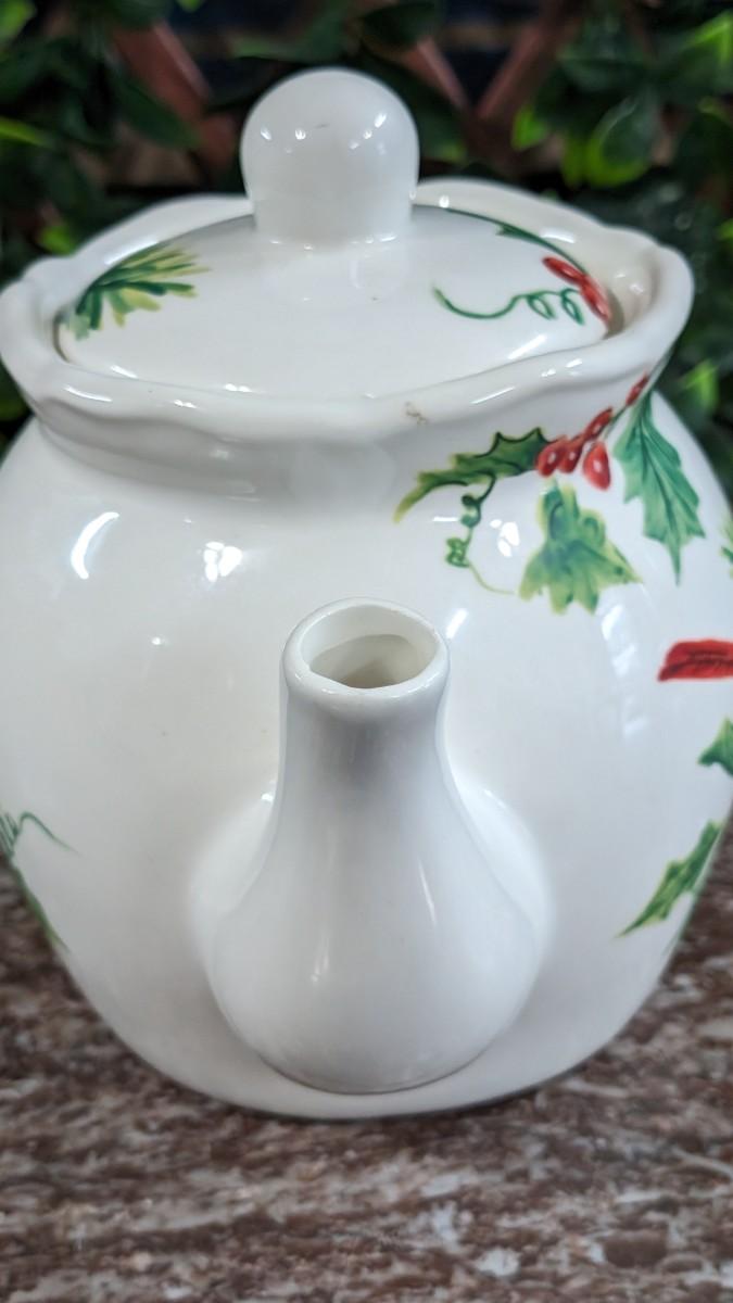 This is a Maxcera Christmas Cardinal Teapot White Porcelain Holly Handcrafted in China. No chips, some wear.