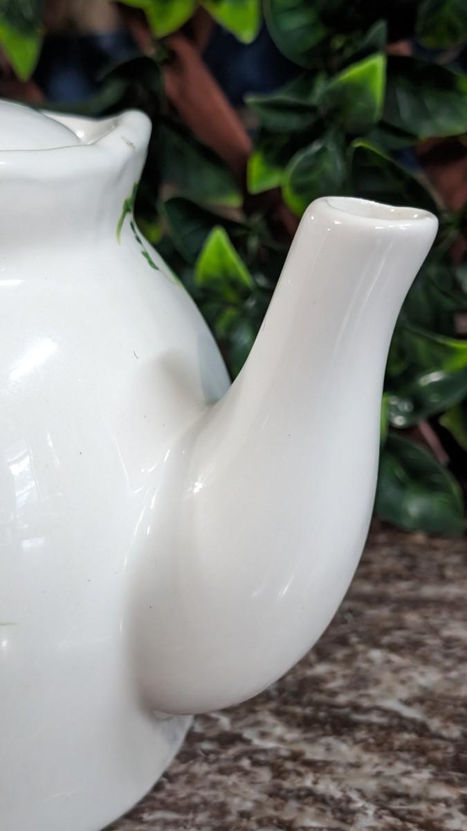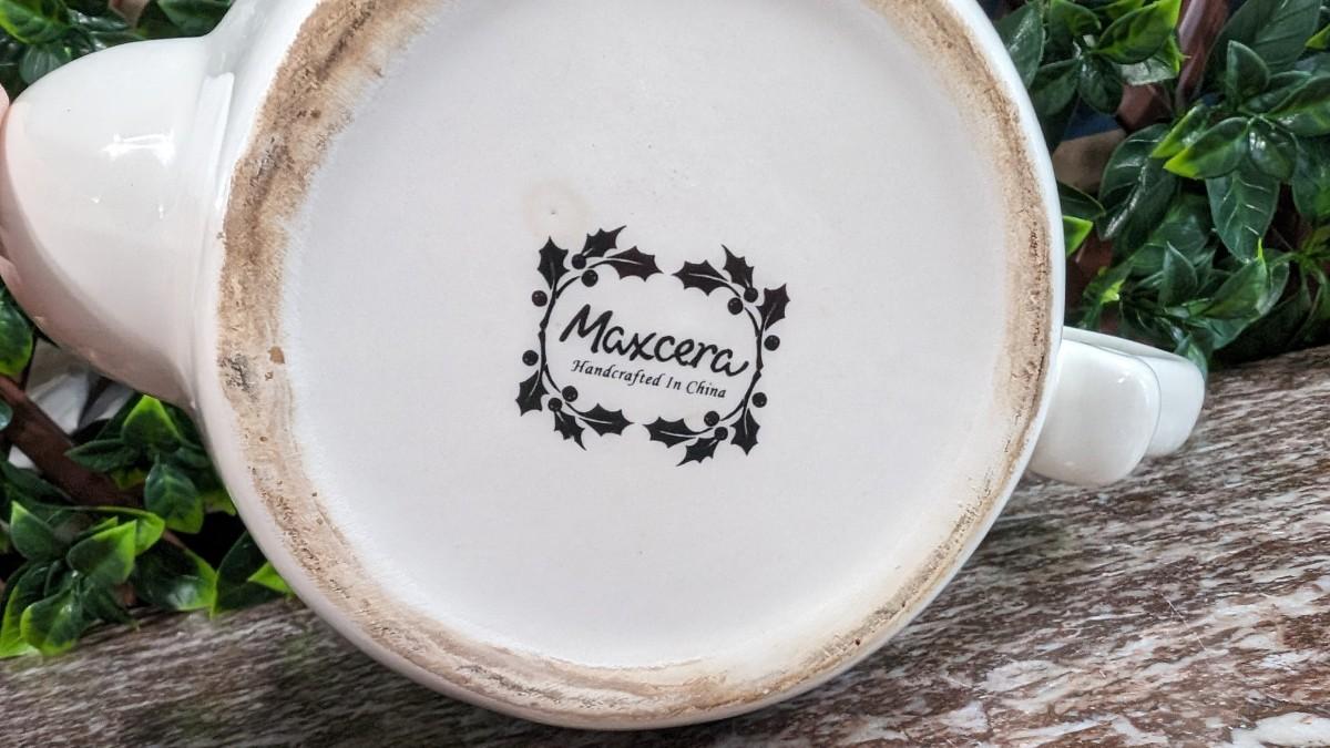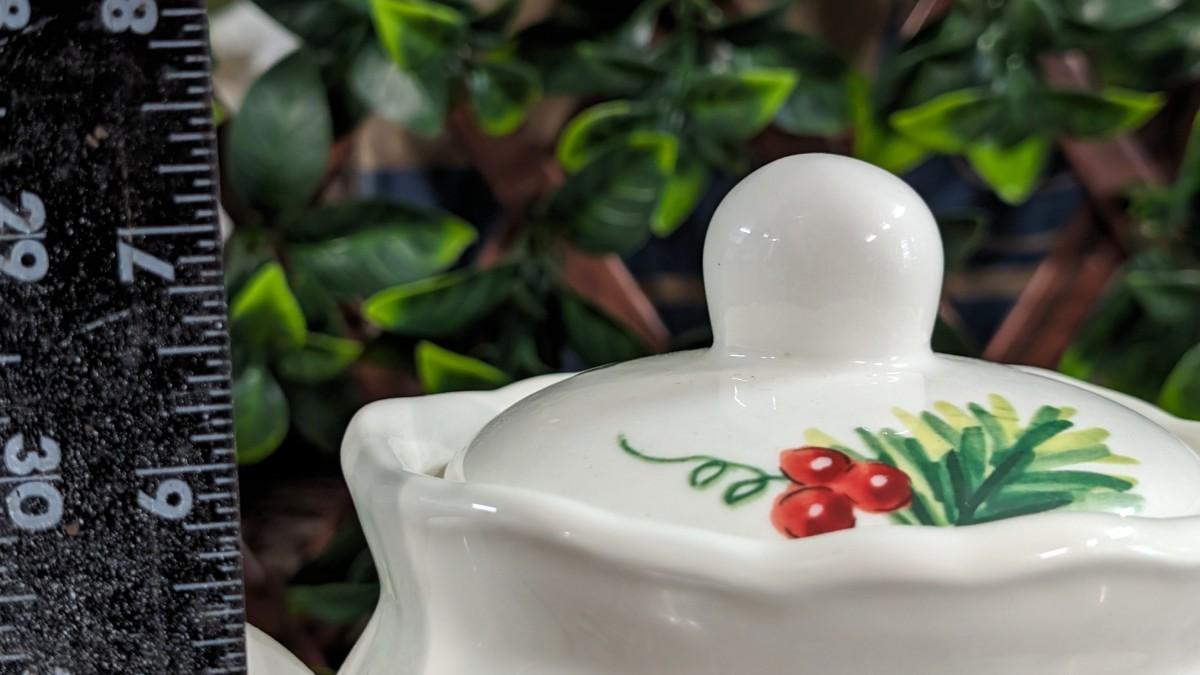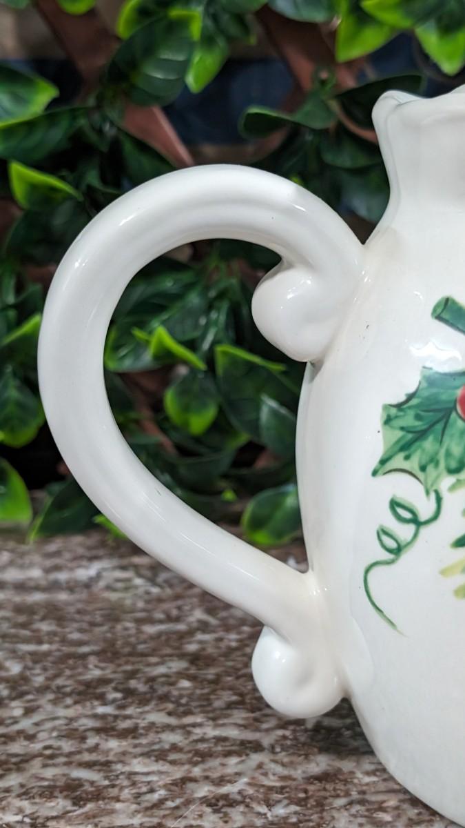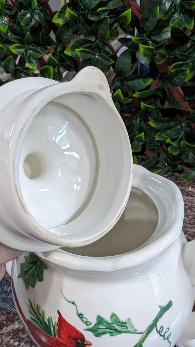 This is a Maxcera Christmas Cardinal Teapot White Porcelain Holly Handcrafted in China. No chips, some wear.