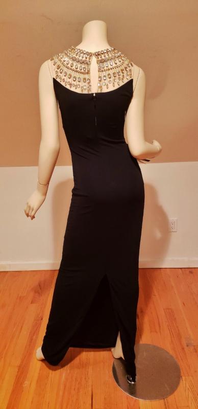 Maxi curvy black gown gold embellished bead neck yoke NWT