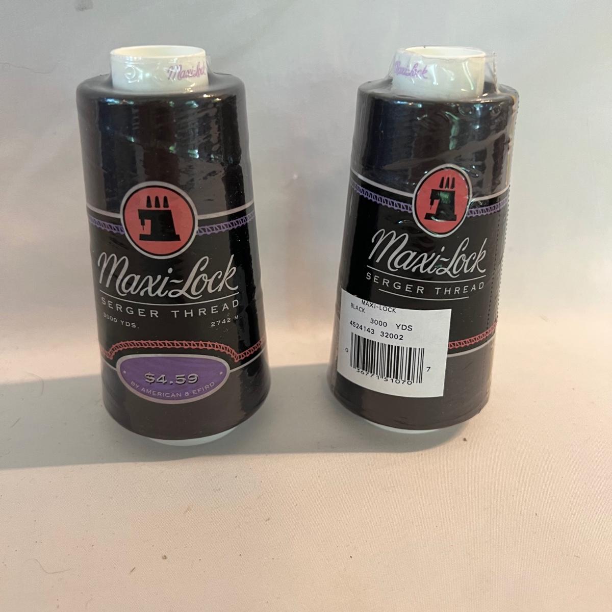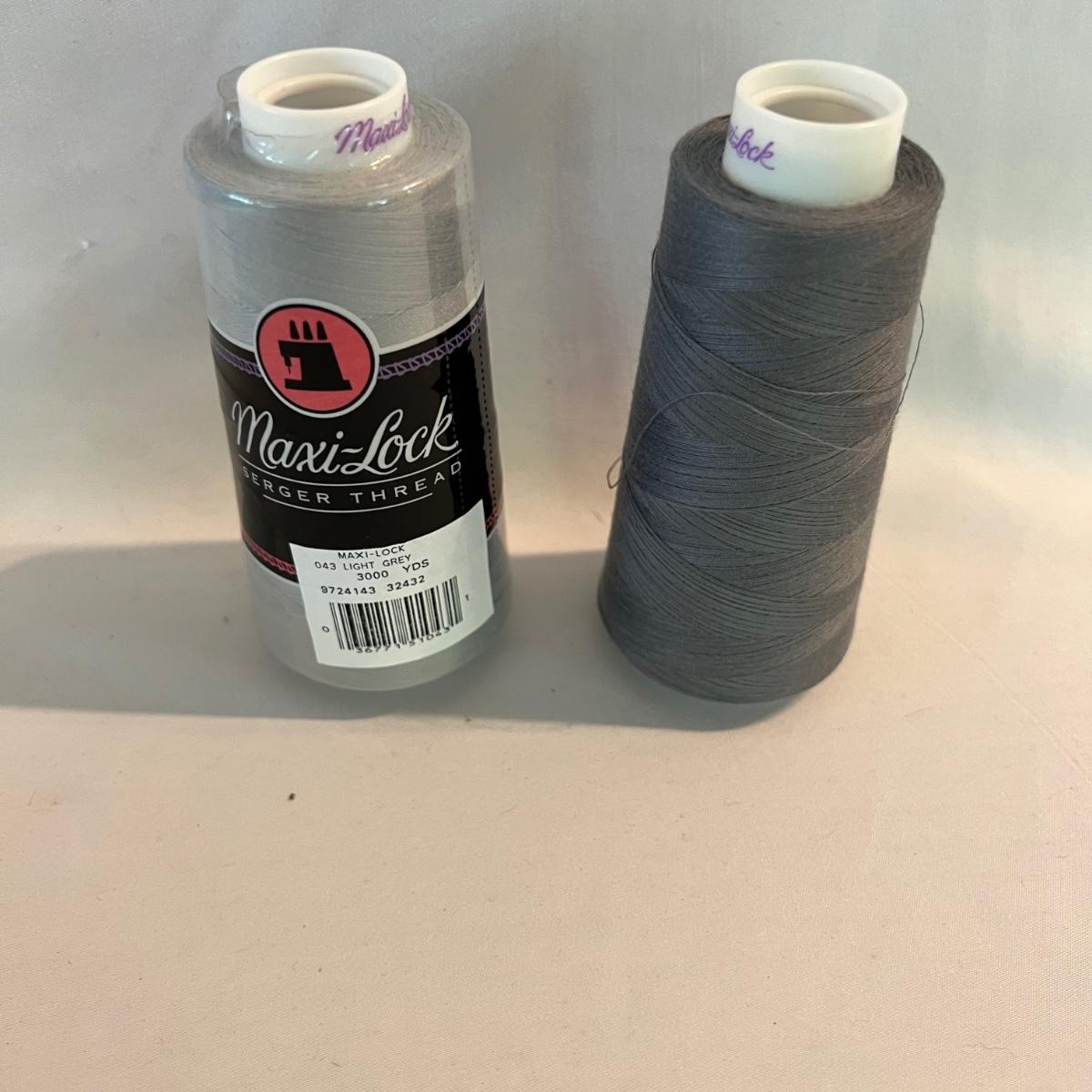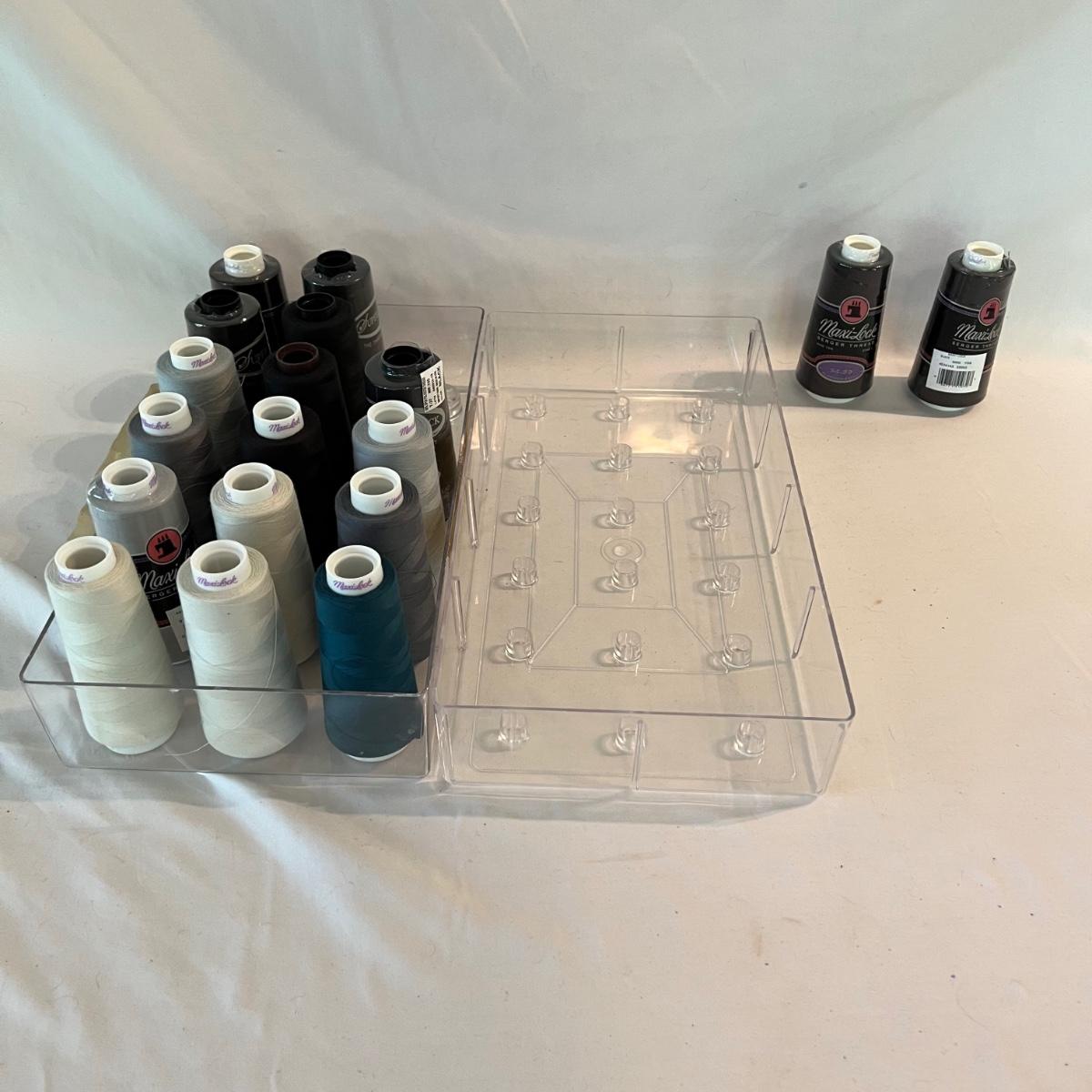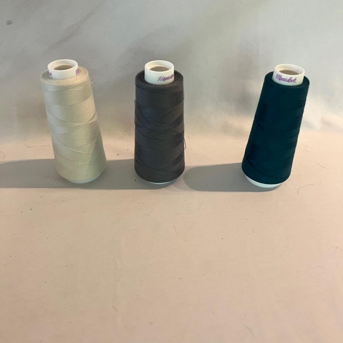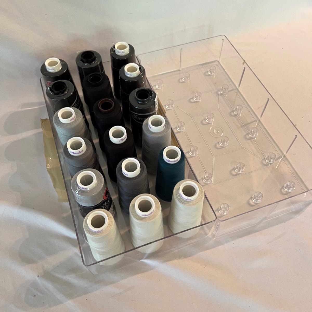 Eighteen spools of thread (each 3000 yards). Six black spooks unopened, the other colors are opened and include gray, dark gray, teal green, and white/cream.