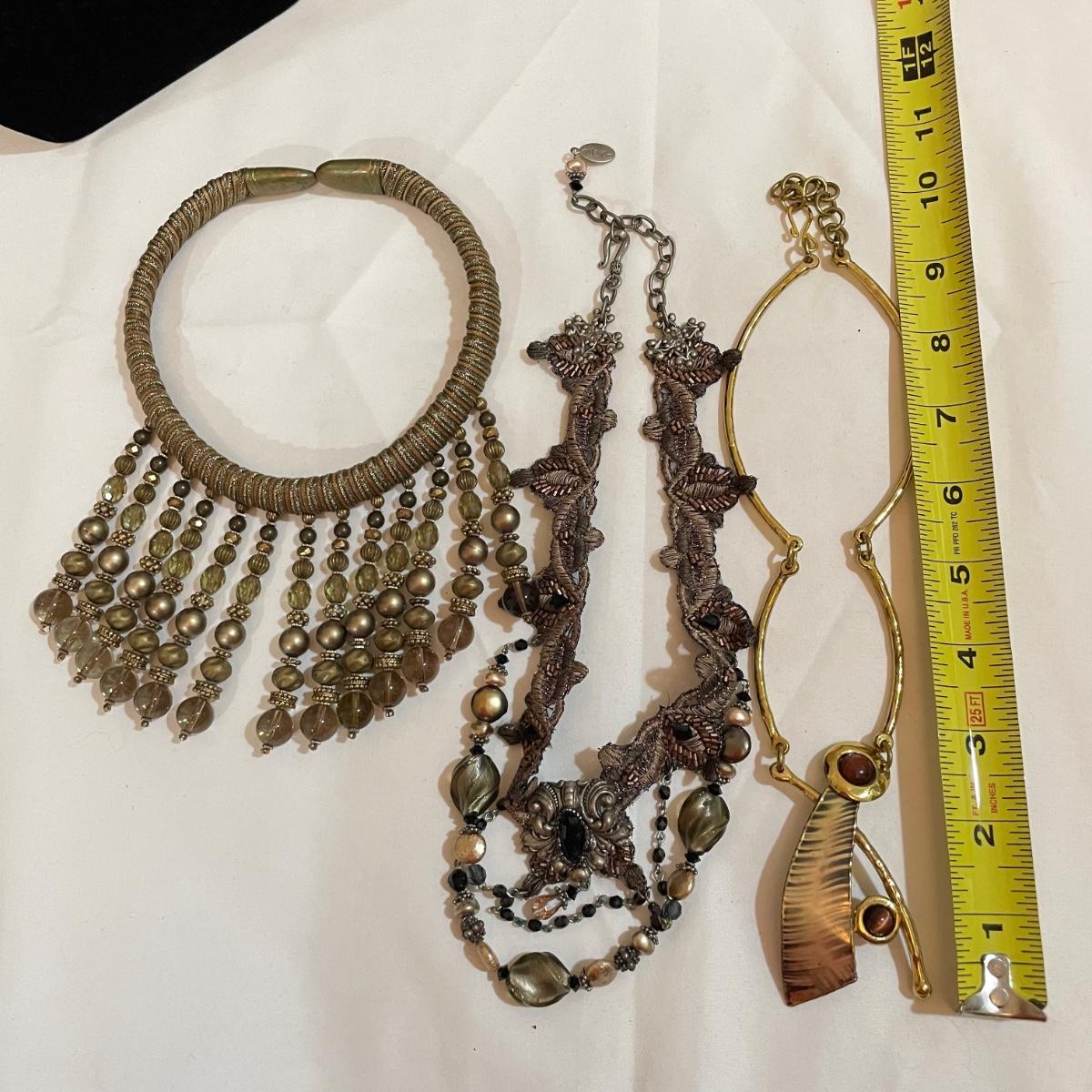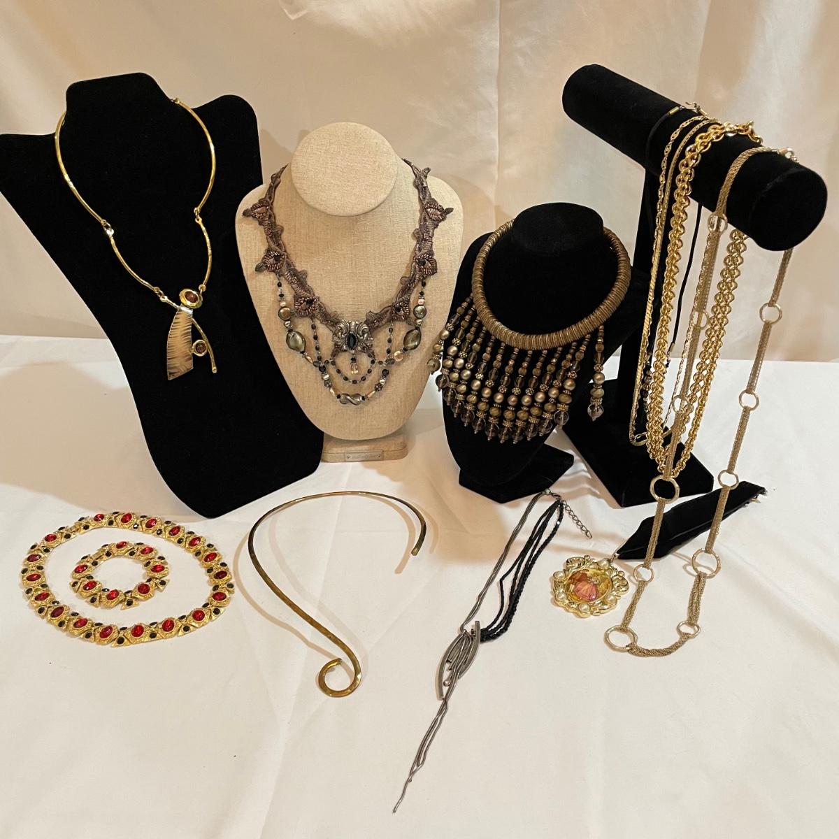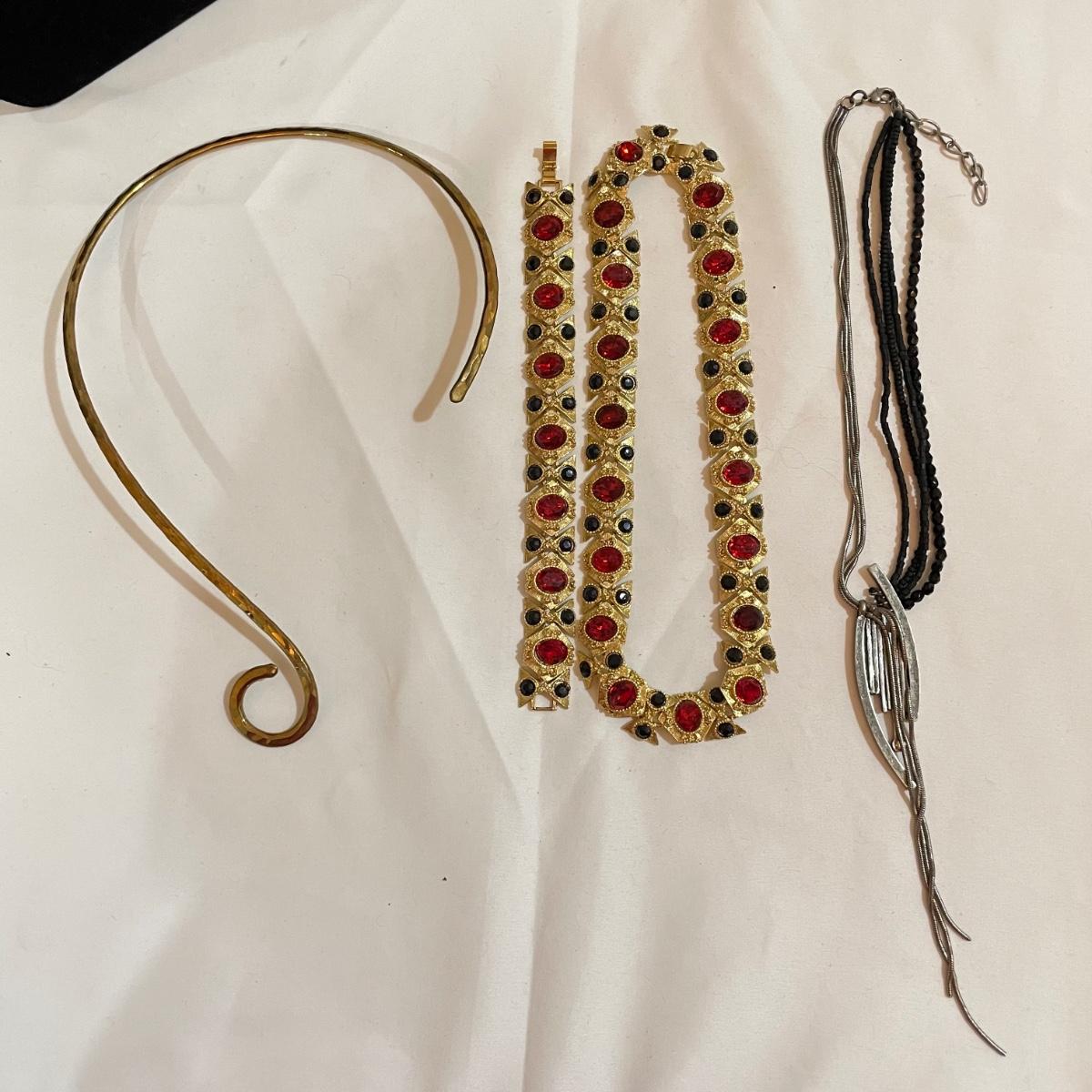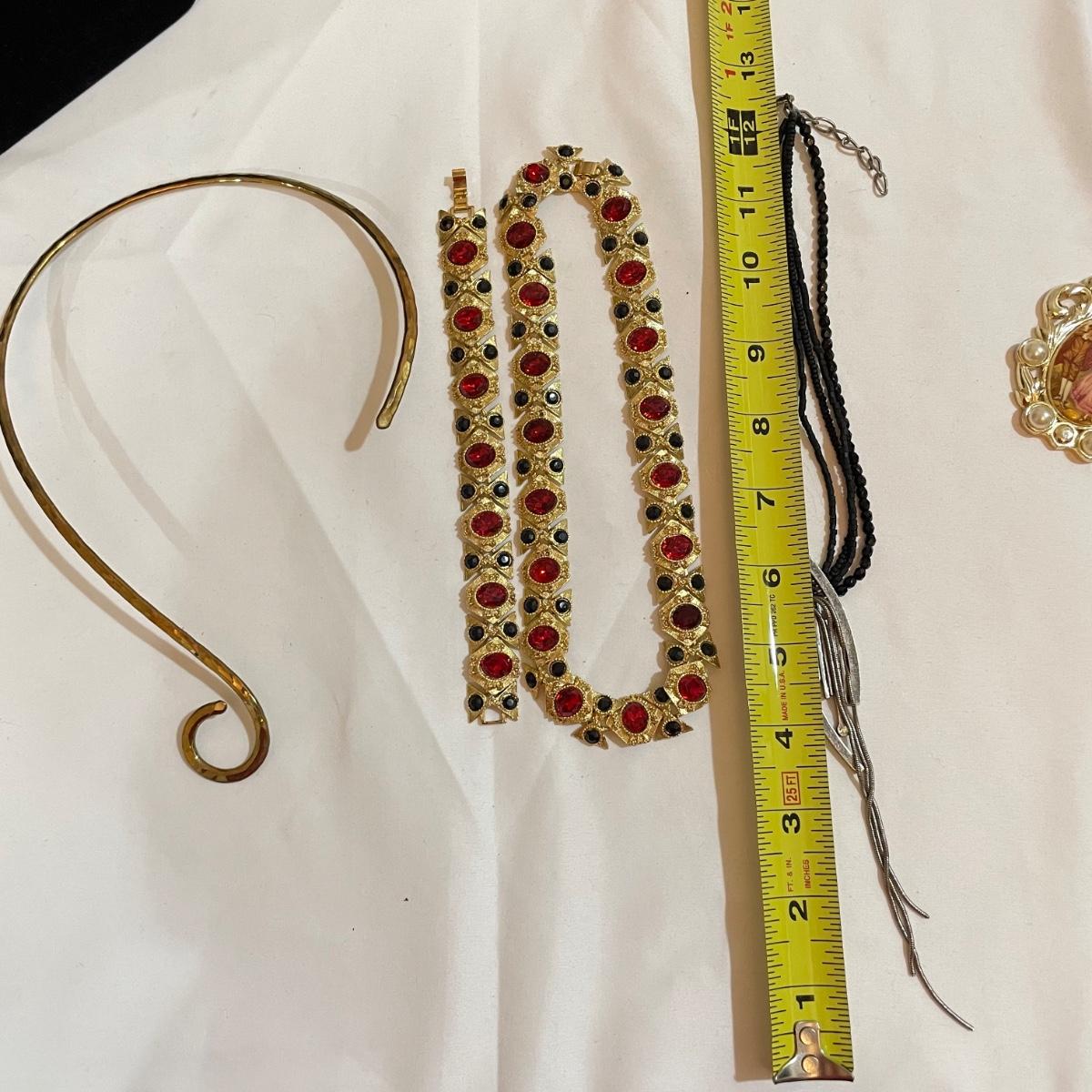 Twelve necklaces featuring a set of bright red and black jewels and what appears to be a Maya hand stitched embroidered necklace with resin beads and metal adornments. Ten other fun and funky necklaces ranging from choker sized to full length. See images. Shipping available. All sales are final. No returns or refunds. Please bid accordingly.