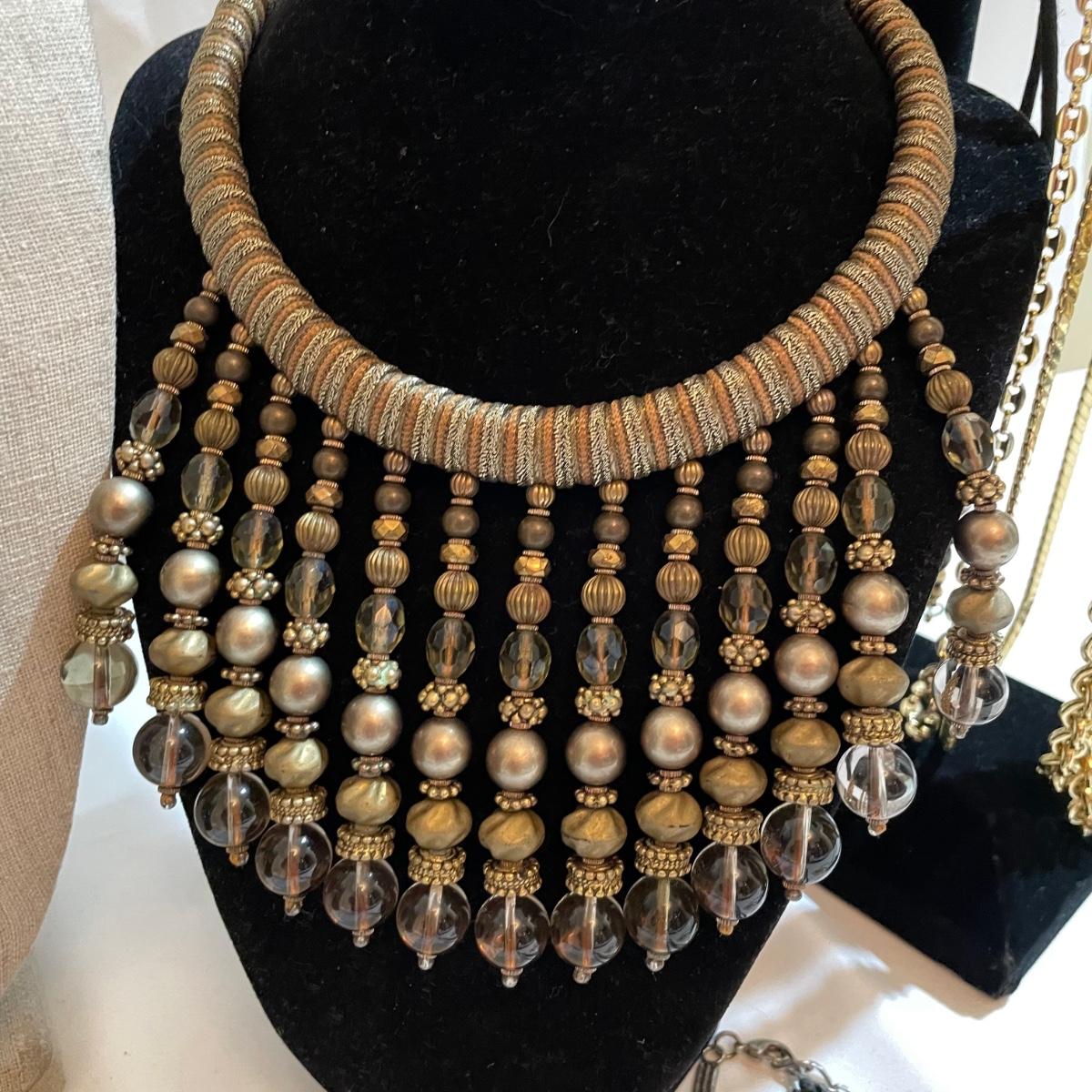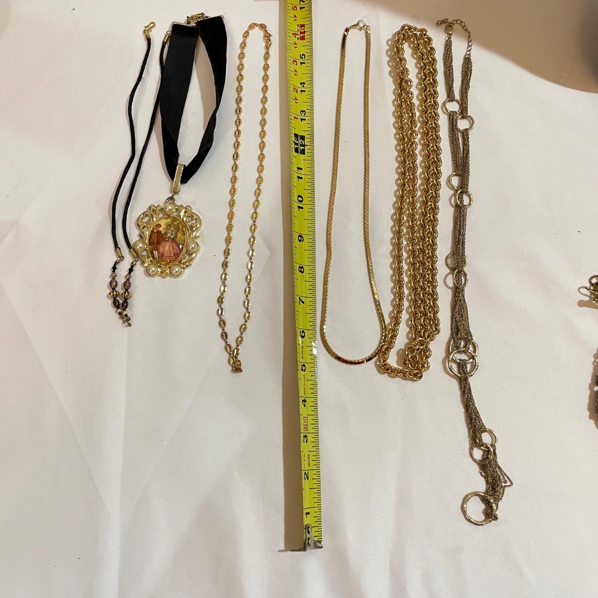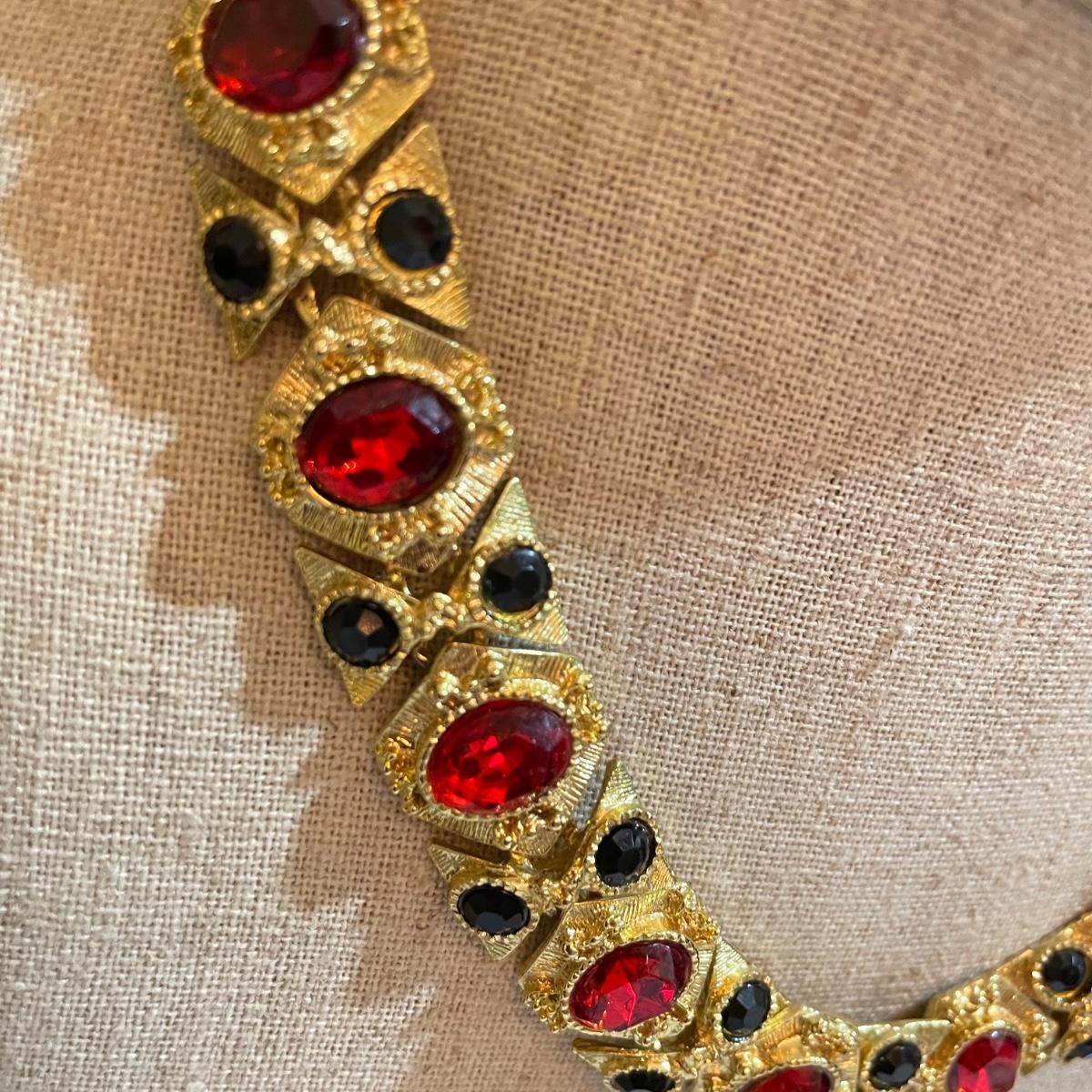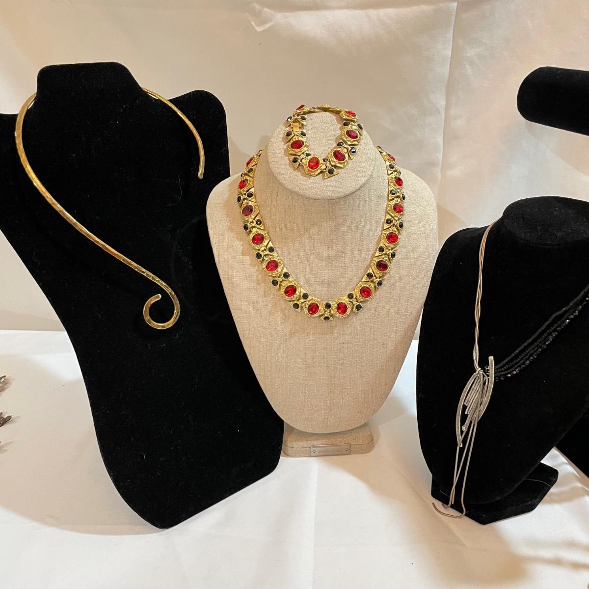 Twelve necklaces featuring a set of bright red and black jewels and what appears to be a Maya hand stitched embroidered necklace with resin beads and metal adornments. Ten other fun and funky necklaces ranging from choker sized to full length. See images. Shipping available. All sales are final. No returns or refunds. Please bid accordingly.