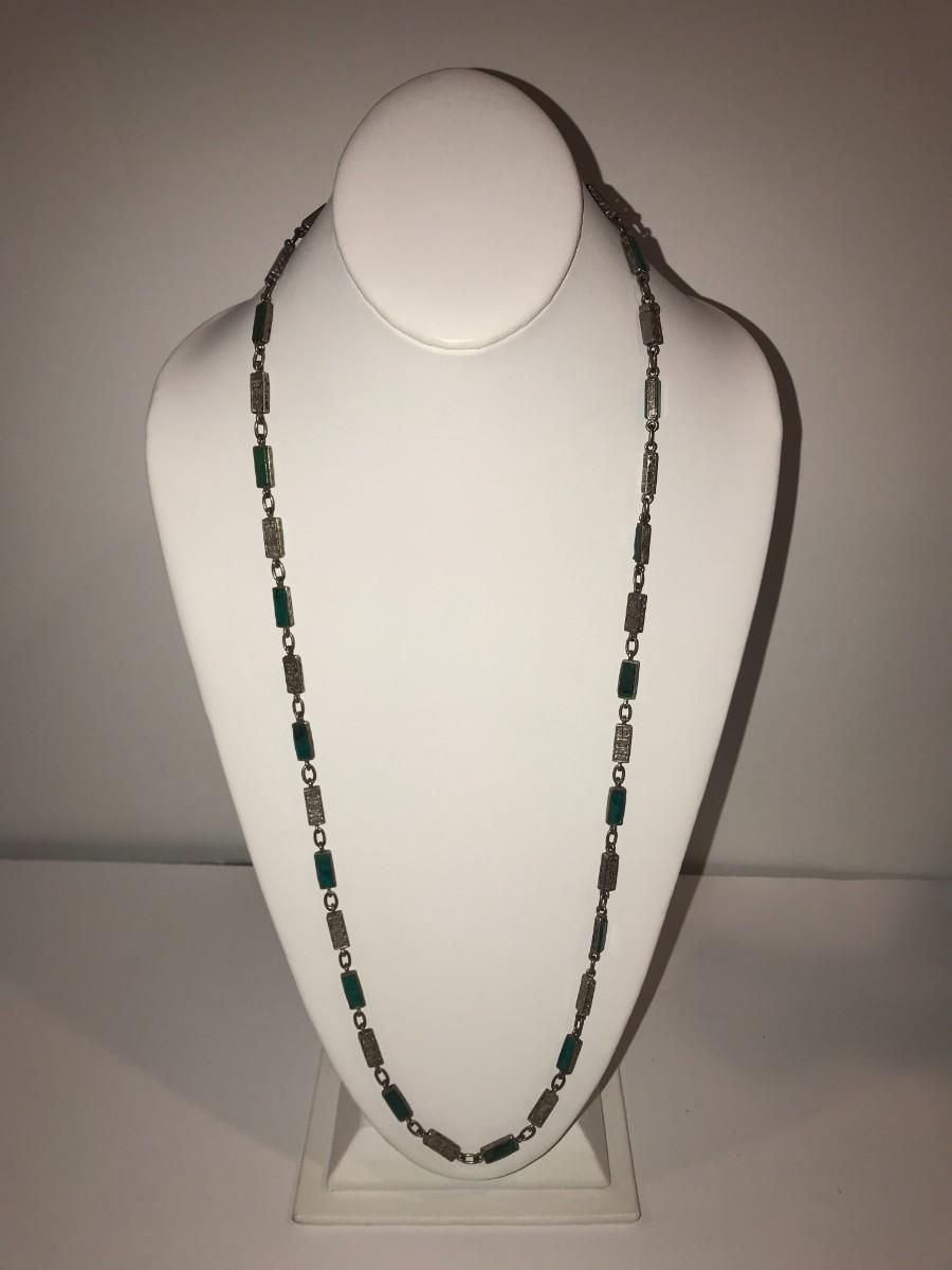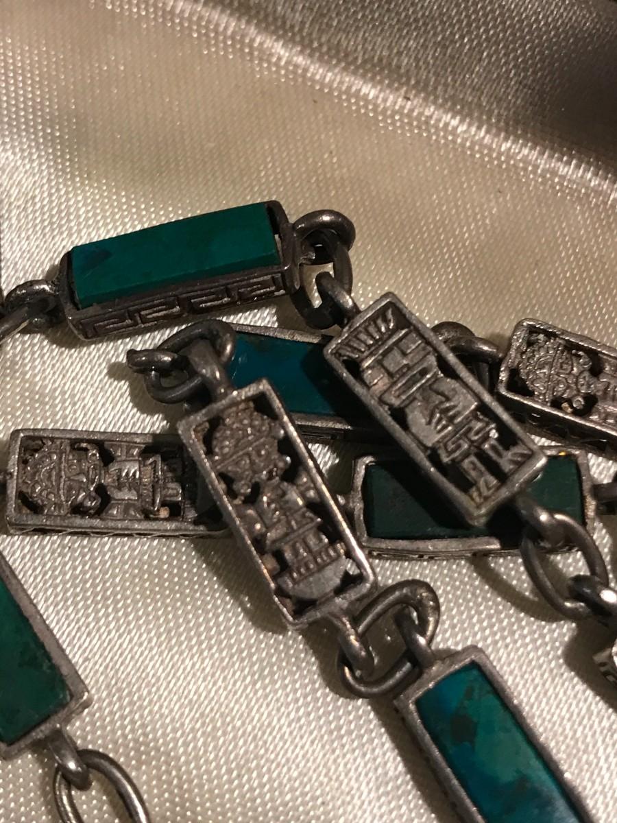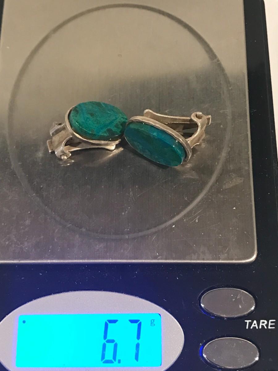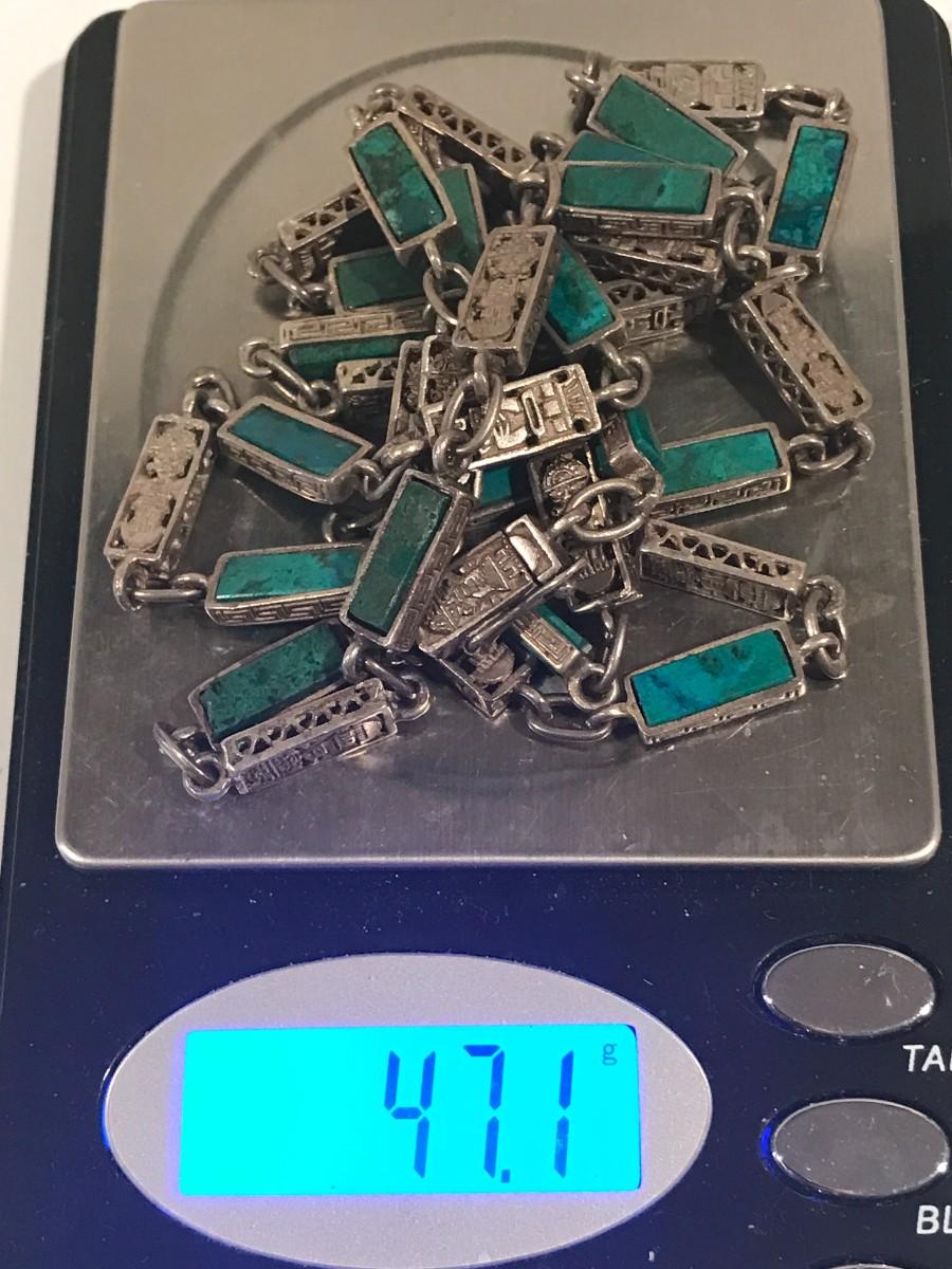 Mayan Malachite & Sterling Long Necklace & Clip on earrings 1960s