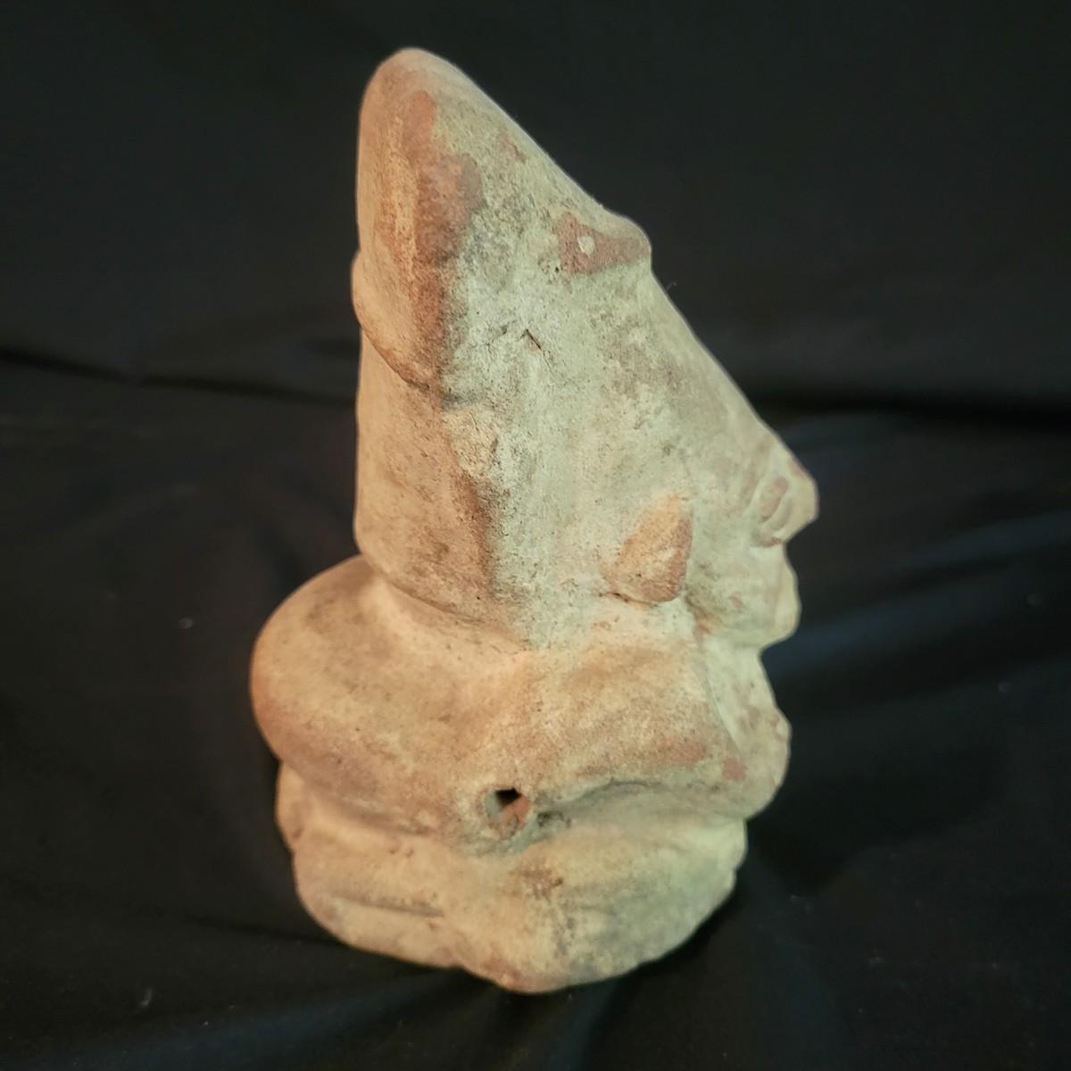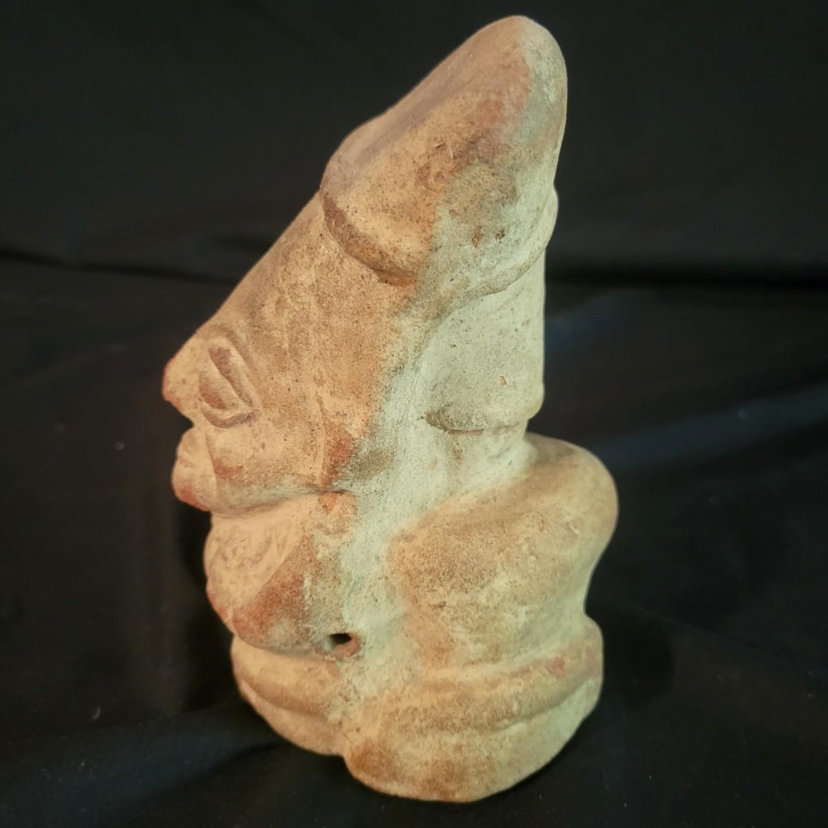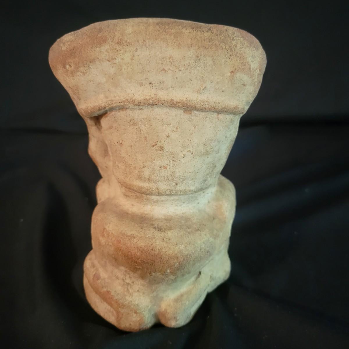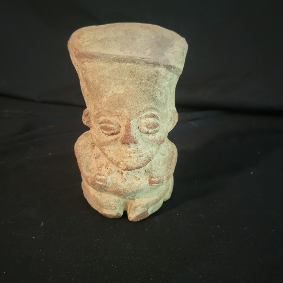 A primitive looking figure that appears to made of fired clay. It is styled in a pre Columbian Mayan potting style. It measures approximately 3.5" x 4" x 6.5"H. Shipping available