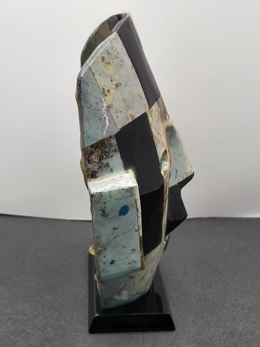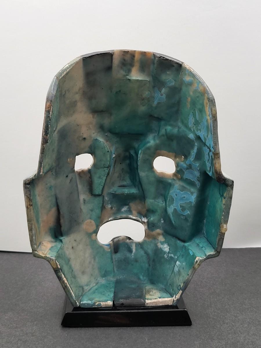 Decorative Mayan tribal mask attached to black display stand. Measures 8" x 6", glazed inlay pieces.