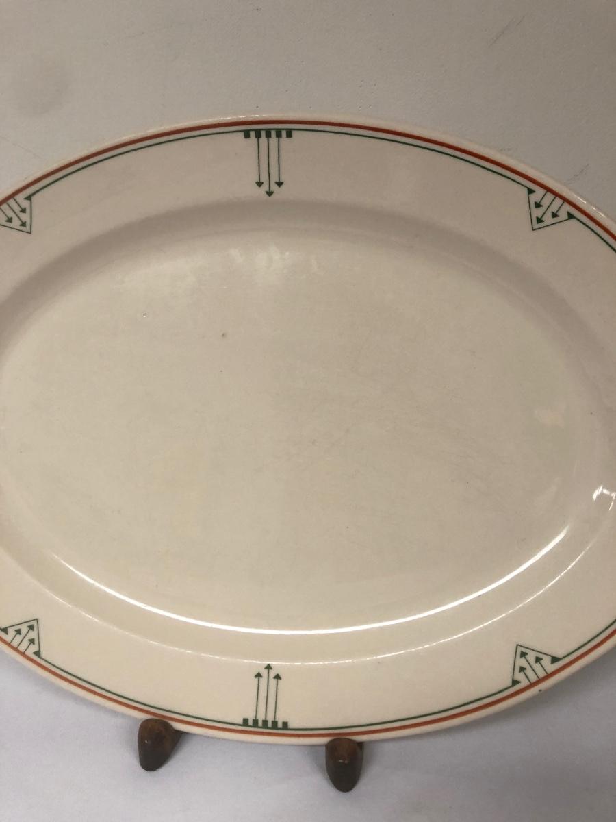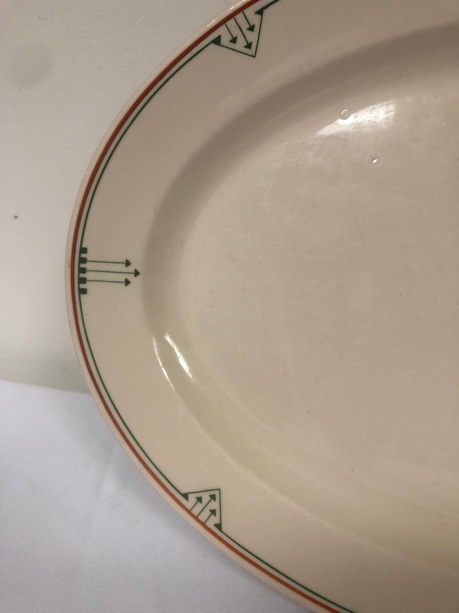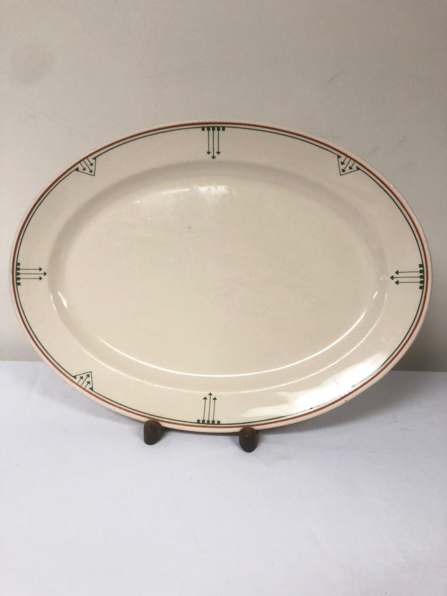 This platter measures 16” x 12”. It has no apparent chips or cracks. Note the arts and crafts design. Shipping Available.