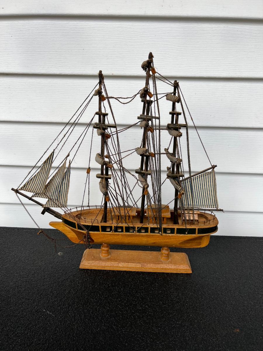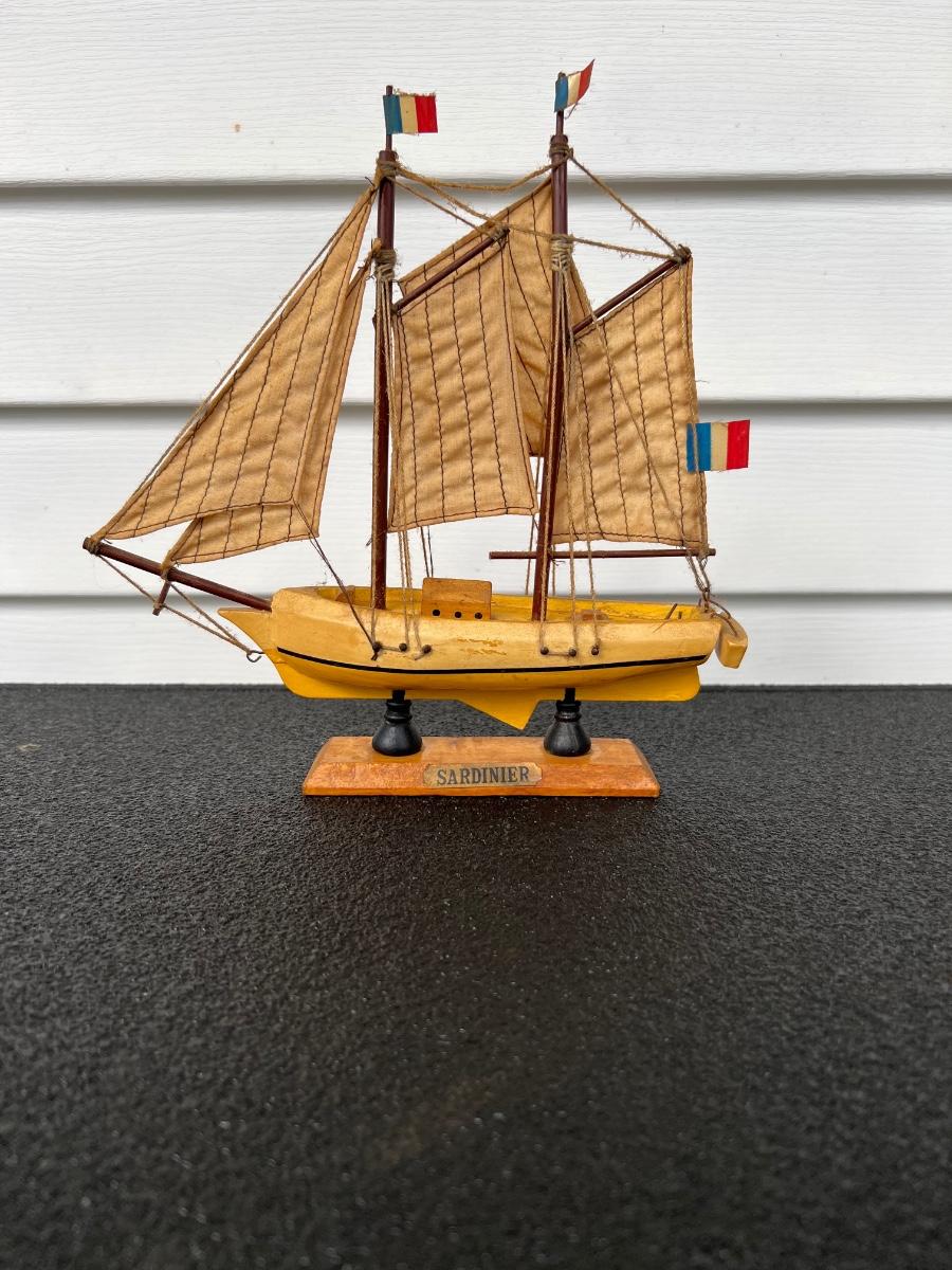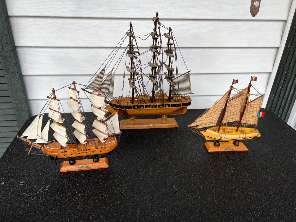 Lot of boats MAYFLOWER measures 9 1/2 inches tall, 9 1/2 inches long, and 2 inches wide. SARDNIER measures 9 inches tall, 8 1/2 inches long, and 2 inches wide. Unknow largest boat measures 14 inches tall, 14 inches long, and 2 inches wide.