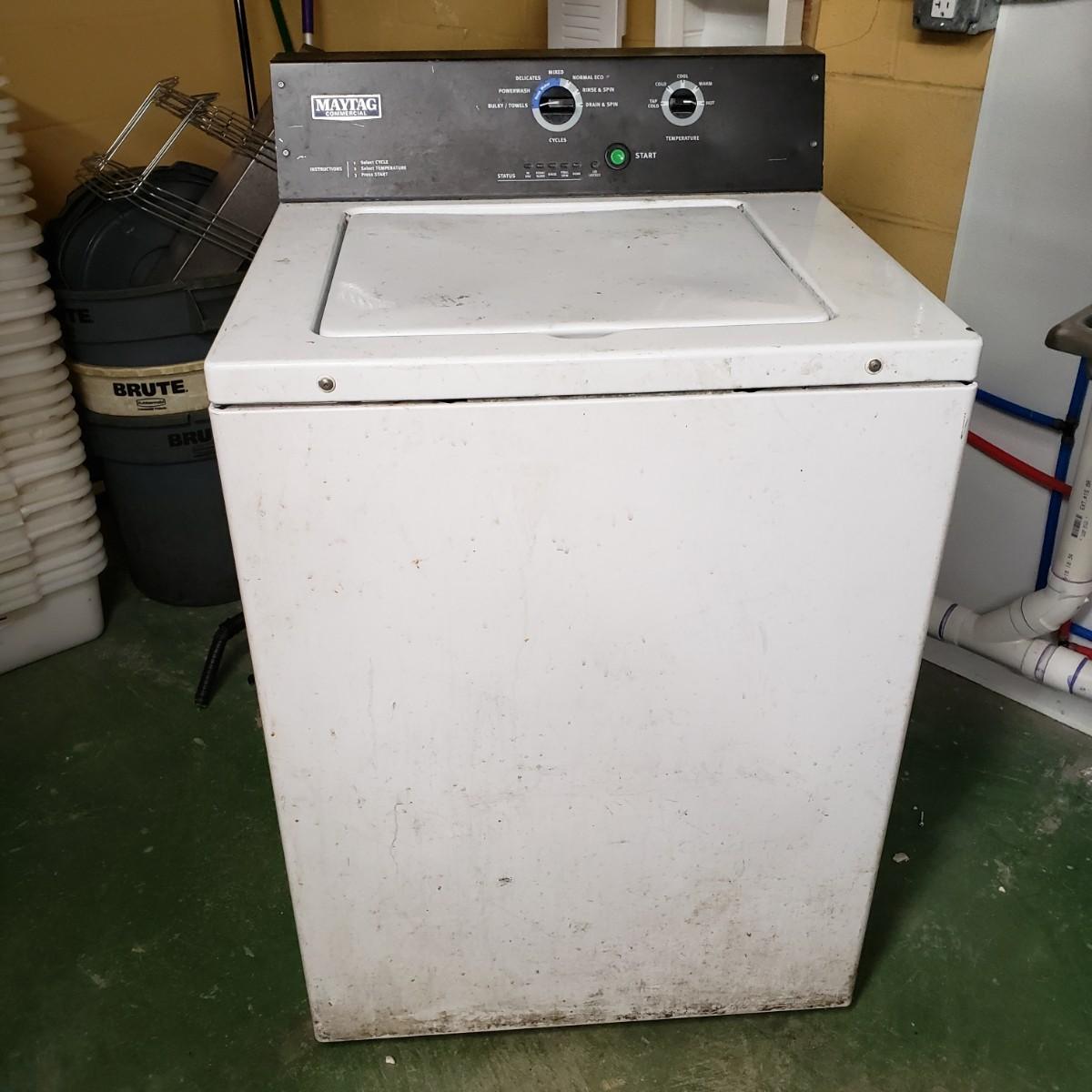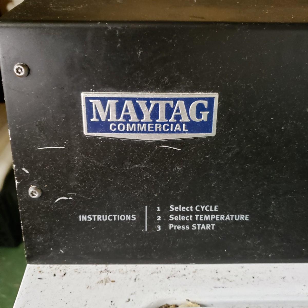 This lot is a Maytag Commercial washing machine. We could not find a serial/model number tag on the machine. This machine was used in a restaurant/bar setting. The outside has some rusting at the very bottom. The inside tub shows signs of wear and use. Item was tested and did not turn on. Measures approximately 27" x 26" x 43". Local pick up only. The winning bidder will need to bring help to load this item. There is easy access to load this item into your vehicle through a door in the room it is located in to the parking lot. It will not have to be moved up or down any stairs