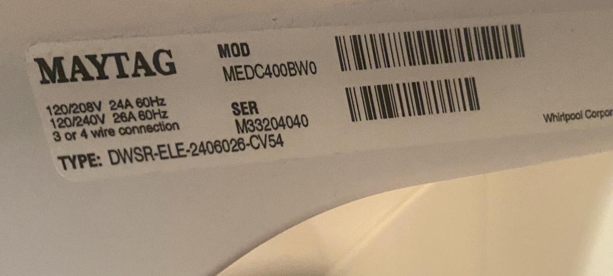 Model: MEDC400BWO https://www.maytag.com/content/dam/global/documents/201707/UseandCareGuide-W10562354-RevC.pdf