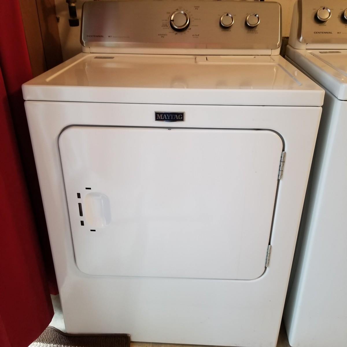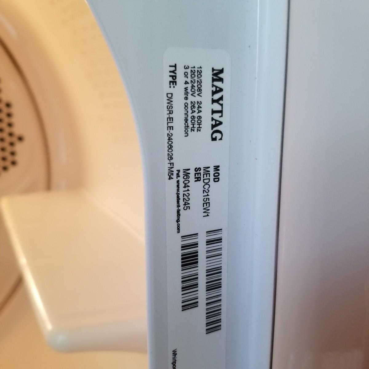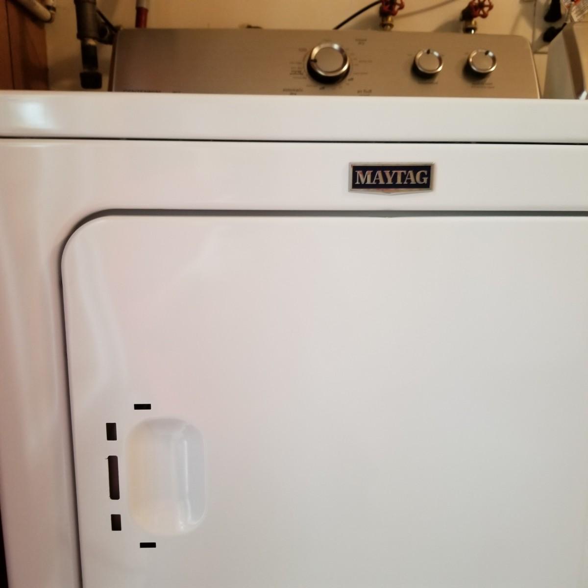 Very clean Maytag dryer. Front load, white with silver panel. Comes with additional lint screen. Front door is missing handle. Tested working. 29"x26"x42". Companion washer available separately. See photos for details. Local pickup only, bring assistance to move.