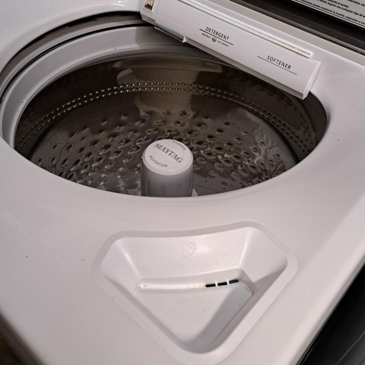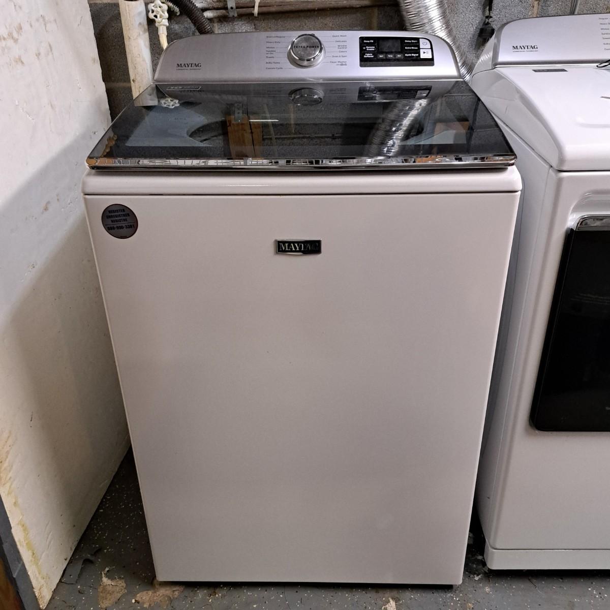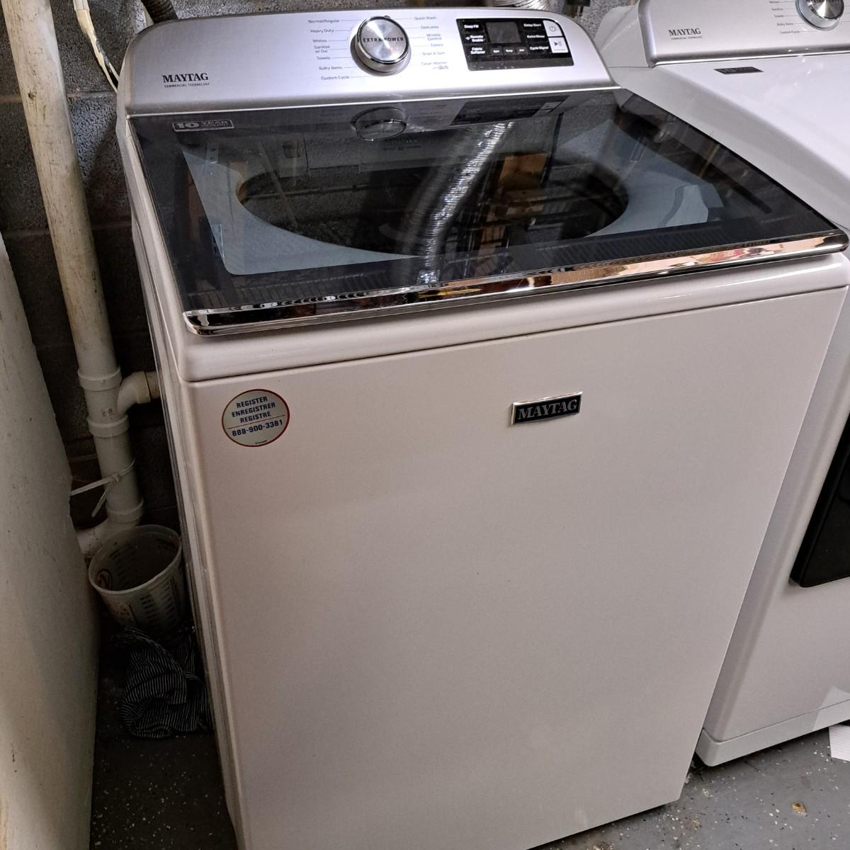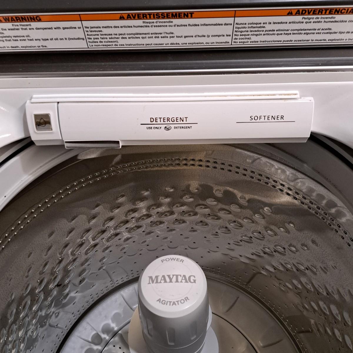 Maytag top loading electric washing machine. Dimensions are 26" x 27" x 43"H to top of control panel. Powered on when started, but a load of laundry was not run. Local pickup only. Winning bidder must bring assistance to help move and load this item due to its weight and/or size.