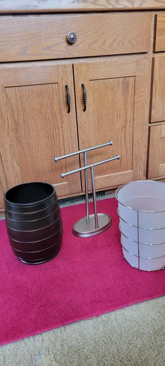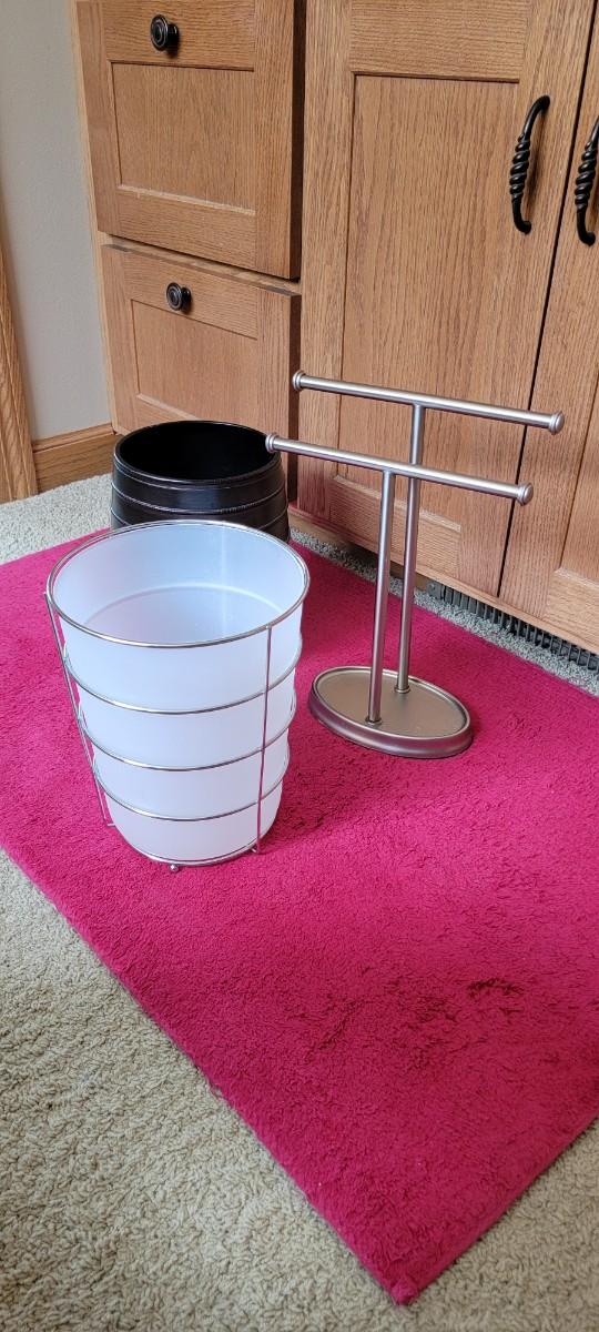 MB-25 white plastic/silver wastebasket, brown barrel like wastebasket, silver color towel rack. Plus three red rugs.