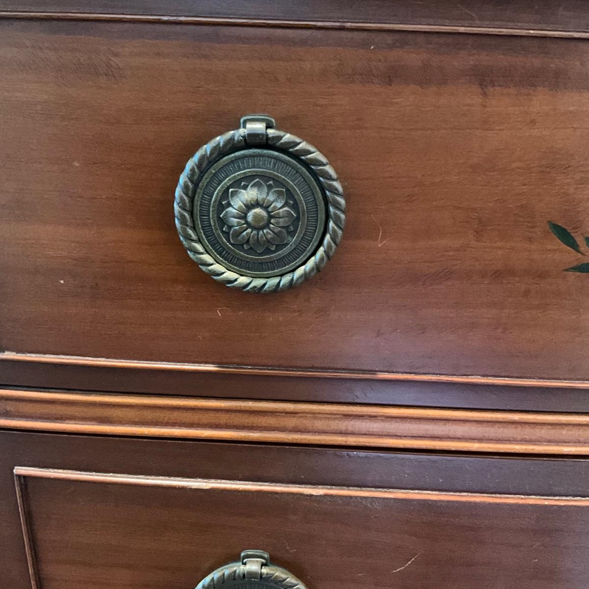 Hand painted front and accents of Tureen with leaves on front, top drawer, and sides.