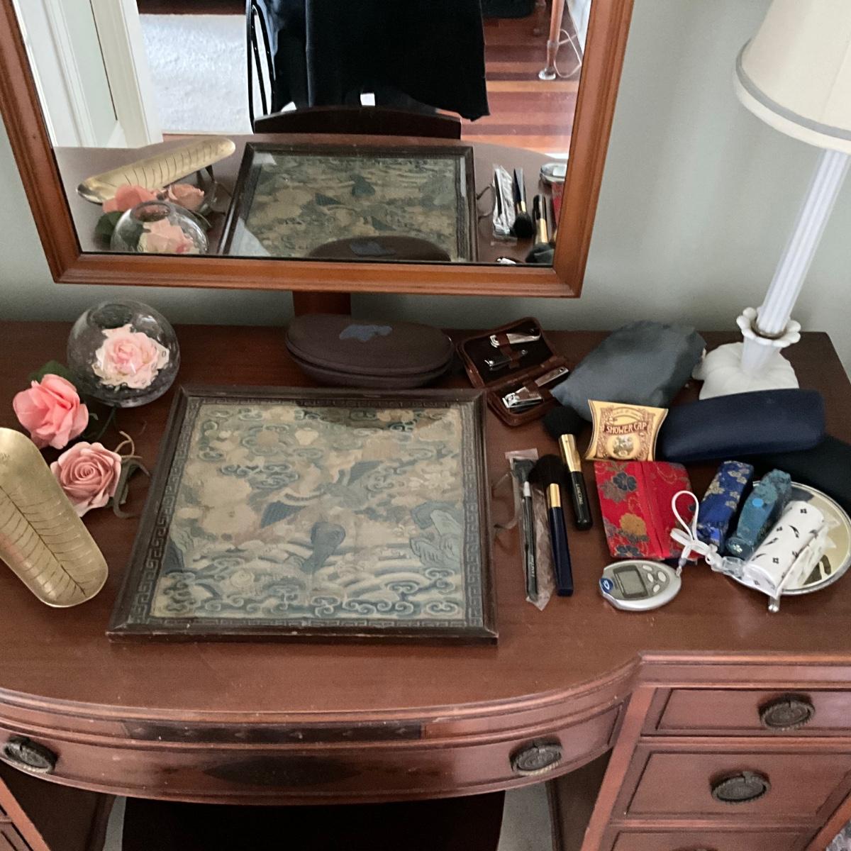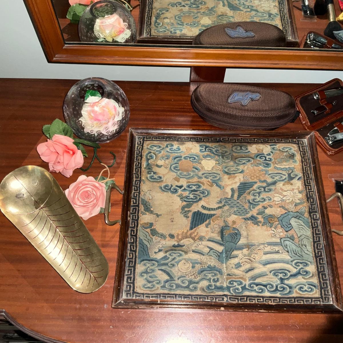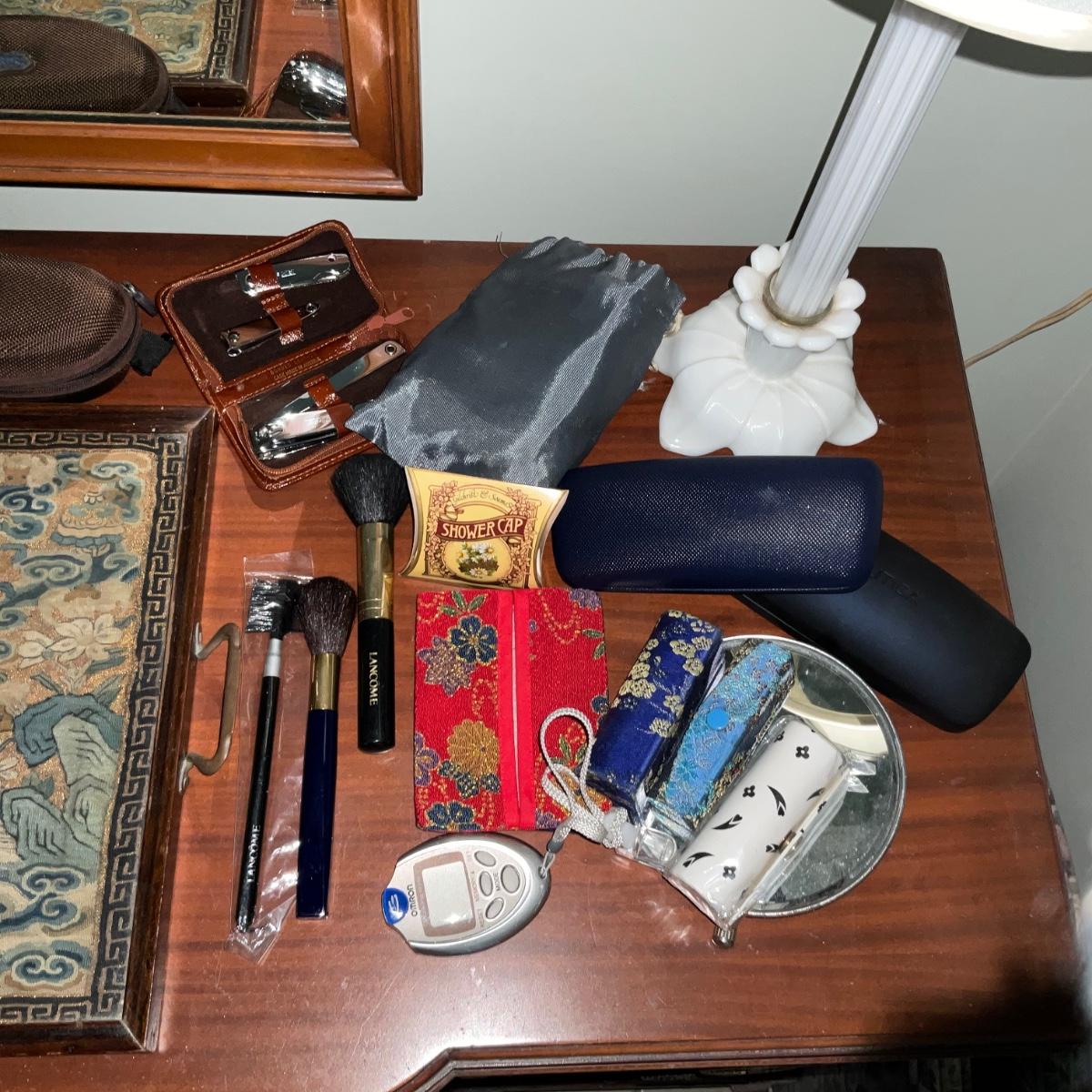 MB1918 Lot of Vanity Tray with Glass Rose, Makeup Holder, Brushes, Glass Cases