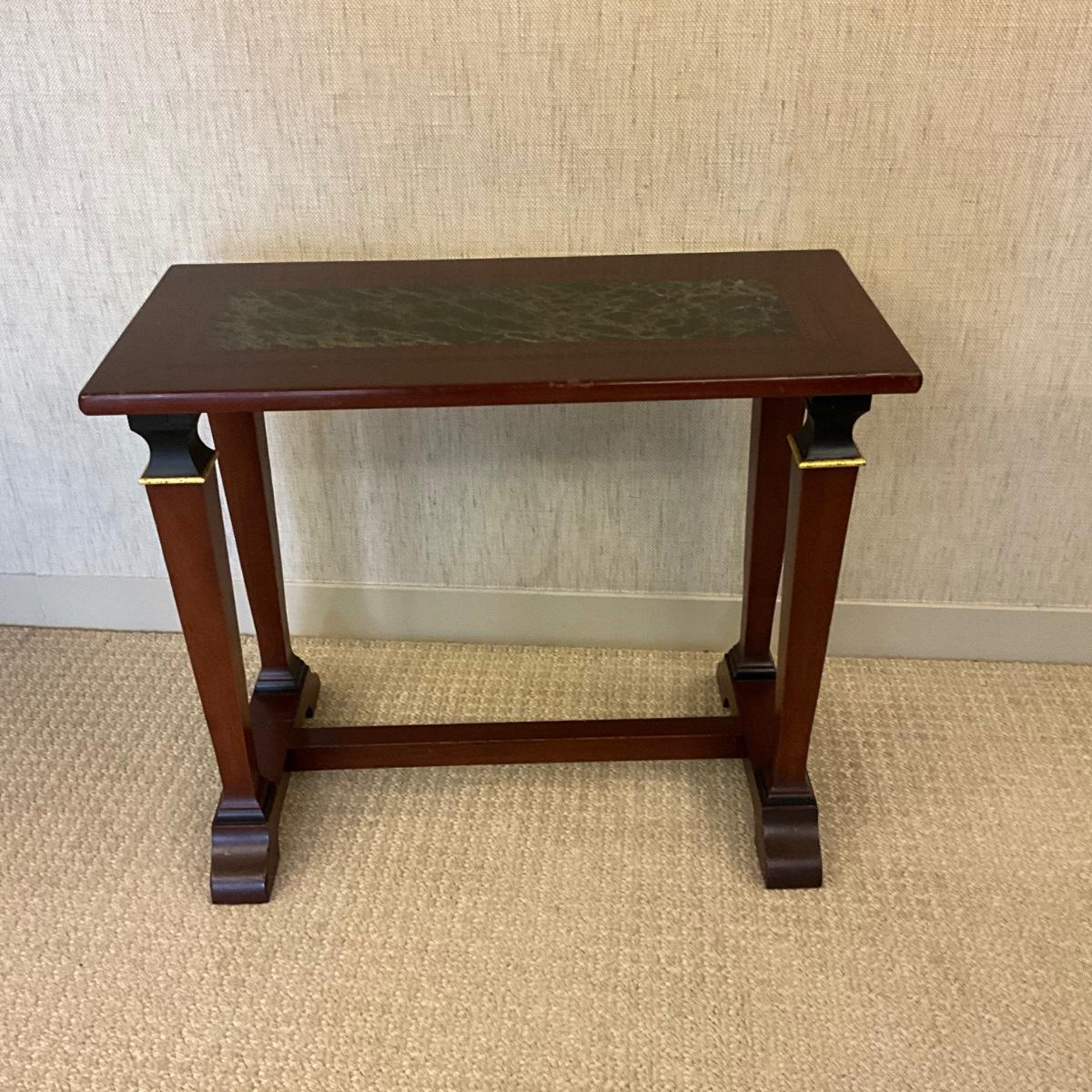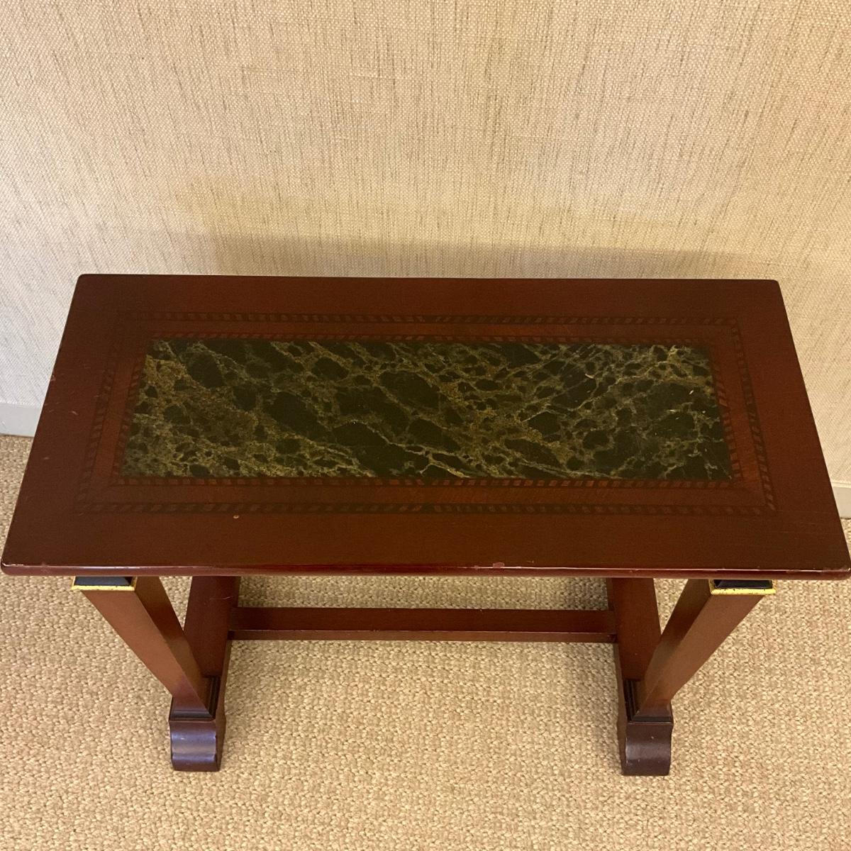 Painted to imitate mitered top with inlay and mahogany marble center