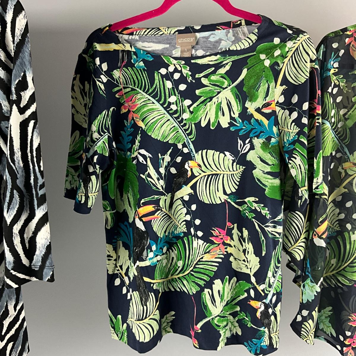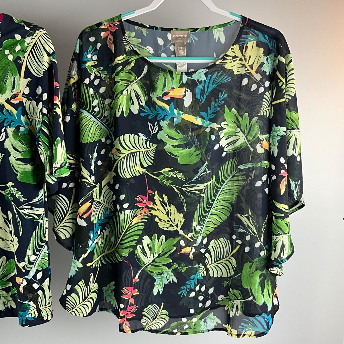 Two tropical tops that are identical one is sheer and one is mixed blend size 2