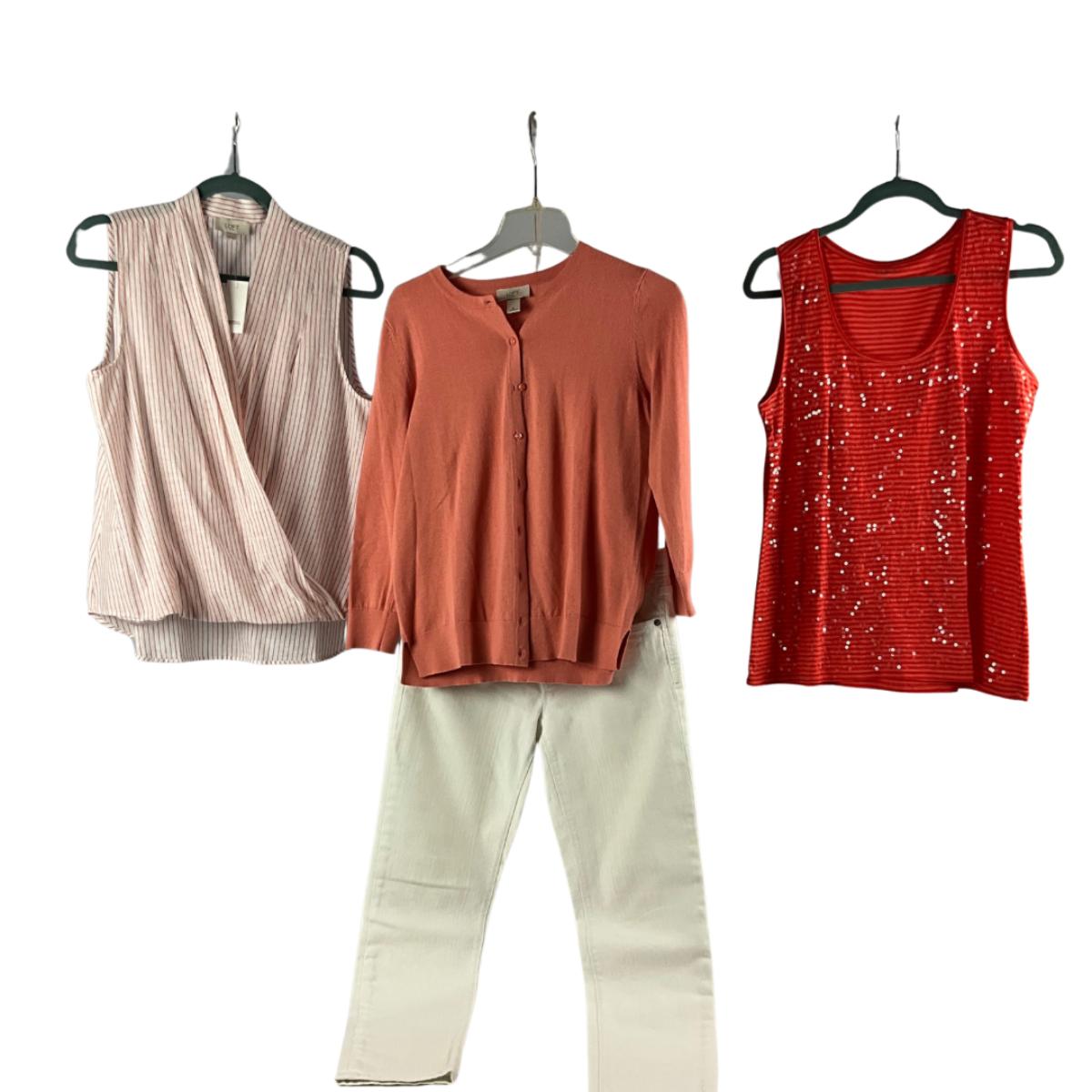 One top is new with tag and size Small , two other tops are size medium, and pants size 4