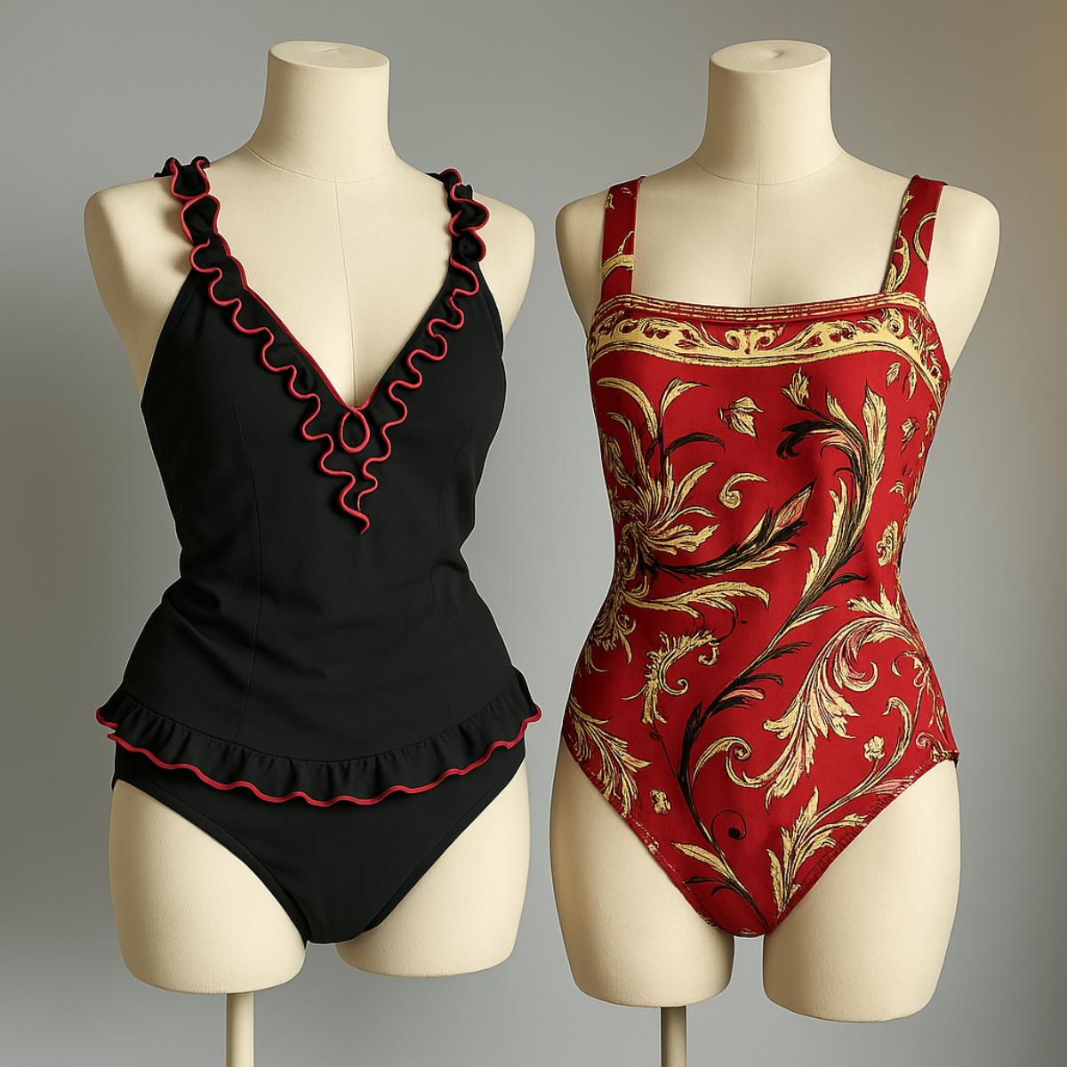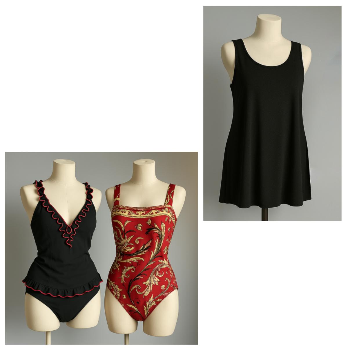 J. Valvie Cover up in black size med, Black with pink edge ruffle two piece size 8, full one piece Jantzen size 12