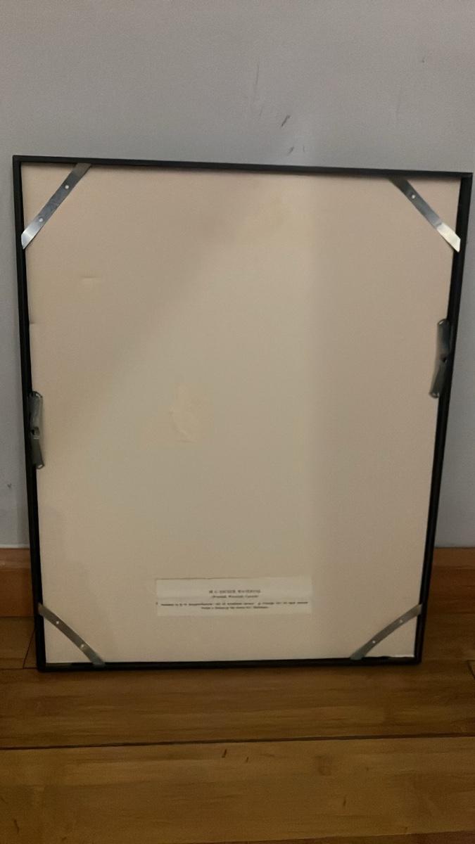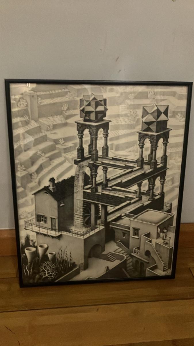 Iconic vintage offset lithograph reproduction of M.C. Escher's masterpiece Waterfall (1961), one of the artist's most celebrated impossible constructions depicting a paradoxical perpetual motion waterfall based on the Penrose triangle. This authorized 1971 edition was published in Holland (likely by Reprinter Reproductions under the M.C. Escher Foundation, with G.W. Breughel copyright). Plate-signed and dated in the image lower right: "X-61" with MCE monogram. Printed in sharp black-and-white on quality paper, professionally framed in a simple black frame. Excellent vintage condition with no fading or damage visible. A timeless piece of optical illusion art, perfect for modern, mid-century, or surrealist decor. Frame measures 16.5" × 20.5"