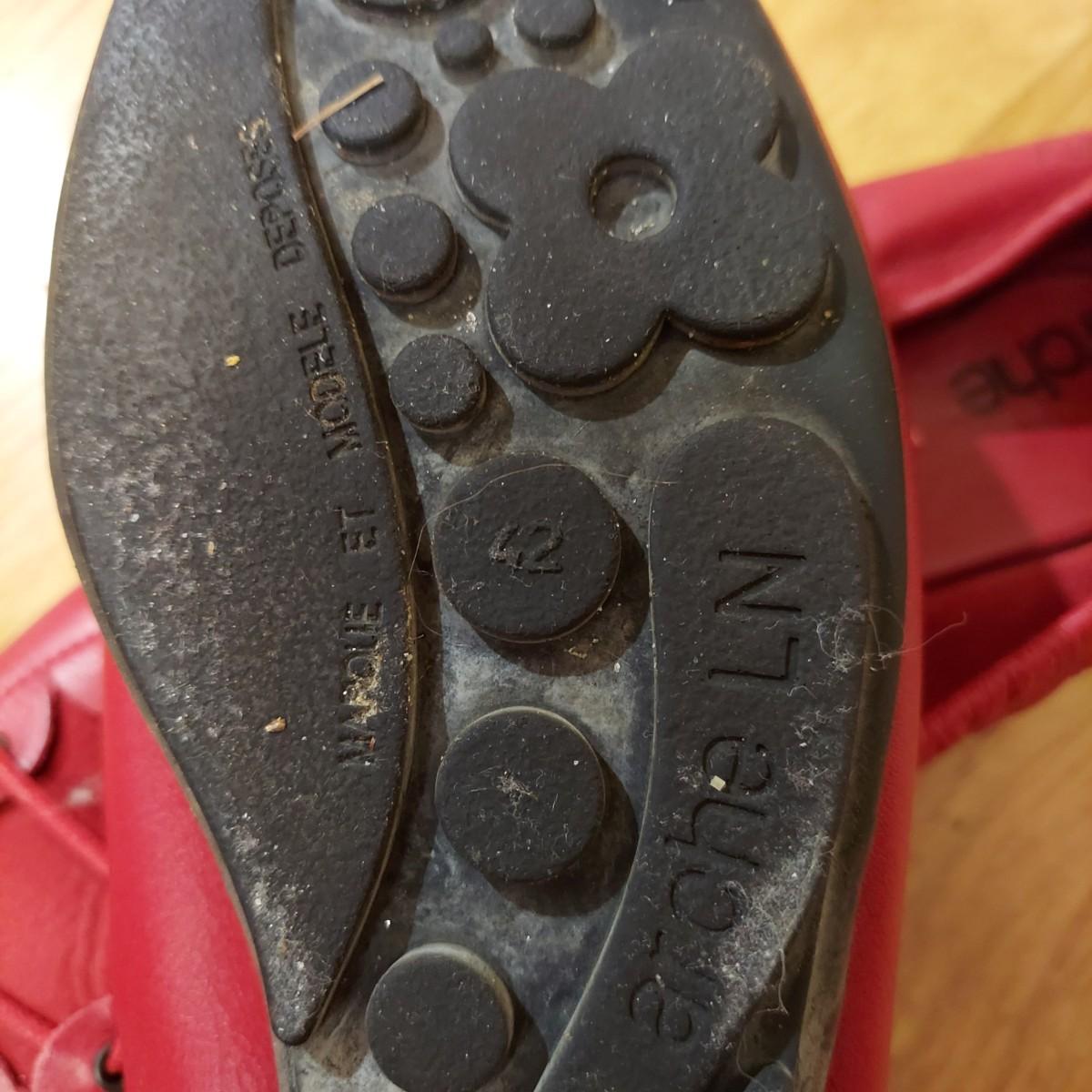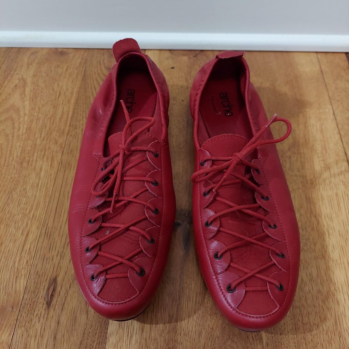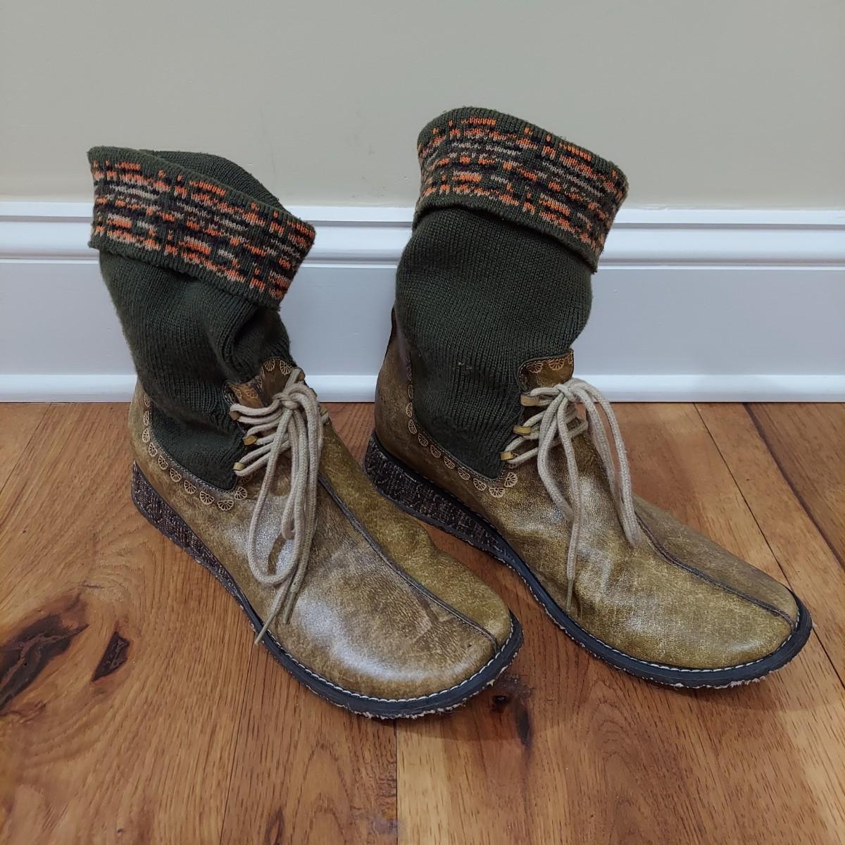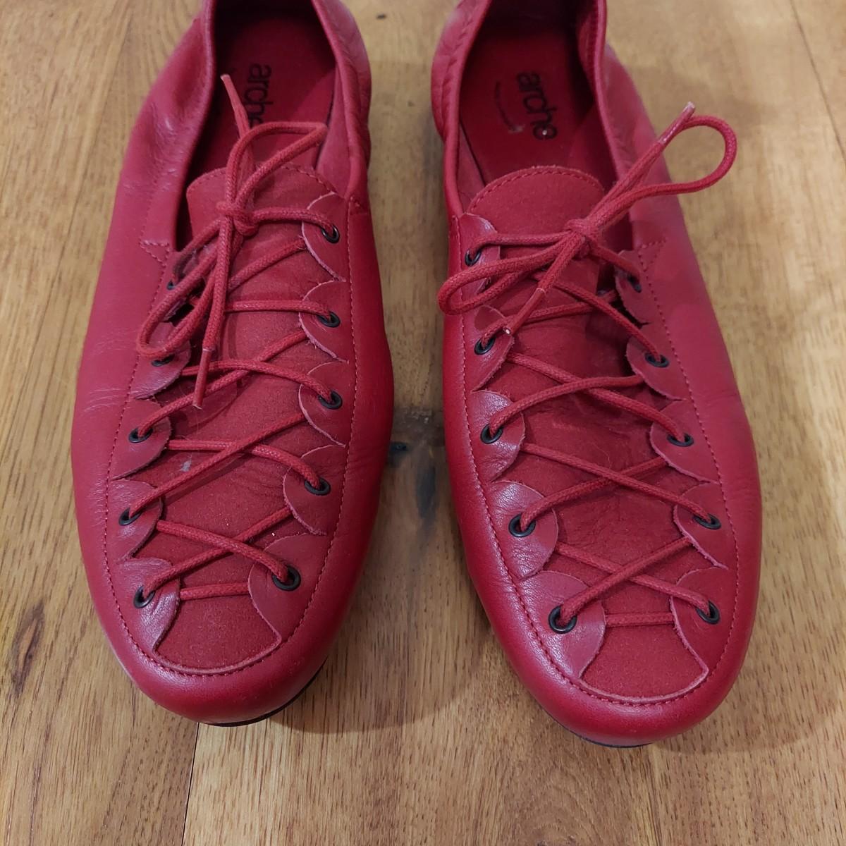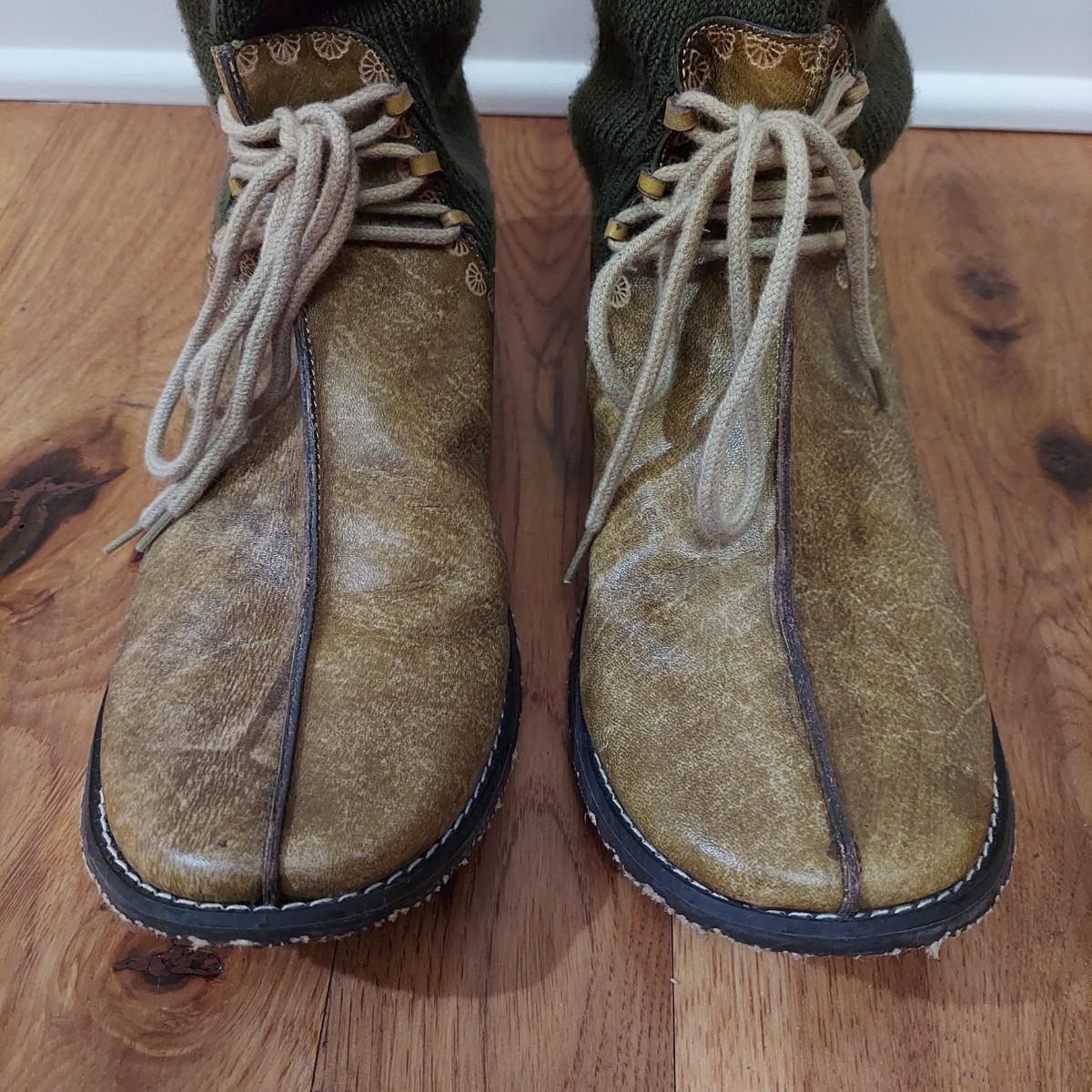 Three pair of Lagenlook style shoes. CYDWOQ brand black pointed toe with 3 straps. These are a size 40. They have a leather upper and sole with a wooden kitten heel. Arche brand red leather lace up flats with rubber sole. These are a size 42. JC brand boots with leather and wool knit upper and rubber sole. They are a size 10. Shipping available.