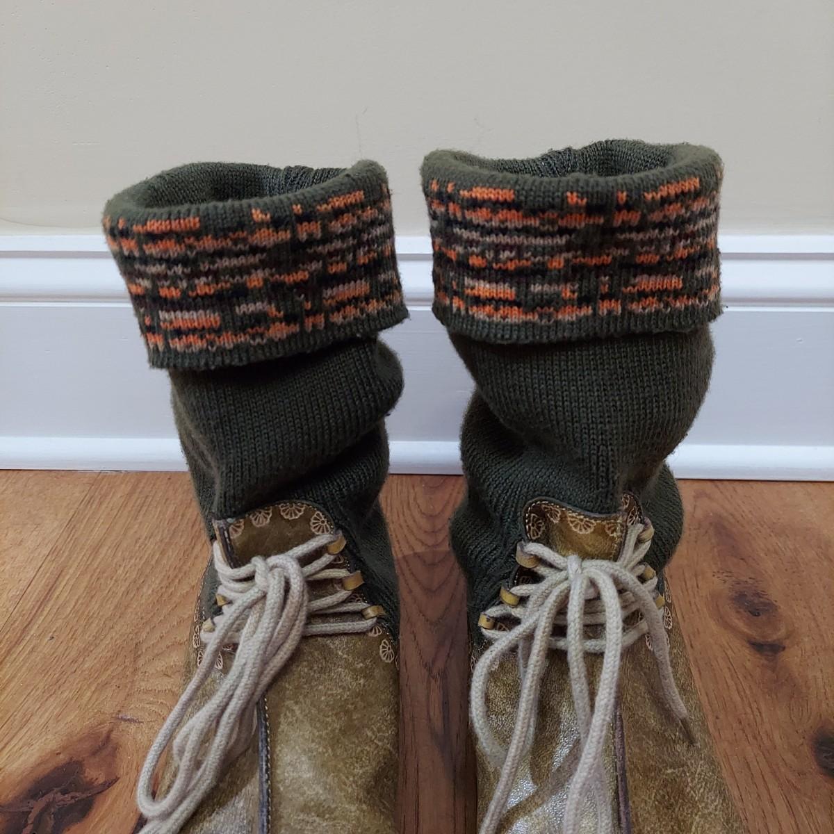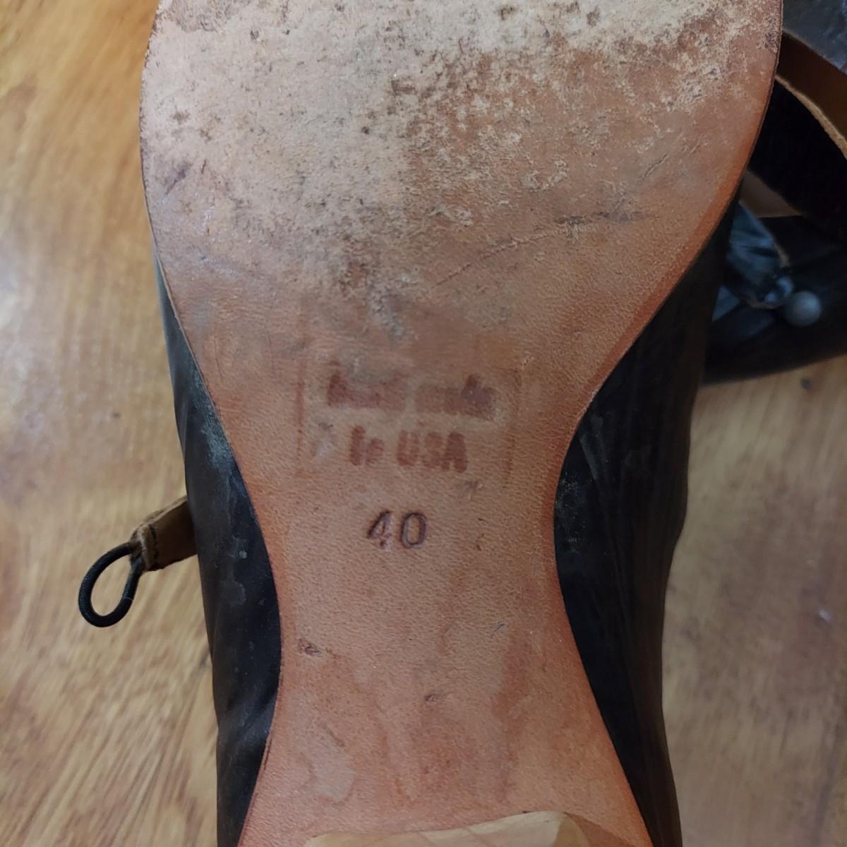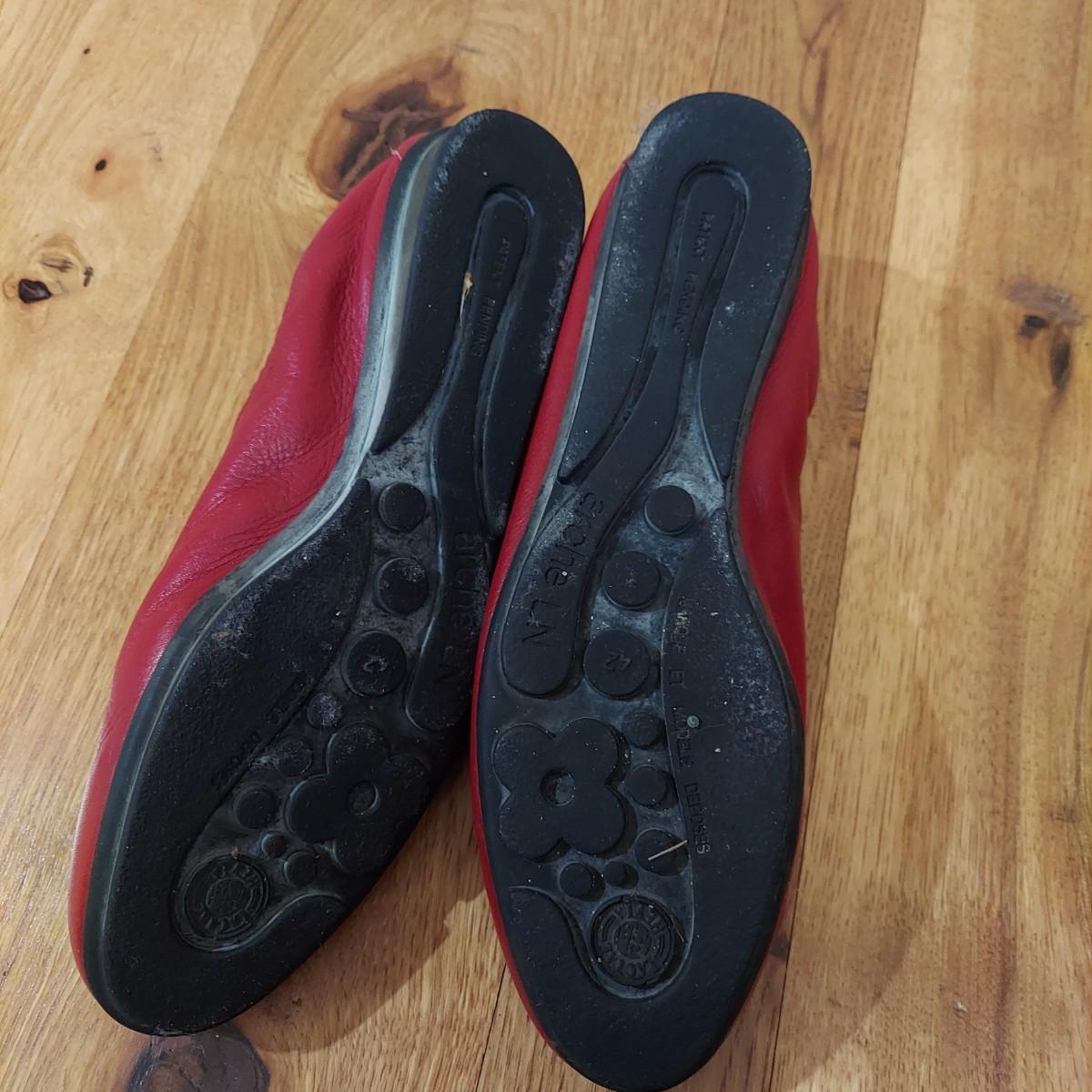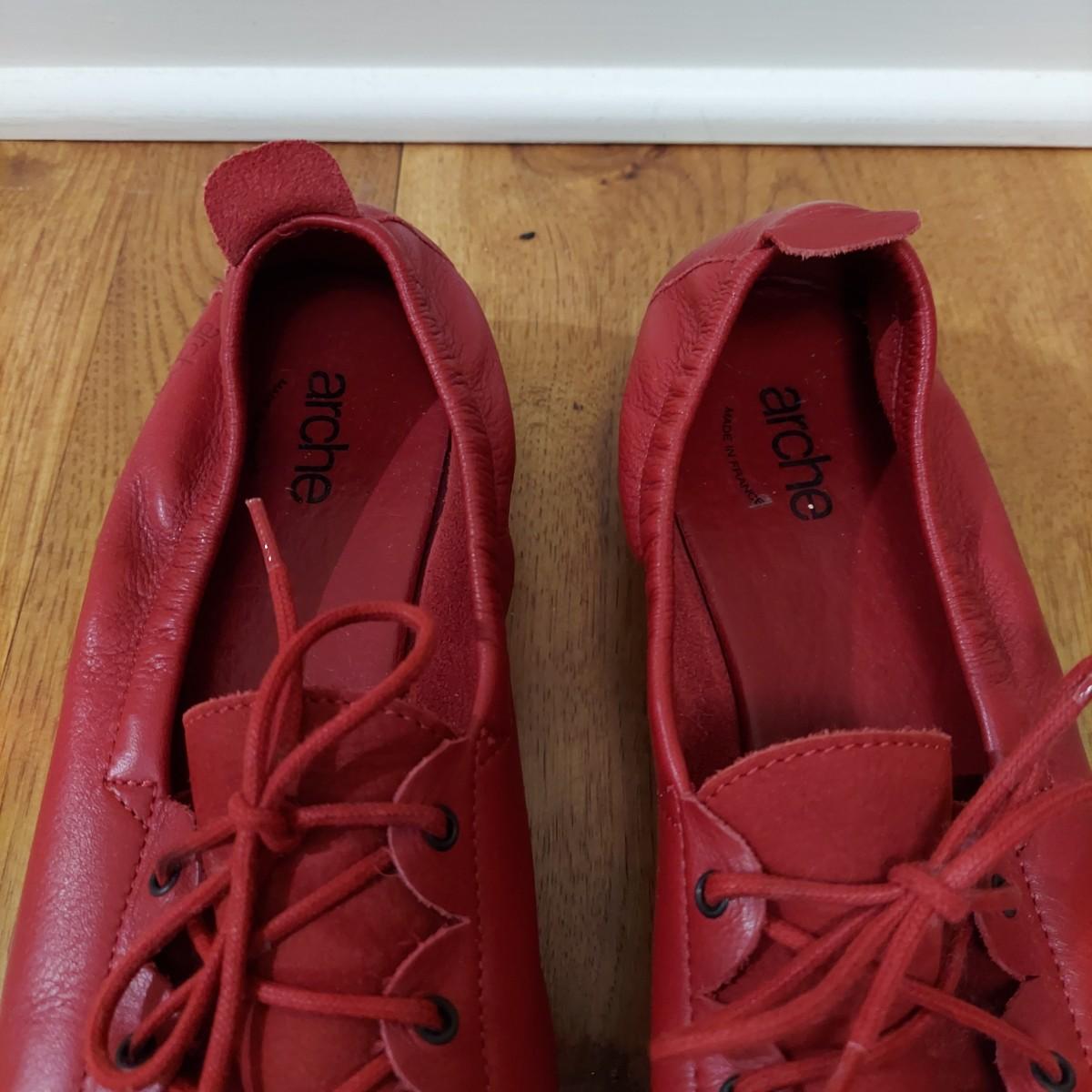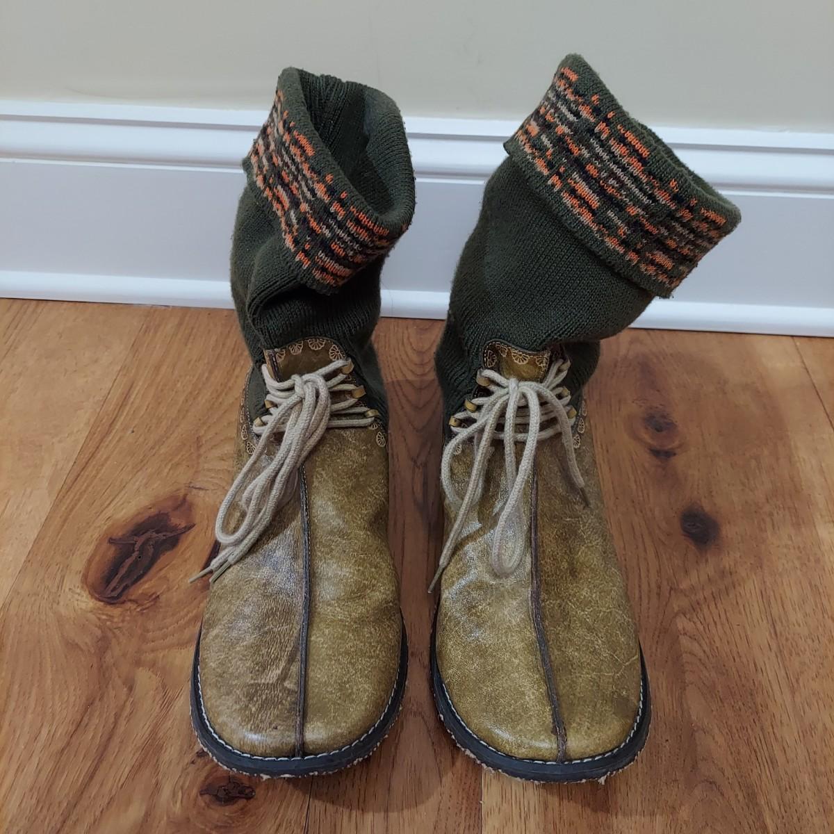 Three pair of Lagenlook style shoes. CYDWOQ brand black pointed toe with 3 straps. These are a size 40. They have a leather upper and sole with a wooden kitten heel. Arche brand red leather lace up flats with rubber sole. These are a size 42. JC brand boots with leather and wool knit upper and rubber sole. They are a size 10. Shipping available.