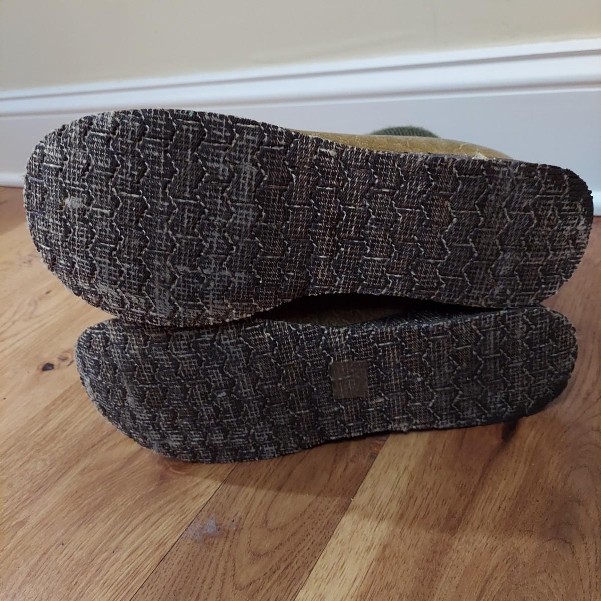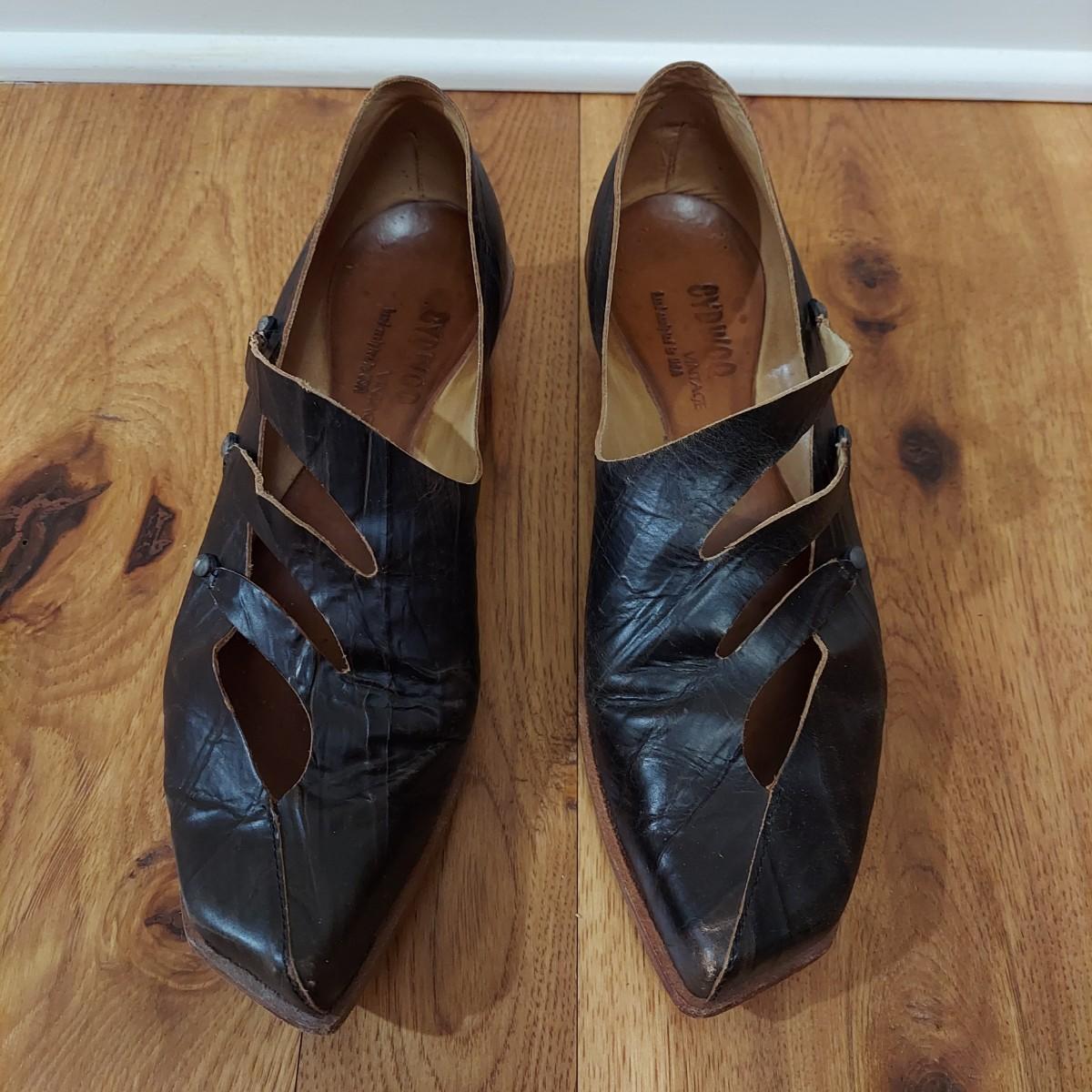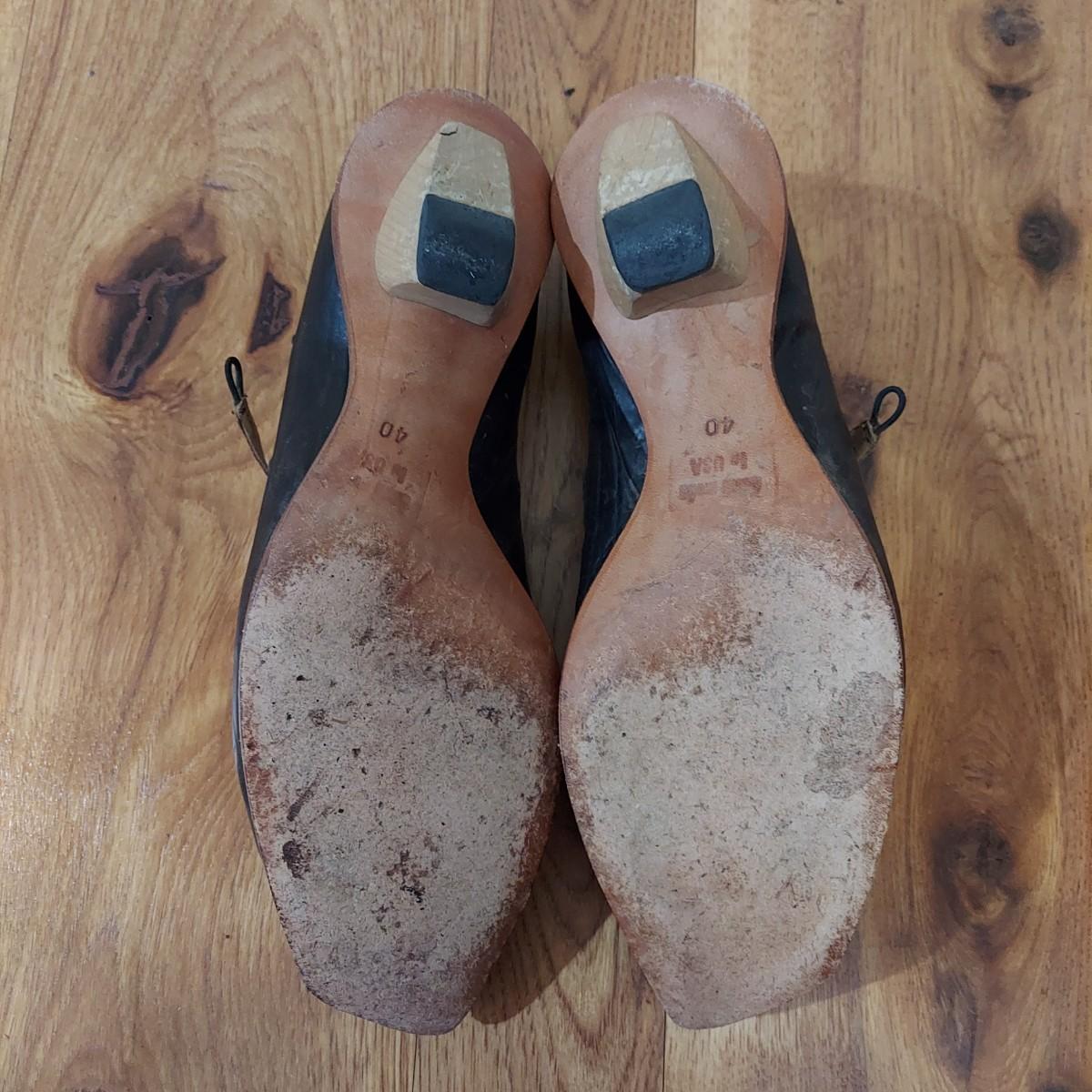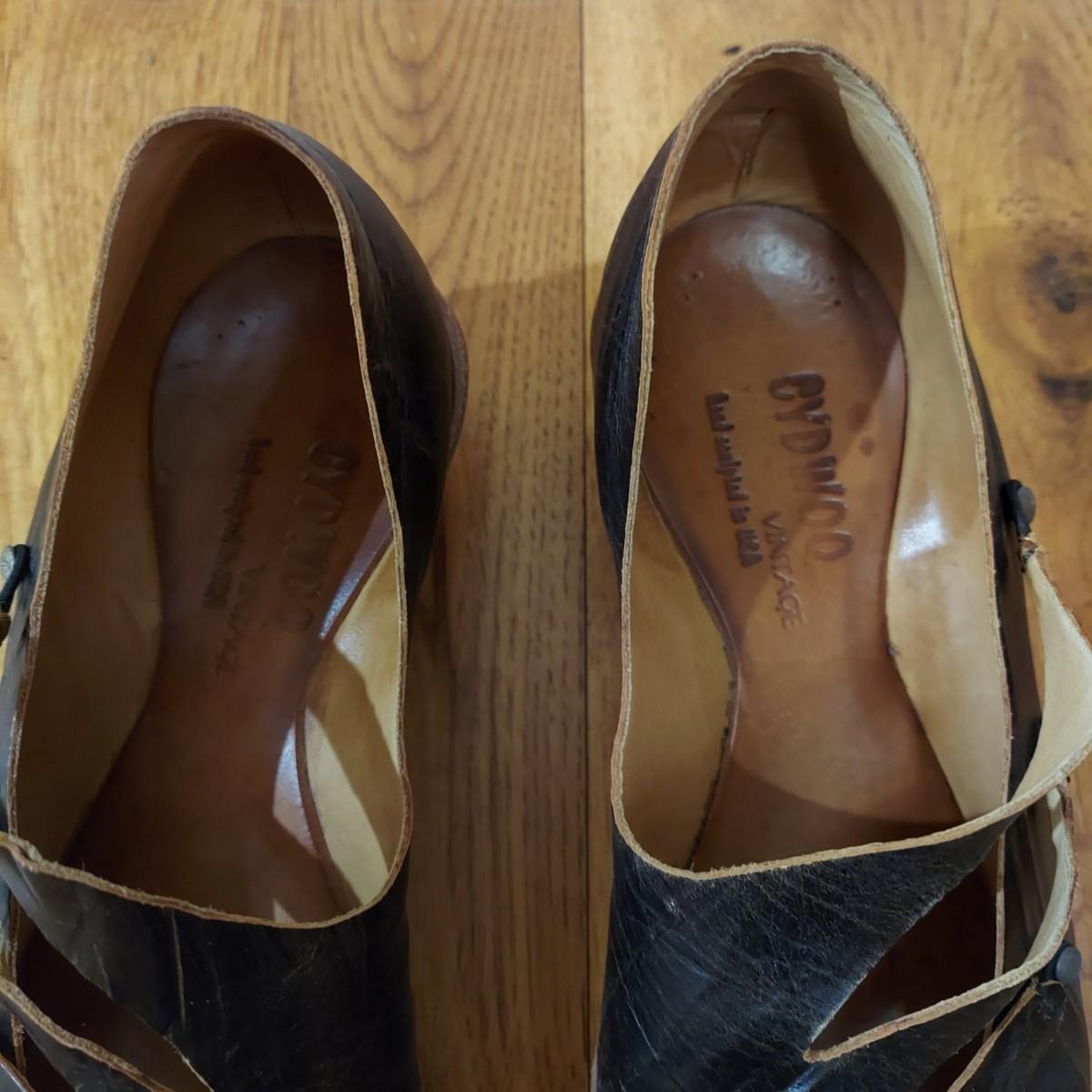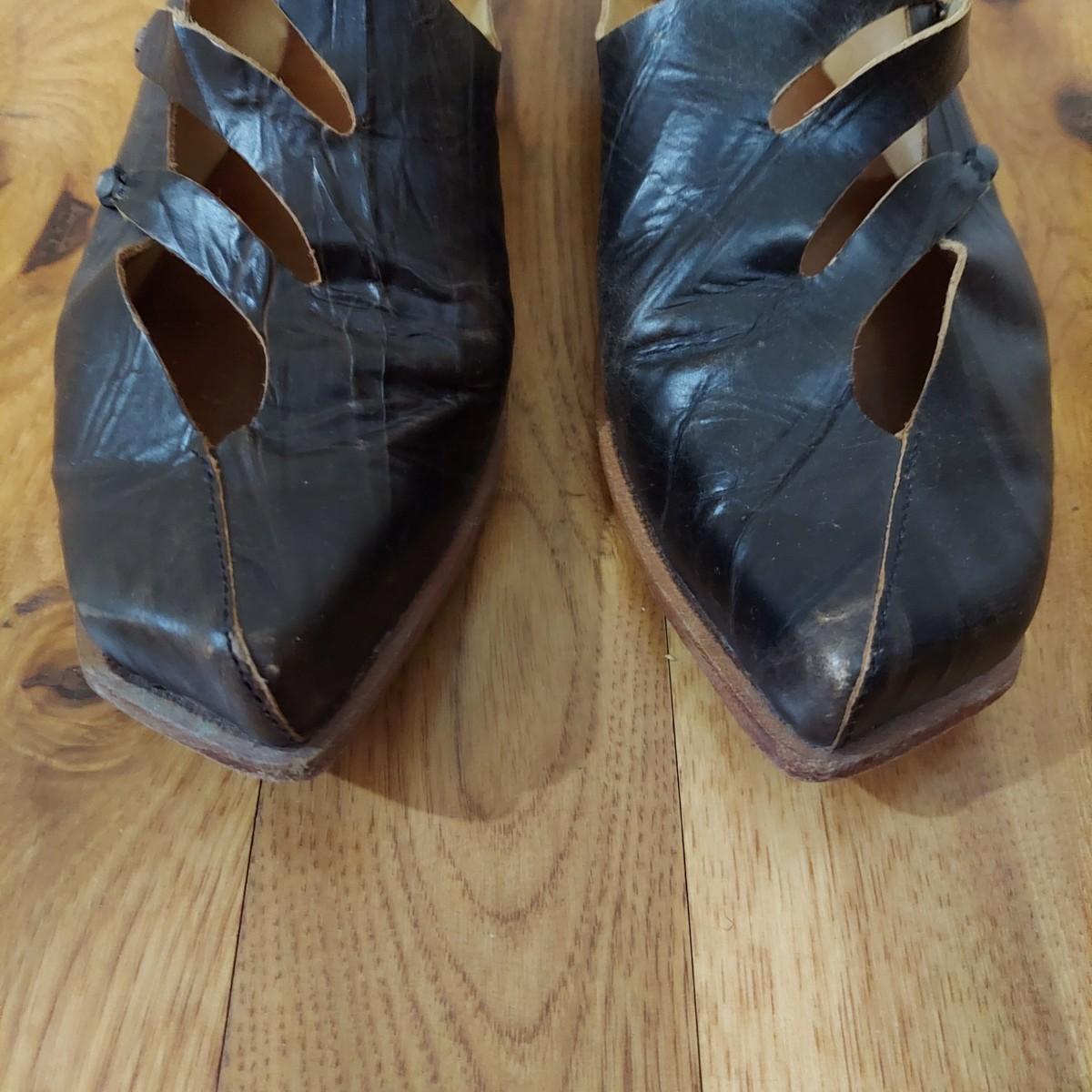 Three pair of Lagenlook style shoes. CYDWOQ brand black pointed toe with 3 straps. These are a size 40. They have a leather upper and sole with a wooden kitten heel. Arche brand red leather lace up flats with rubber sole. These are a size 42. JC brand boots with leather and wool knit upper and rubber sole. They are a size 10. Shipping available.