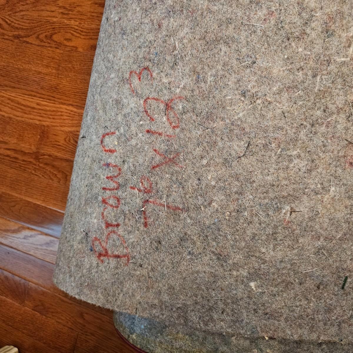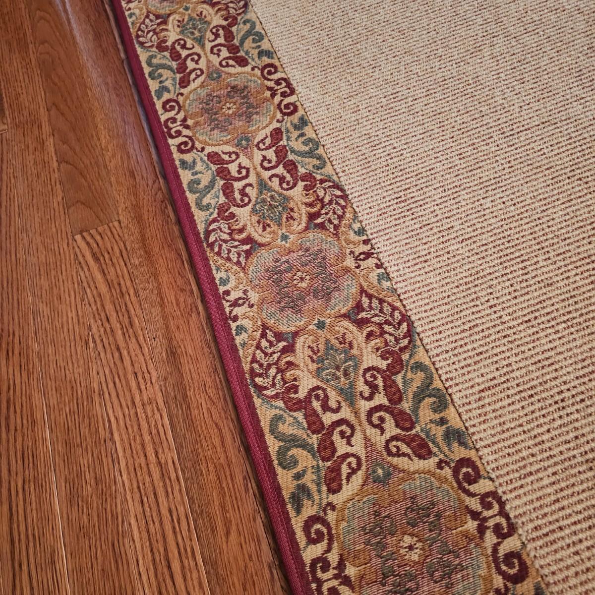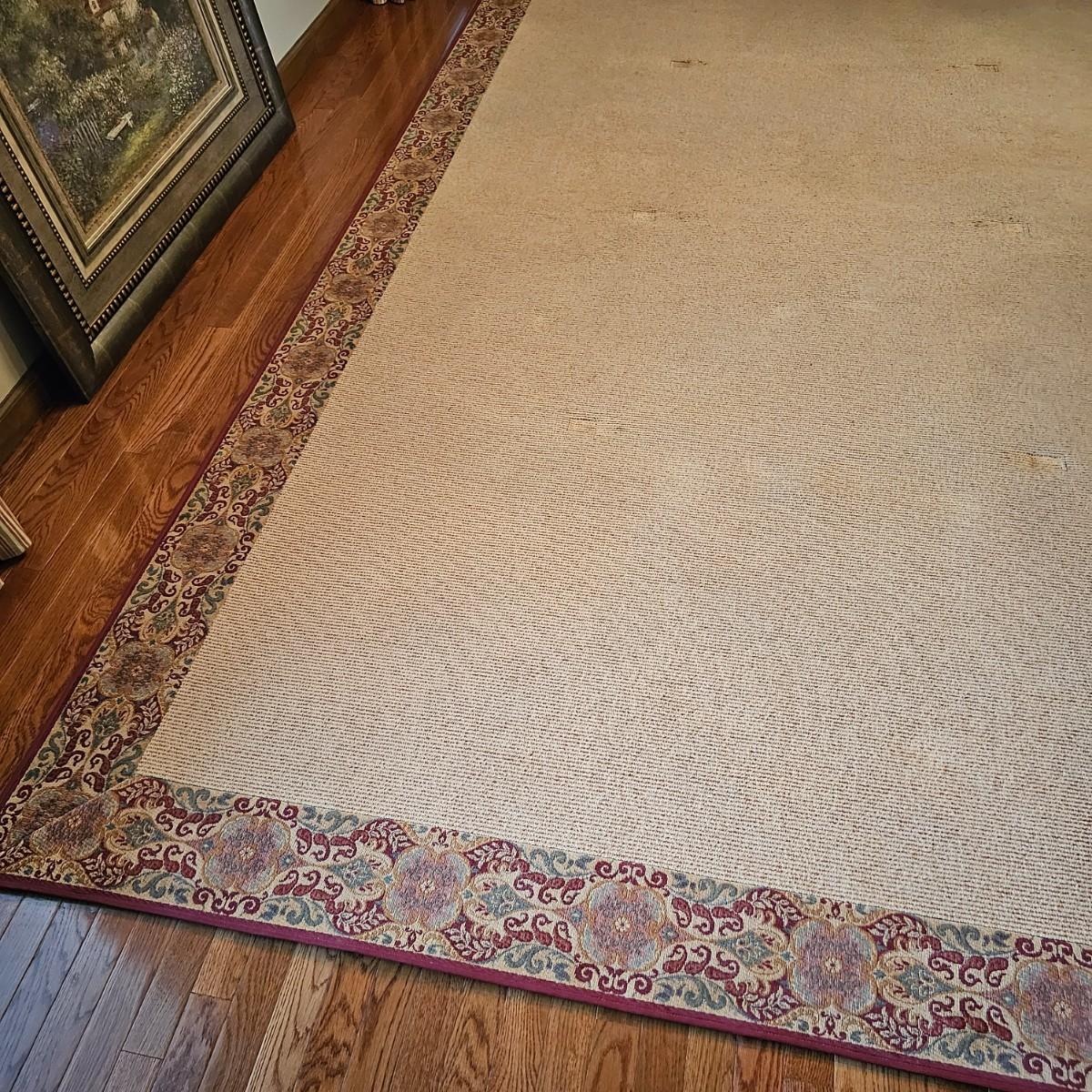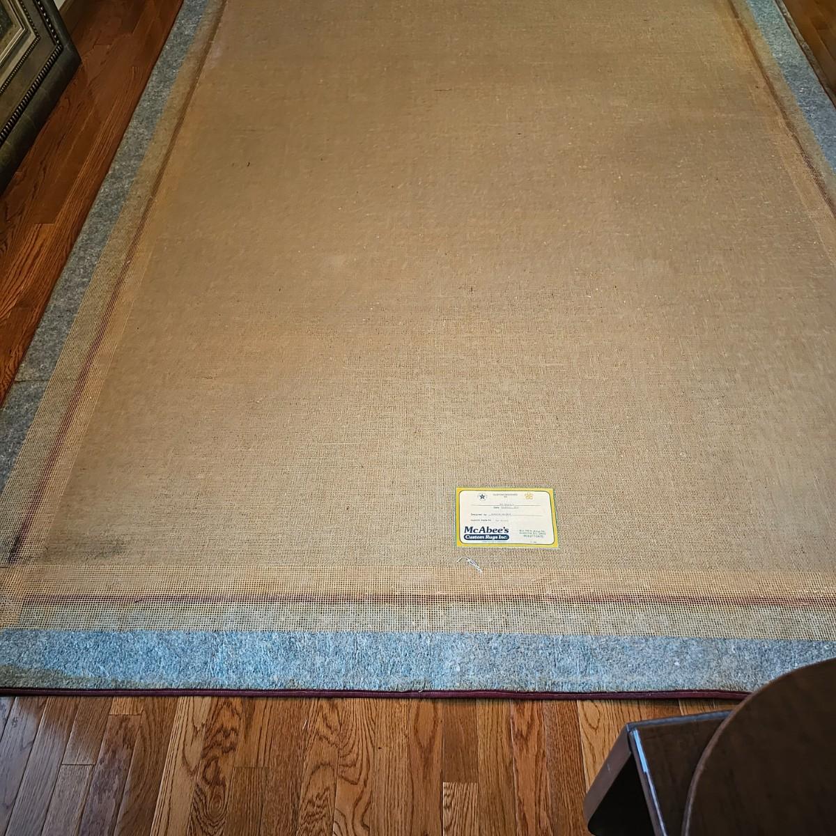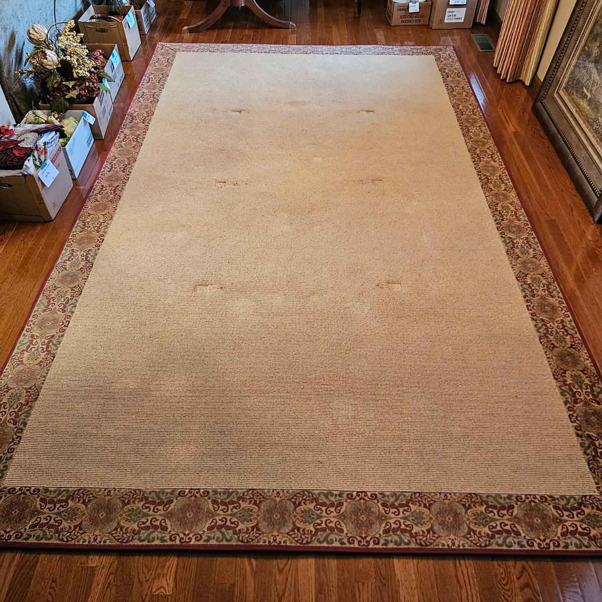 Tan with red/brown bordered edges. According to the tag, this rug was custom made in Greenville S.C. by McAbee. Rug has floral accents with green, red and gold, measures 12'3" x 7'6". Bottom of border has attached non skid material and rug also comes with full pad. Rug has some indentations from where furniture has sat on it. See photos for details. Local pickup only.