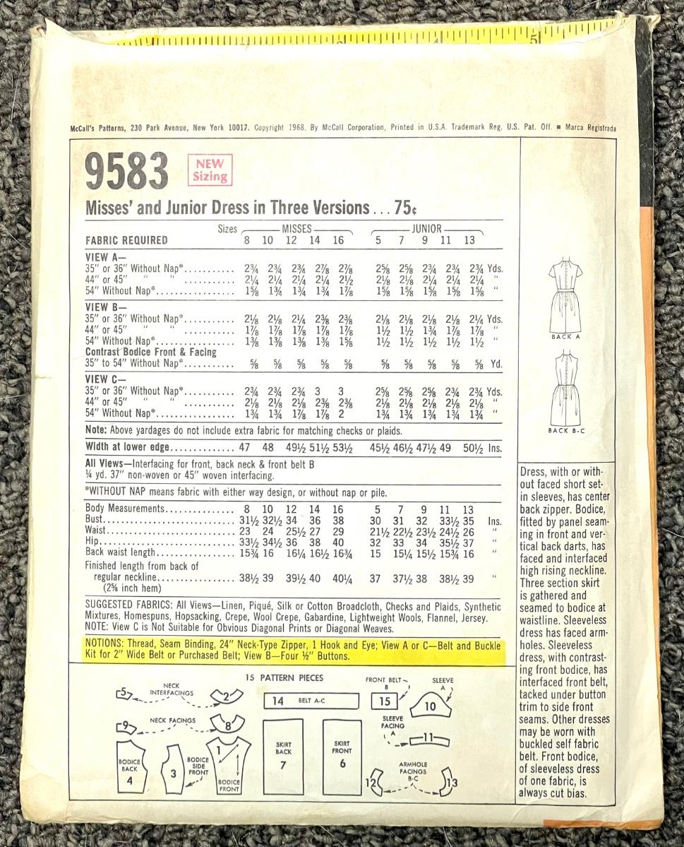 McCall’s Misses’ and Junior Dress in Three Versions No. 9583 size 9 bust 32 1968. All pieces included.