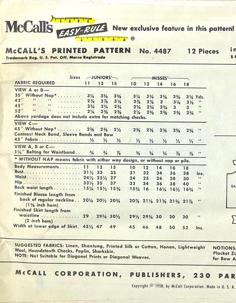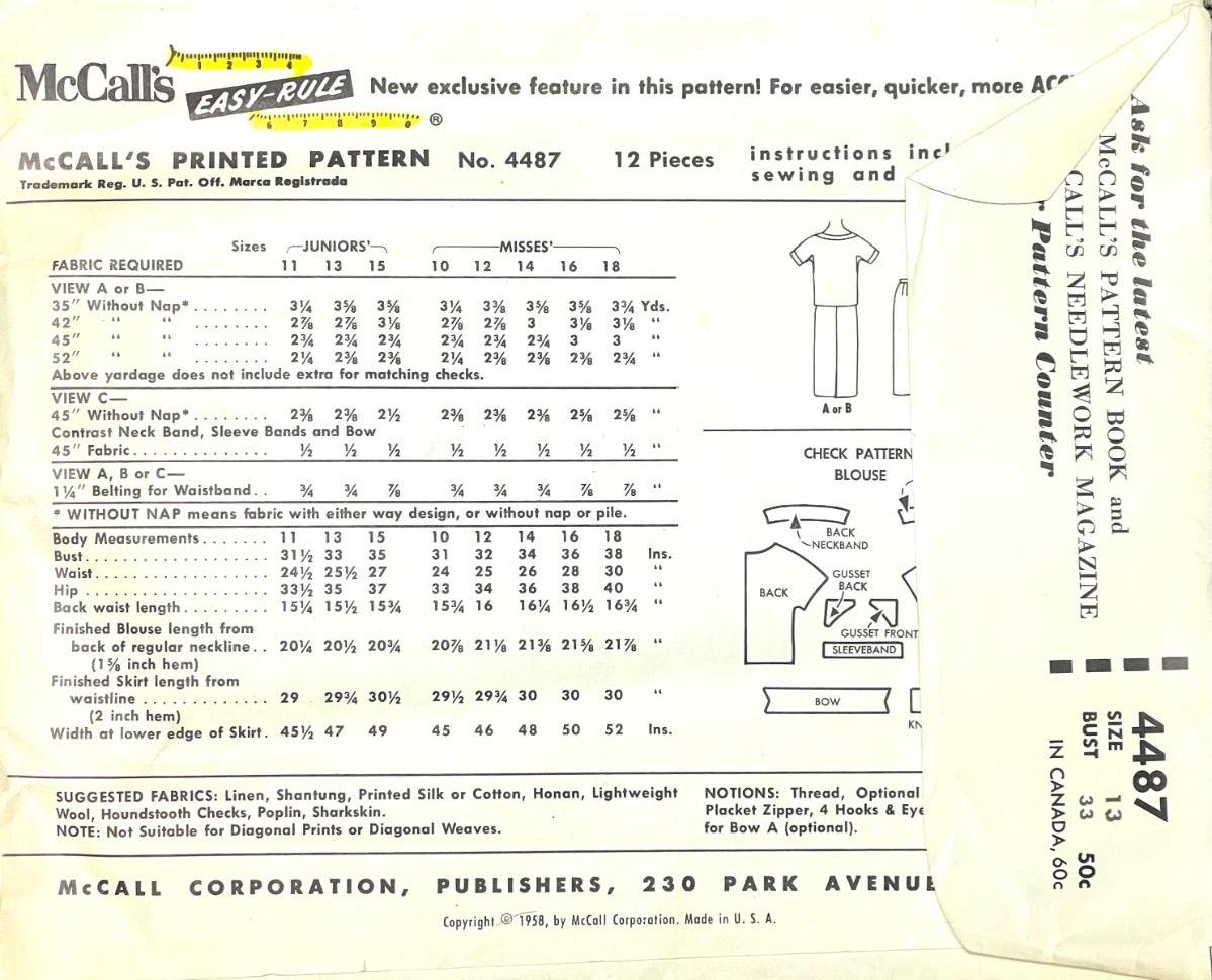 McCall’s Misses’ and Junior Overblouse and Skirt No. 4487 size 13 bust 33 1958. All pieces verified.