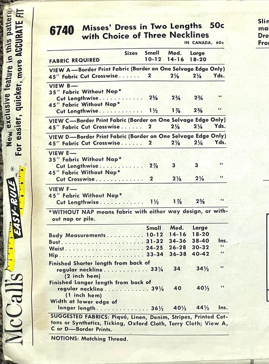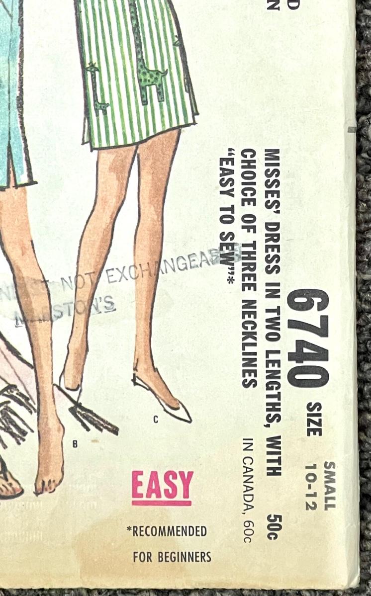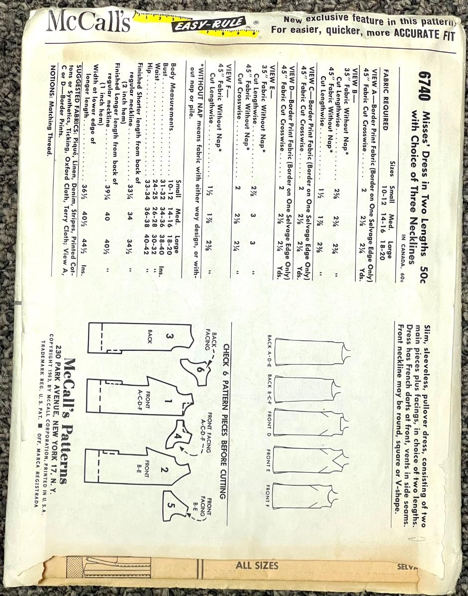 McCall’s Misses’ Dress in Two Lengths, with Choice of Three Necklines “Easy to Sew” No. 6740 size small 10-12 1963. All pieces verified.